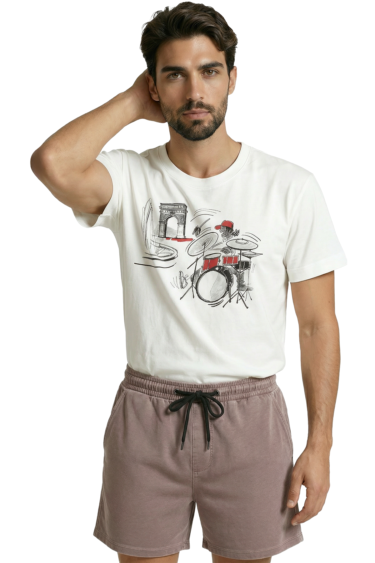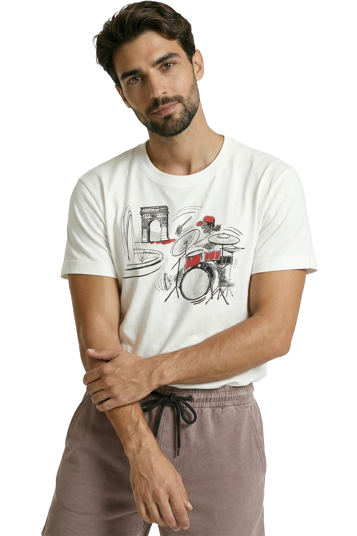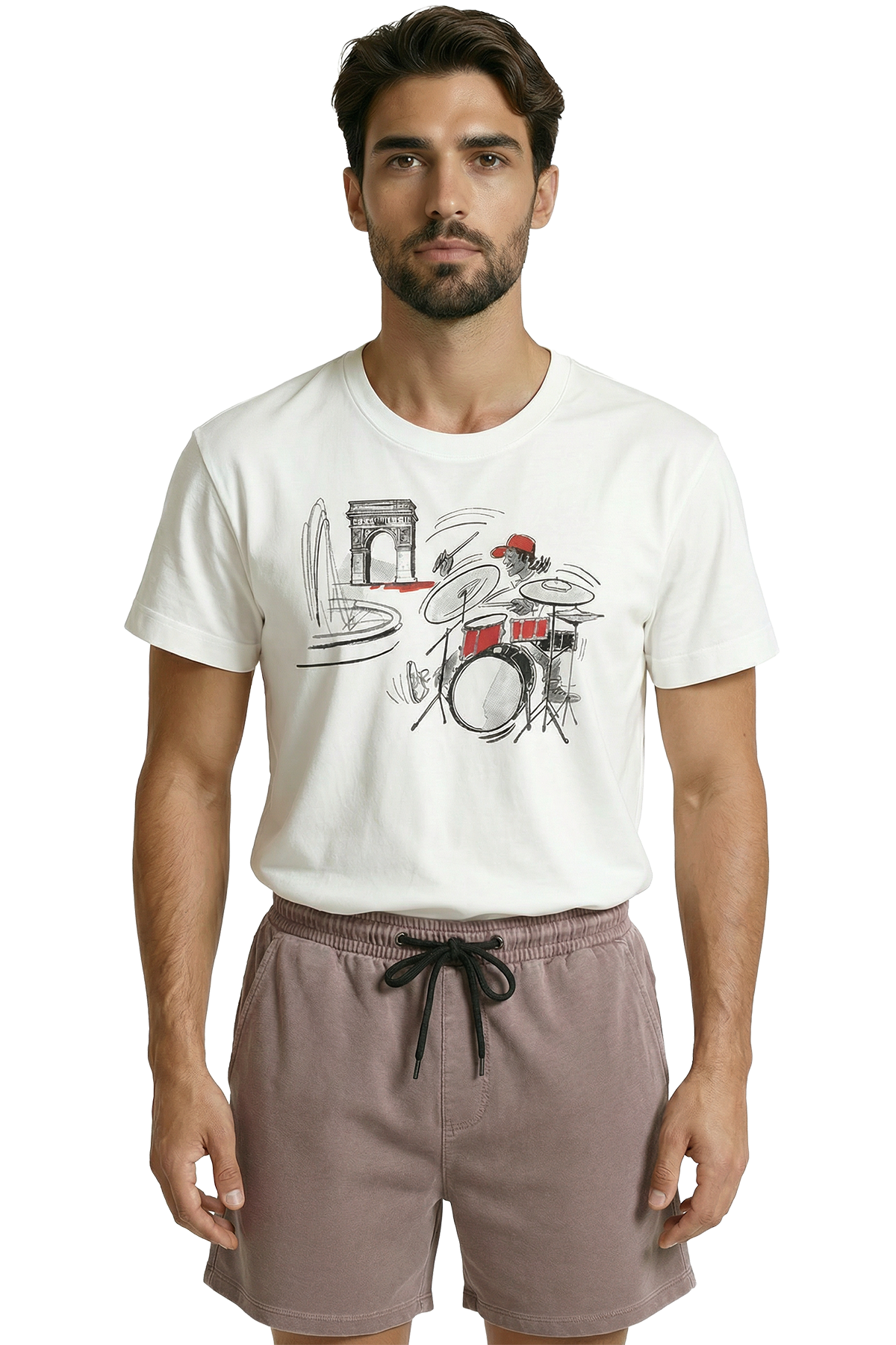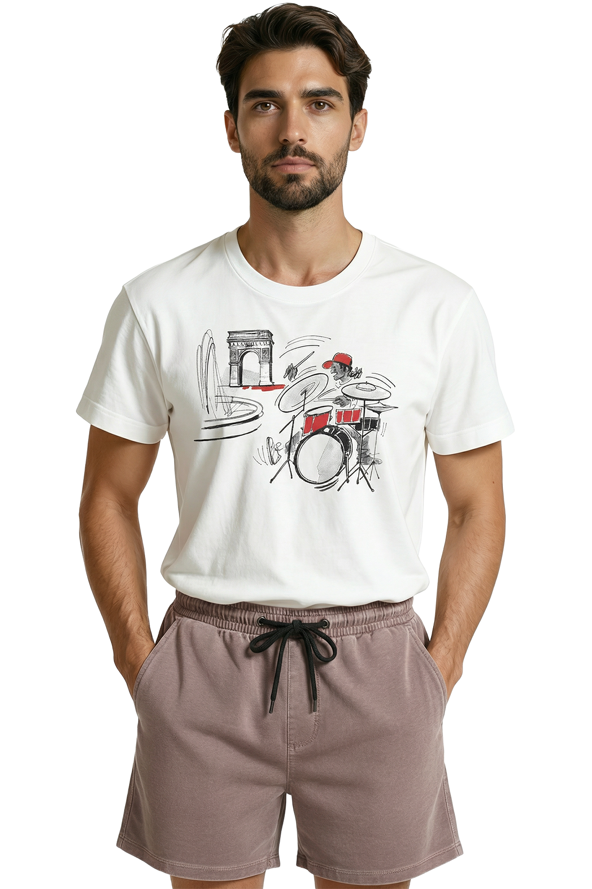 Şehrin kalbi sokakta atar, ritmi ise müzisyenler belirler. Paris'in ikonik simgesi Zafer Takı (Arc de Triomphe) manzarasında, kendini müziğin akışına bırakmış bir sokak müzisyenini betimleyen bu tasarım; enerjiyi ve sanatı göğsünüze taşıyor. Kırmızı şapkası ve davullarıyla dikkat çeken baterist figürü, siyah-beyaz eskiz arka planla harika bir kontrast oluşturuyor. Hem seyahat tutkunları hem de müziğin ritminden kopamayanlar için, ruhu olan bir parça.