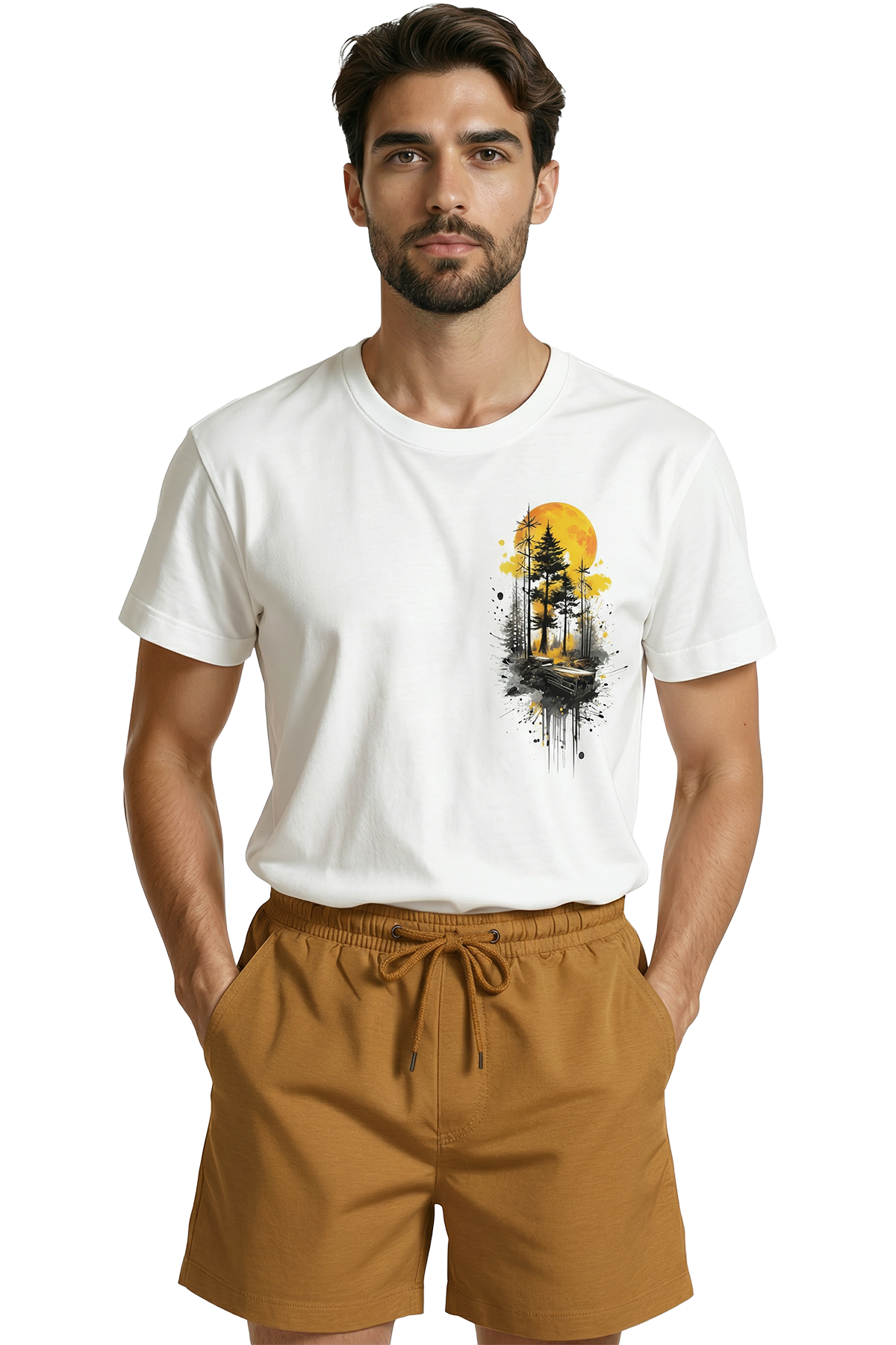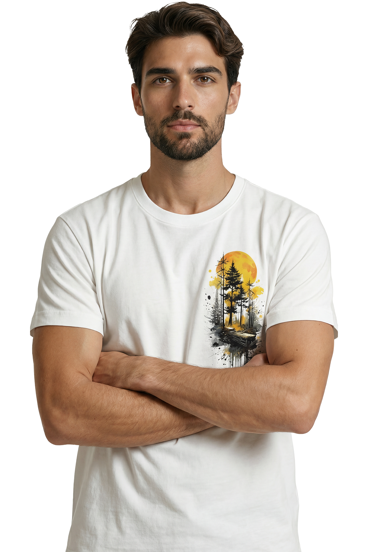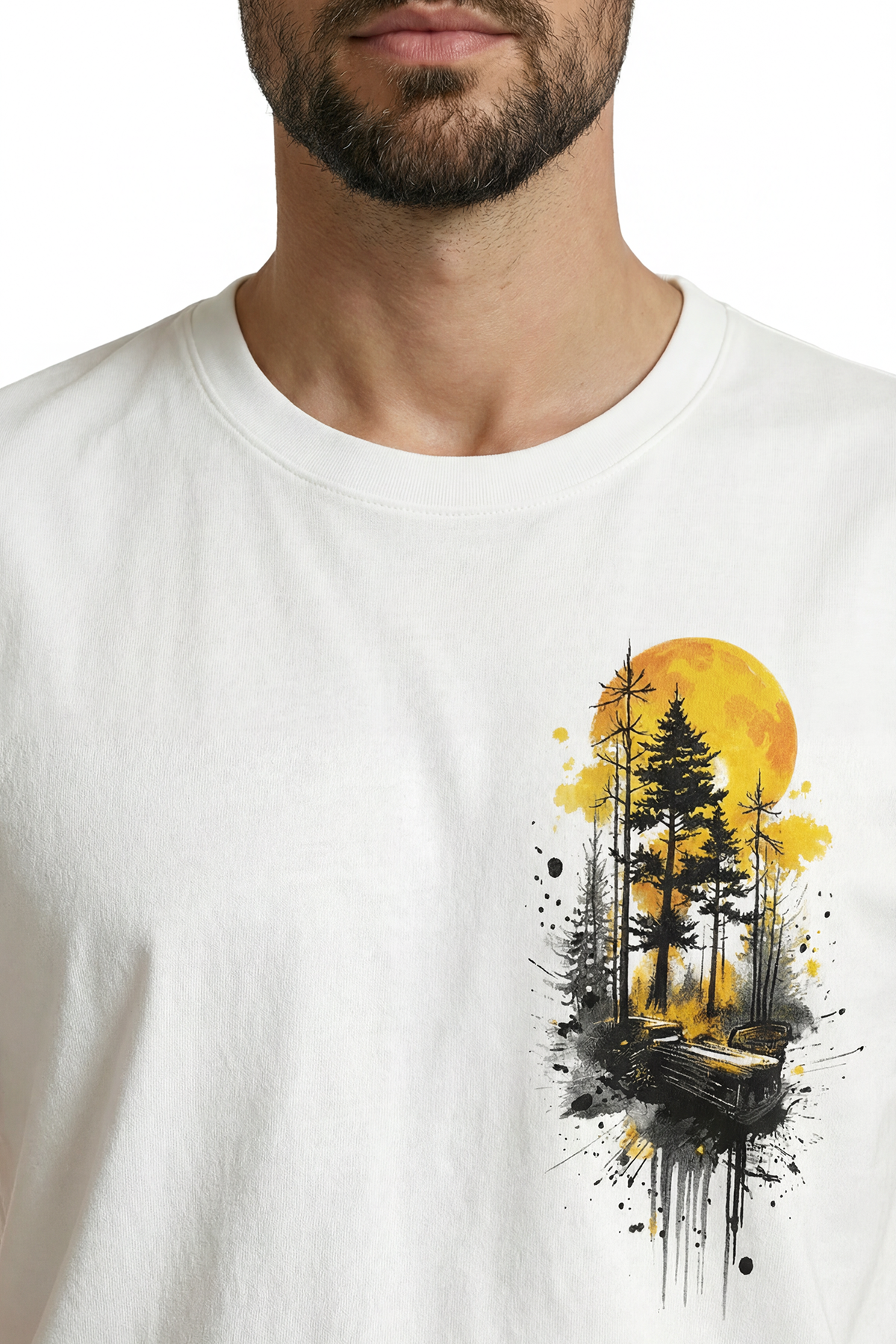 Şehrin griliğinden uzaklaşıp, ormanın derinliklerinde gün batımını izlediğiniz o büyülü anı üzerinizde taşıyın. Çam ağacı silüetlerinin, sıcak bir güneş (veya dolunay) fonuyla buluştuğu bu tasarım; sulu boya ve mürekkep sıçratma (splatter) teknikleriyle modern bir sanat eserine dönüşüyor. Doğaya kaçışı, özgürlüğü ve huzuru simgeleyen bu tişört; hem outdoor tutkunları hem de estetik tasarımları seven erkekler için vazgeçilmez bir parça.