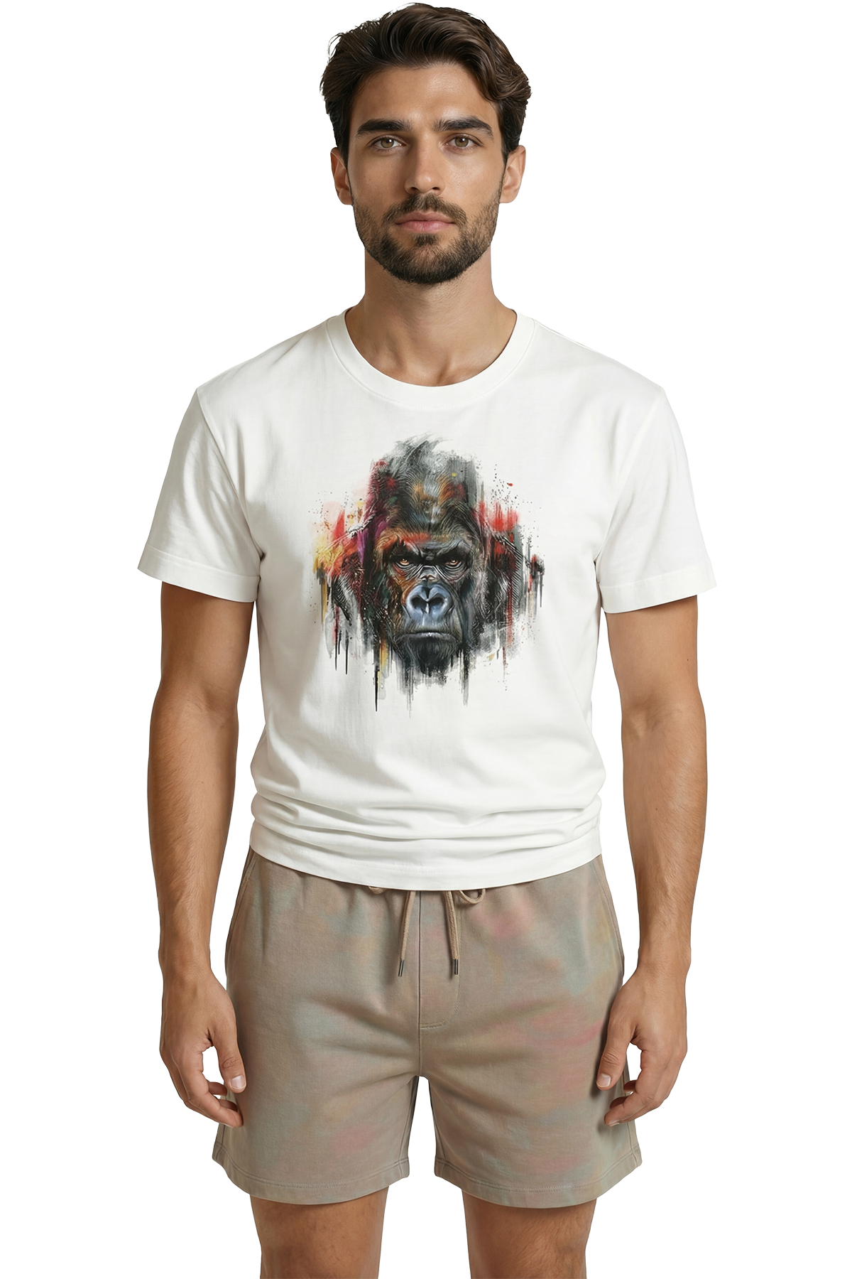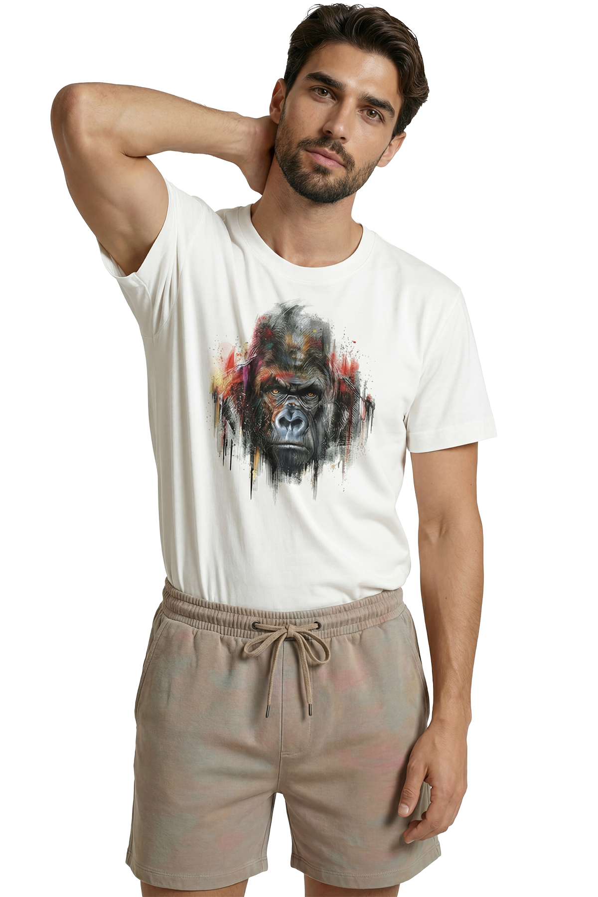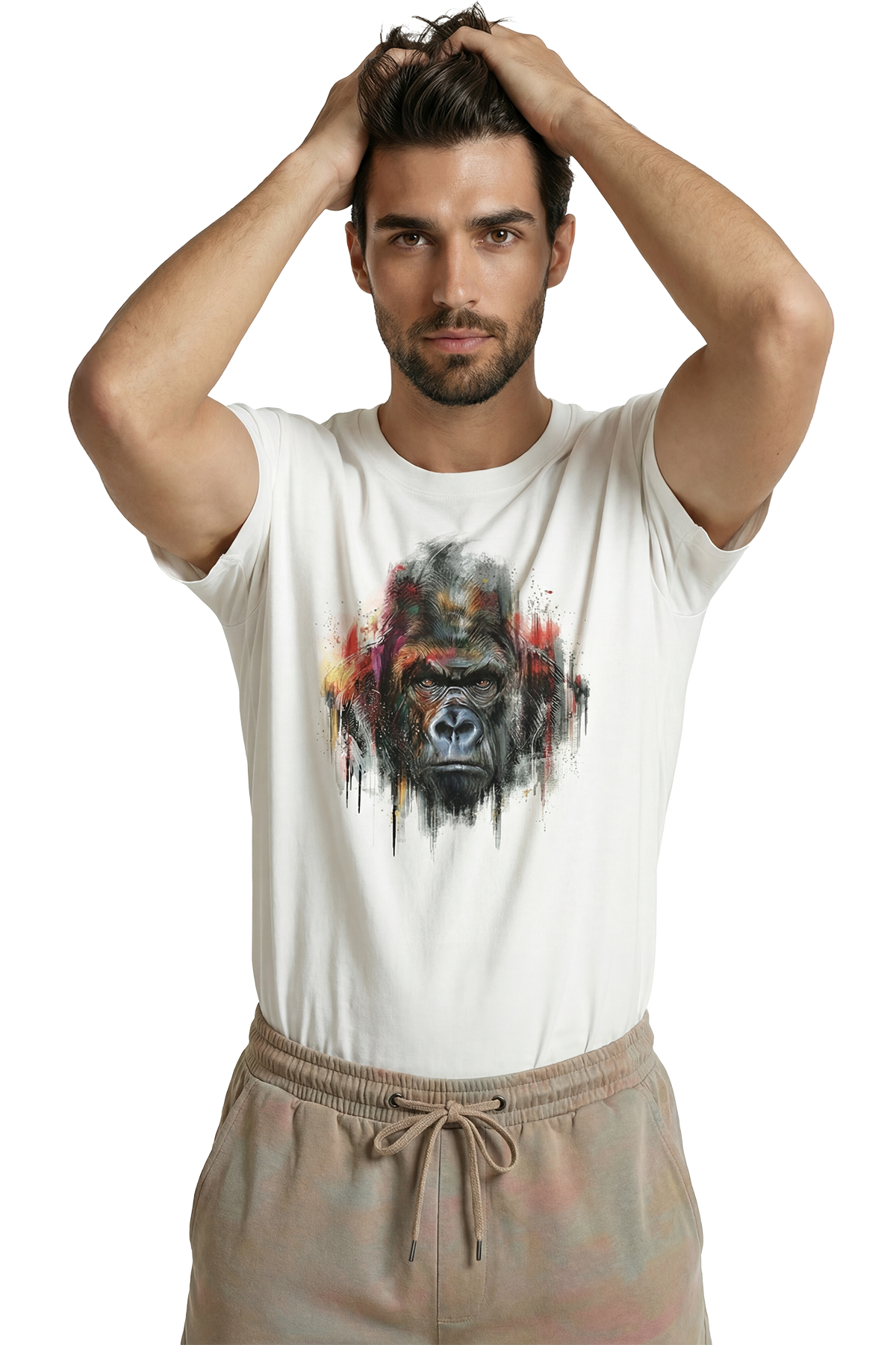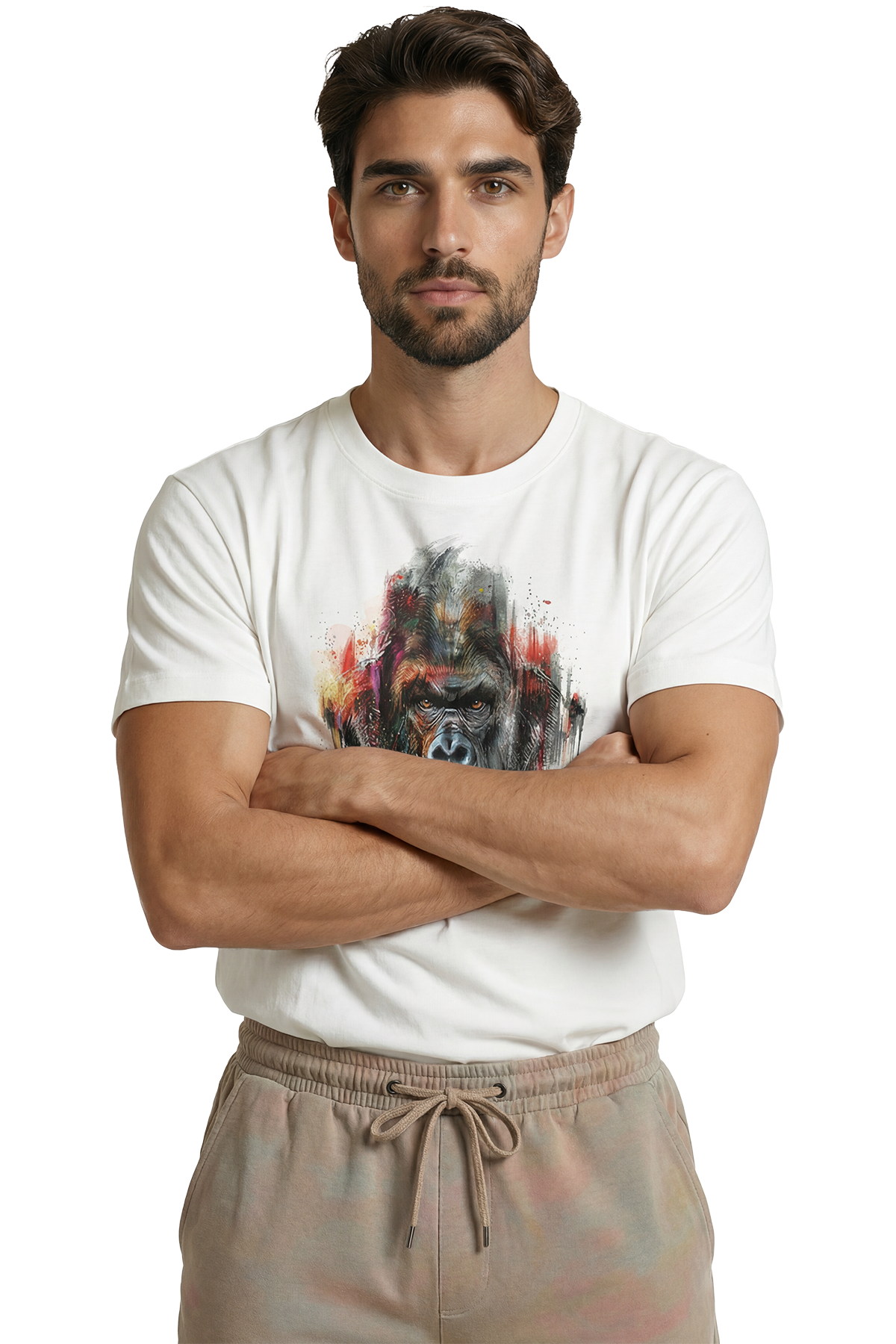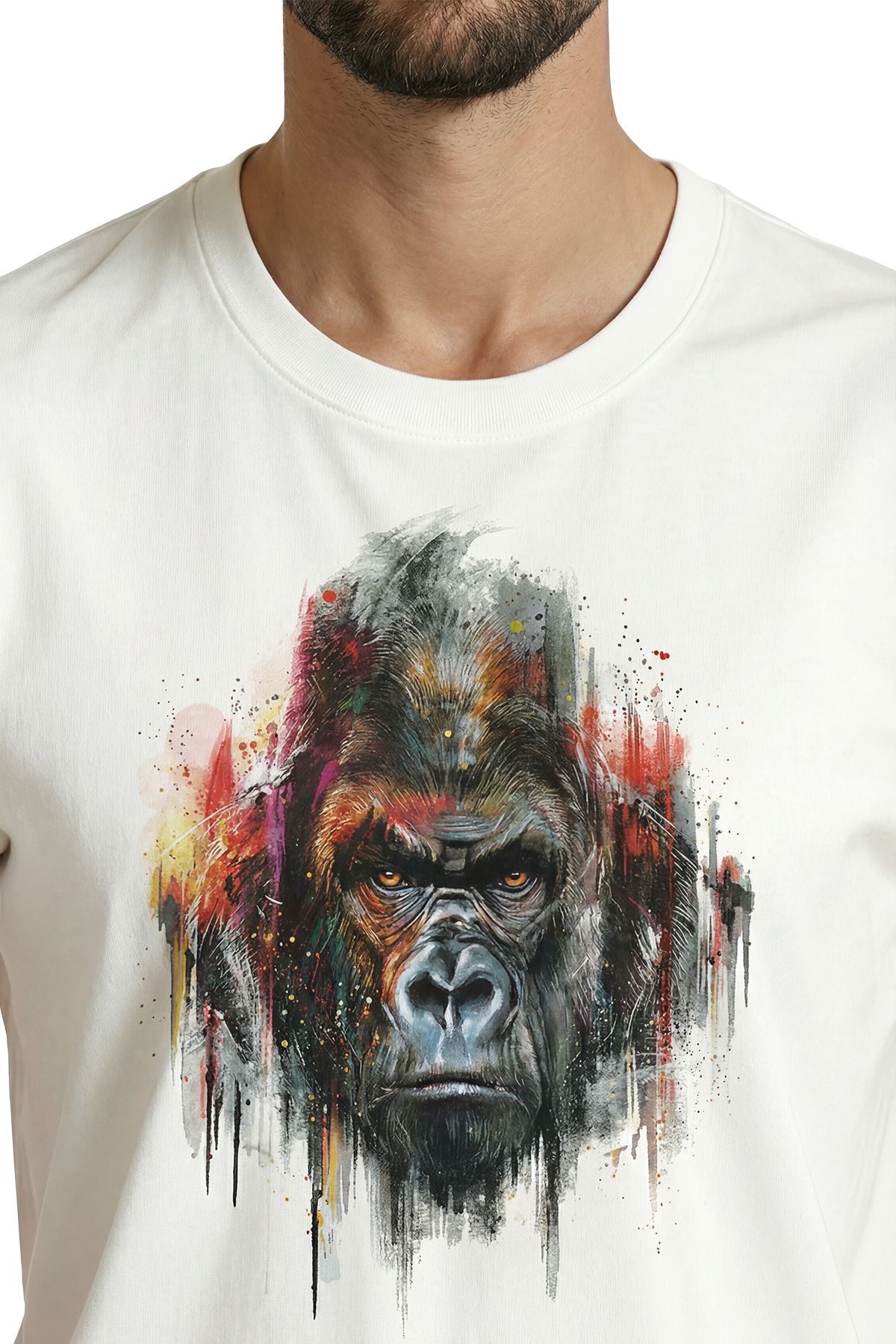 Sanatsal Baskı (DTG): "Yapıştırma" hissi veren naylon baskıları unutun. Kullandığımız son teknoloji DTG (Direct to Garment) yöntemiyle boya, kumaş liflerine işler. Bu sayede, gorilin yüzündeki ince detaylar ve renkli boya efektleri kumaşla bütünleşir, baskı hava alır ve plastik hissi vermez.