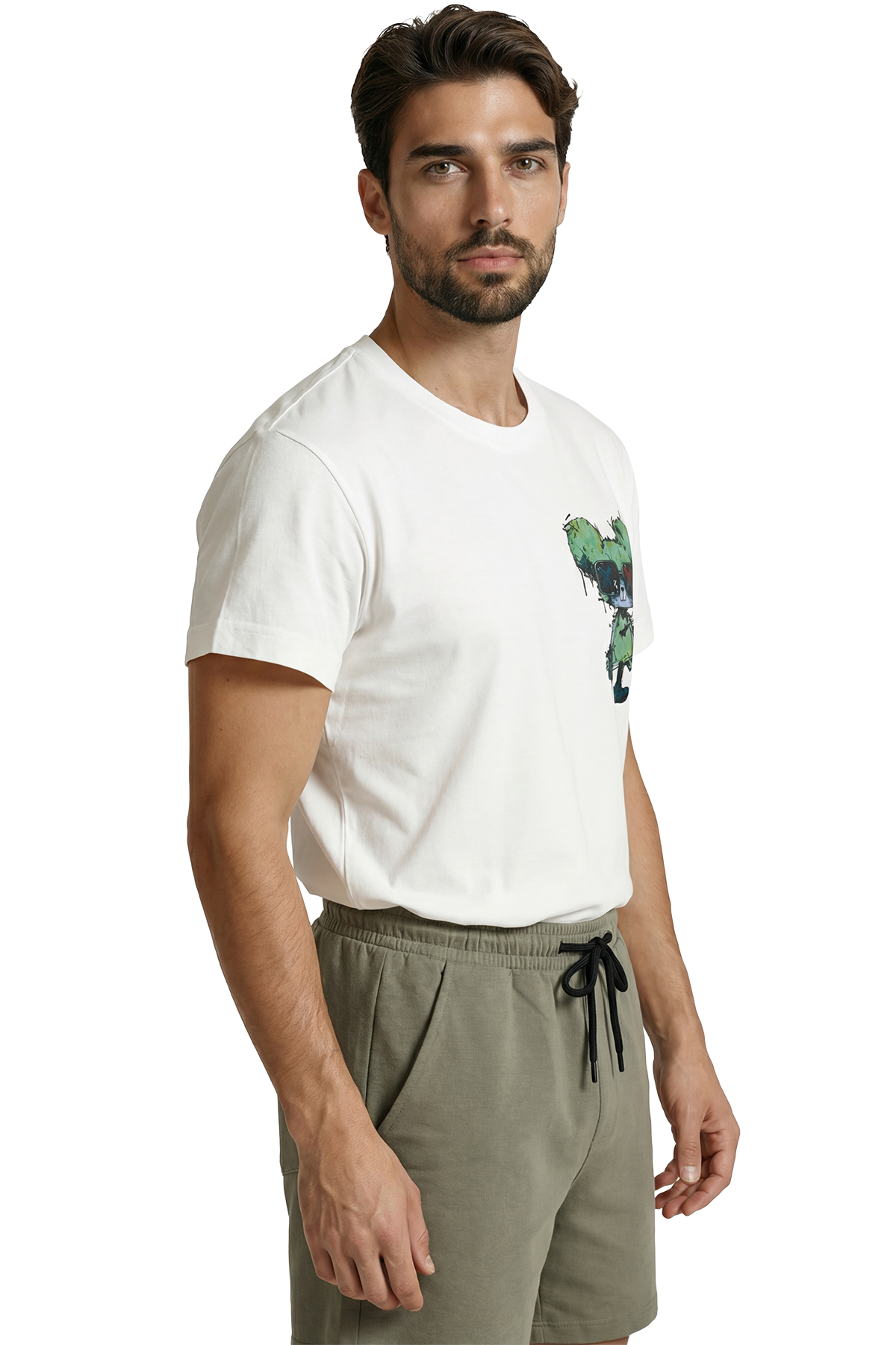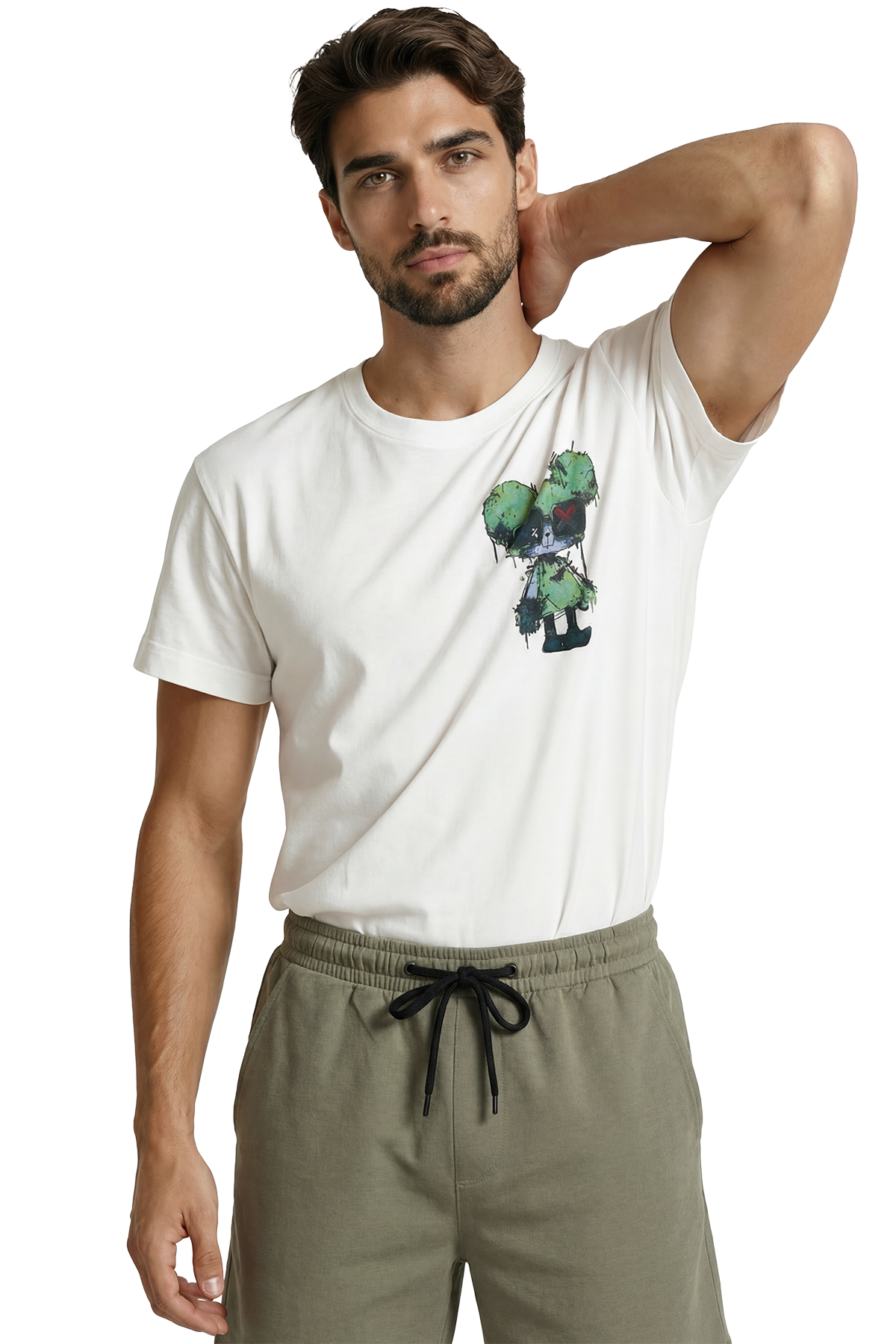 Sanatsal Baskı (DTG): "Yapıştırma" hissi veren naylon baskıları unutun. Kullandığımız son teknoloji DTG (Direct to Garment) yöntemiyle boya, kumaş liflerine işler. Bu sayede, ayıcık figürünün canlı yeşil tonları ve eskitme efektleri kumaşla bütünleşir, baskı hava alır ve plastik hissi vermez.