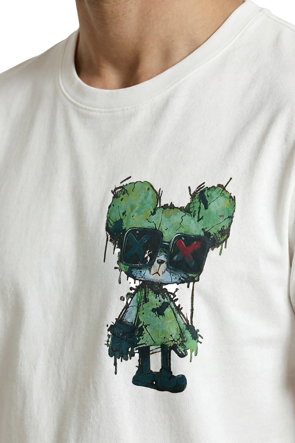 Sıradan ayıcık figürlerini unutun; sokağın kurallarını koyan bu karakterle tanışın! Graffiti sanatının dağınık ve özgür ruhunu yansıtan bu tasarım; gözlükleri, "X" detaylı bakışları ve üzerindeki yeşil boya efektleriyle (drip effect) "Hypebeast" modasına göz kırpıyor. Hem eğlenceli hem de "cool" bir duruş sergileyen bu tişört; sokak stiline, popüler kültüre ve tasarımcı oyuncaklarına ilgi duyan erkekler için gardırobun en dikkat çekici parçası olmaya aday.