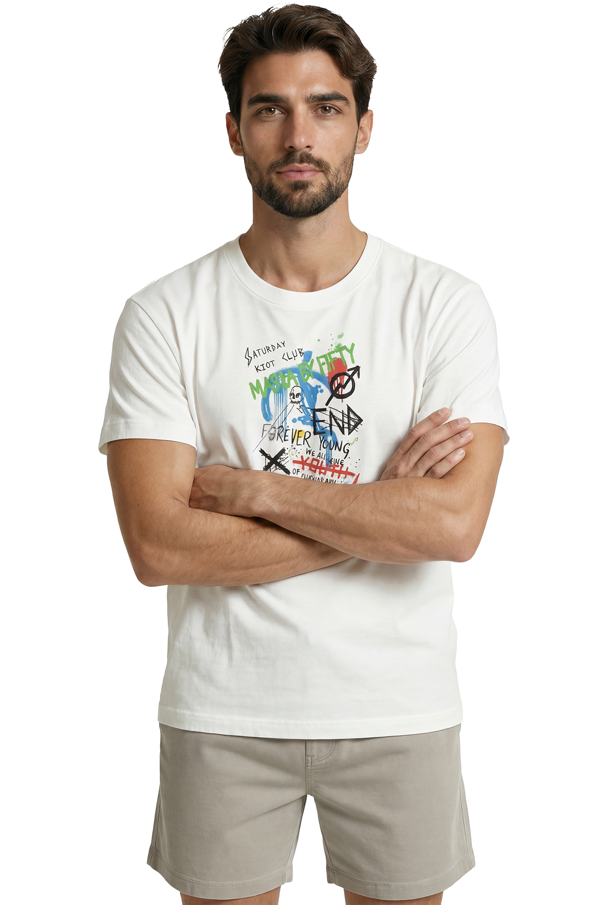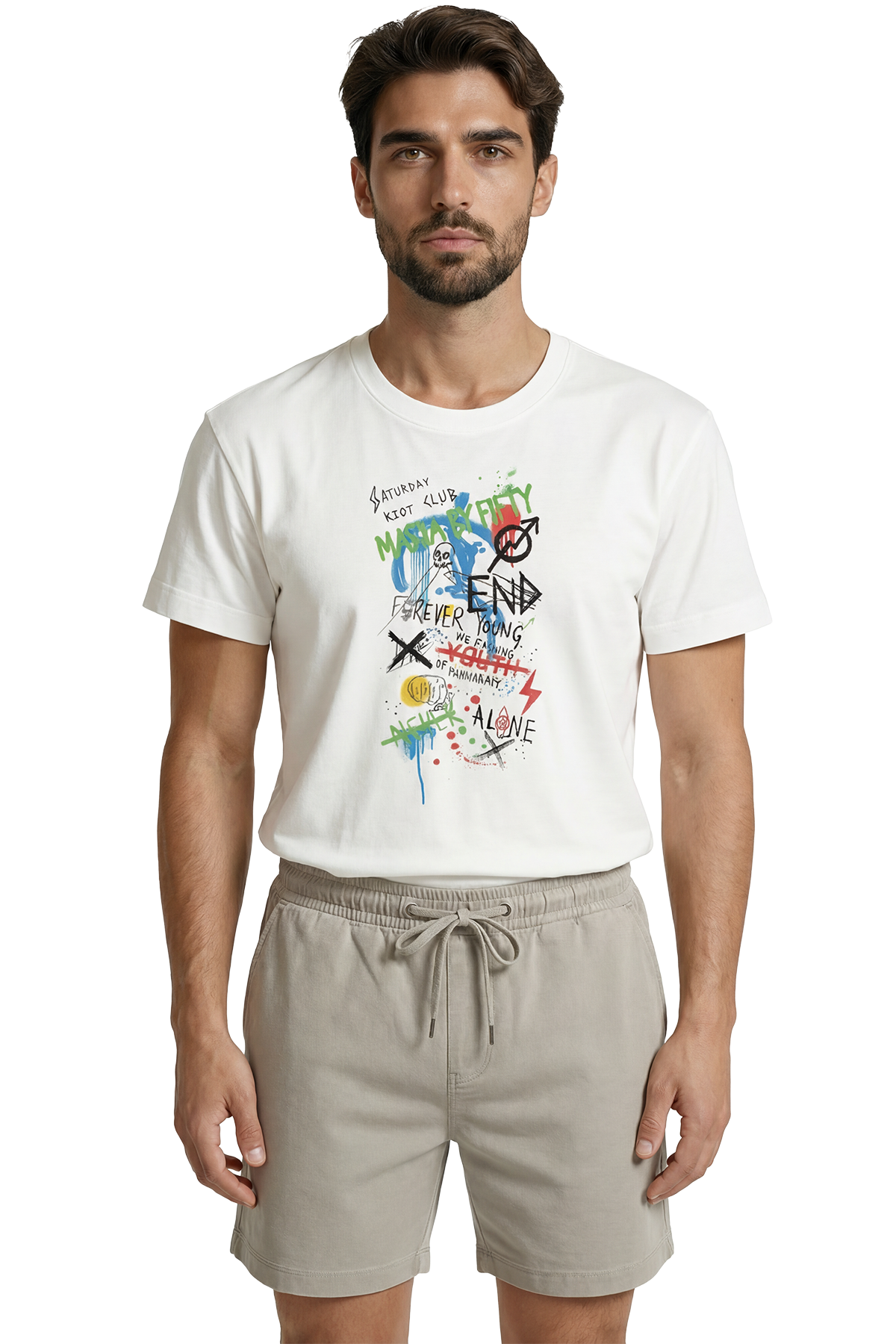 Kuralları yıkan, enerjisi hiç bitmeyen ve ruhu hep genç kalanlar için tasarlandı. "Forever Young" (Daima Genç) mottosunu; sokak duvarlarından fırlamış gibi duran graffiti yazıları, "Saturday Riot Club" sloganı ve canlı renk patlamalarıyla birleştiren bu tasarım, tam bir manifesto niteliğinde. Sokak modasının (Streetwear) o karmaşık ama estetik dünyasını sevenler için, sıradan beyaz tişörte atılmış en renkli imza.