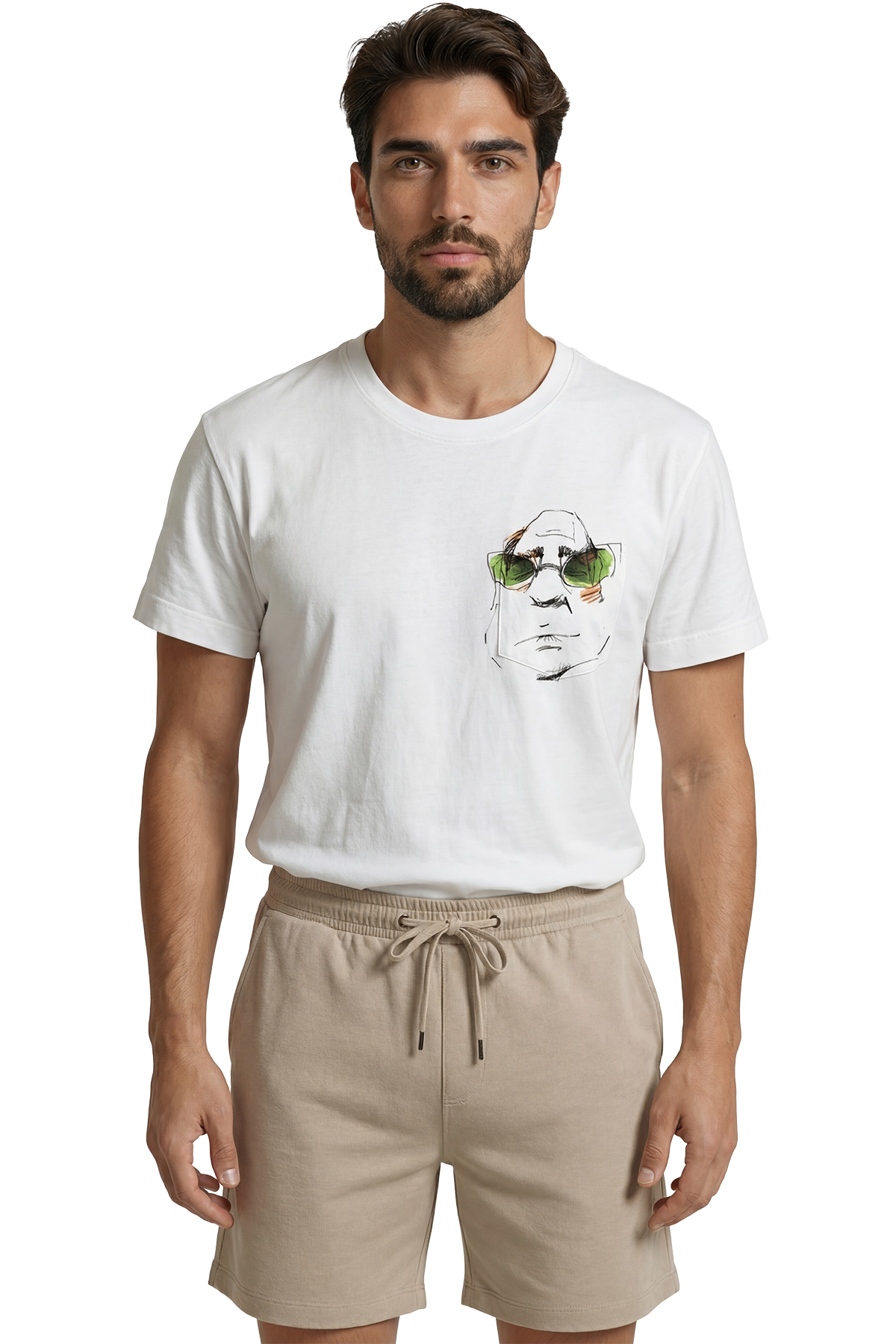 Sözlere gerek kalmadan tavrını ortaya koymak isteyenler için tasarlandı. Göğüs kısmında yer alan bu minimalist eskiz; karizmatik duruşu ve dikkat çekici yeşil güneş gözlükleriyle "cool"luğun tanımını yapıyor. Sanki bir sanatçının defterinden kopup tişörtünüze konmuş gibi duran bu özgün çizim; sadelikten yana olan ama detaylarda fark yaratmayı seven erkeklerin yeni favorisi olacak. İster ceket içine, ister tek başına; her kombine modern bir hava katın.