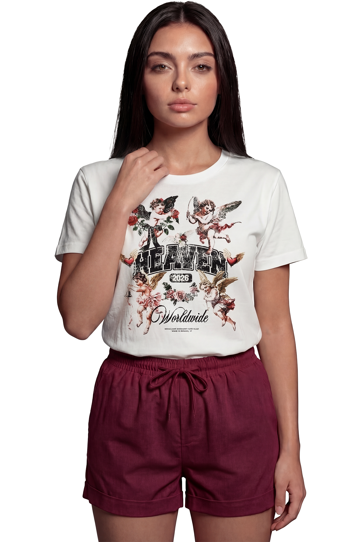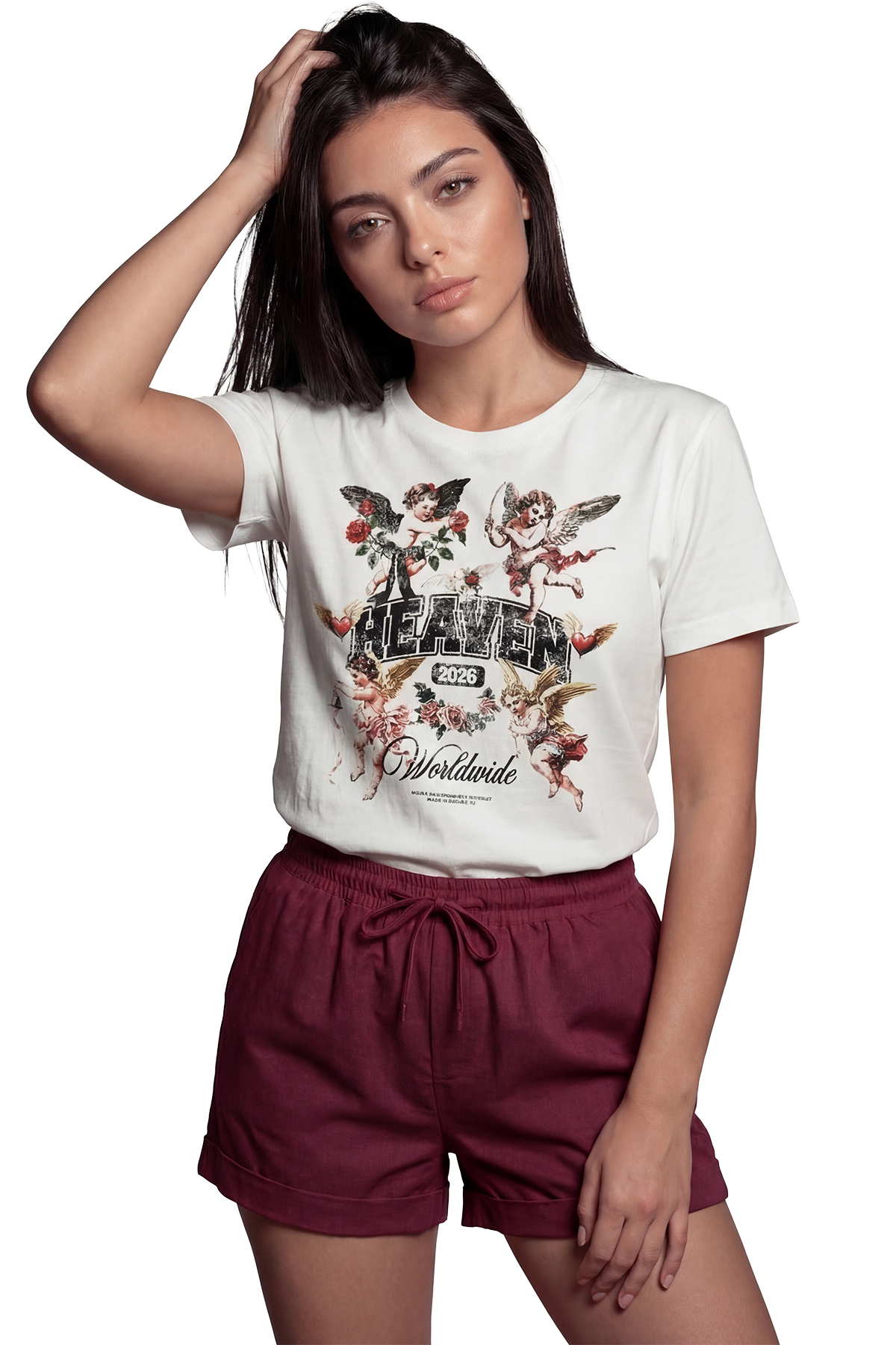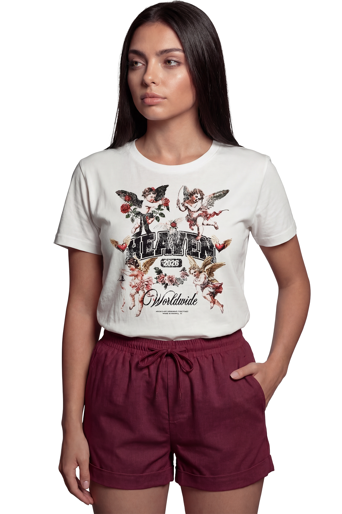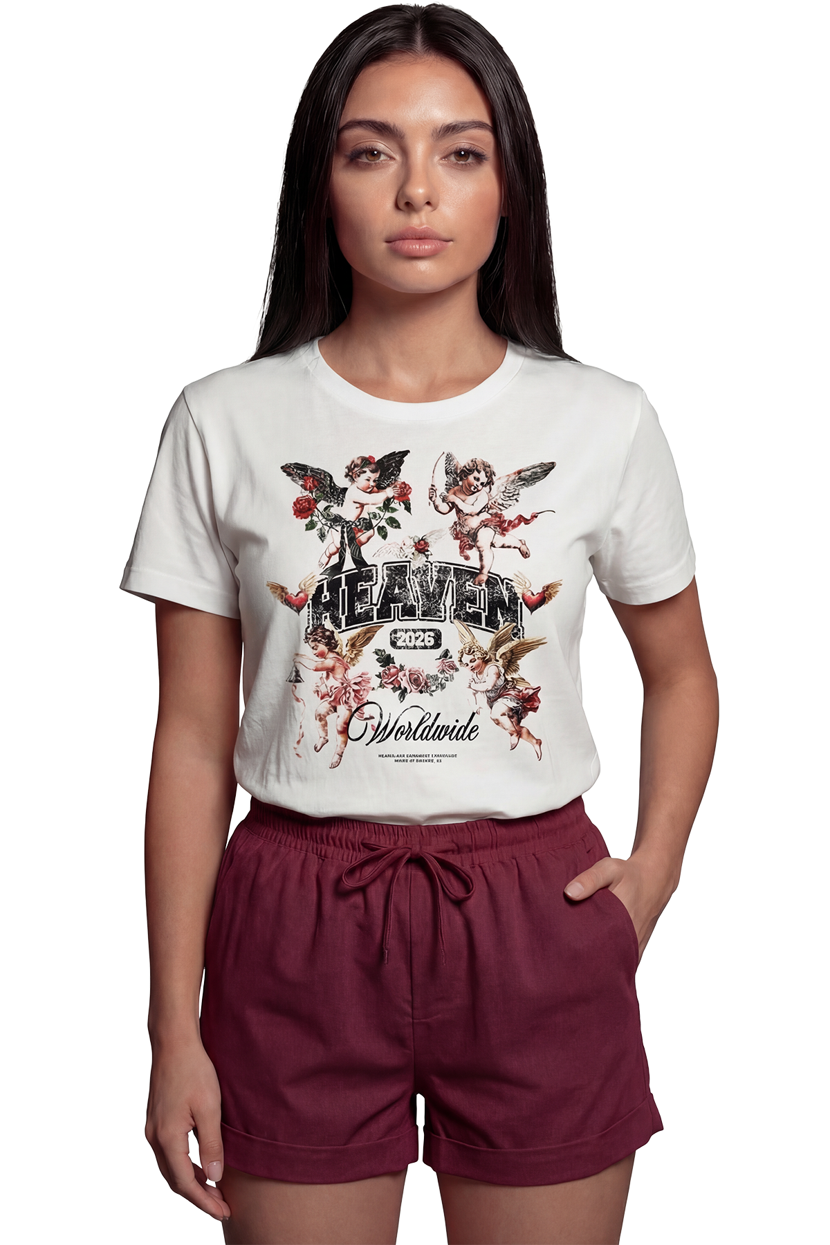 Rönesans Ruhu ve Sokak Modası: Estetik ve Asi Rönesans sanatının romantik melek figürlerini (cherubs), gülleri ve kanatlı kalpleri; sert ve köşeli gotik tipografiyle buluşturan bu tasarım, zıtlıkların uyumunu sergiliyor. "HEAVEN" ve "Worldwide" yazılarıyla global bir streetwear estetiği sunan, "2026" detayıyla geleceğe göz kırpan, hem nostaljik hem de modern bir parça.