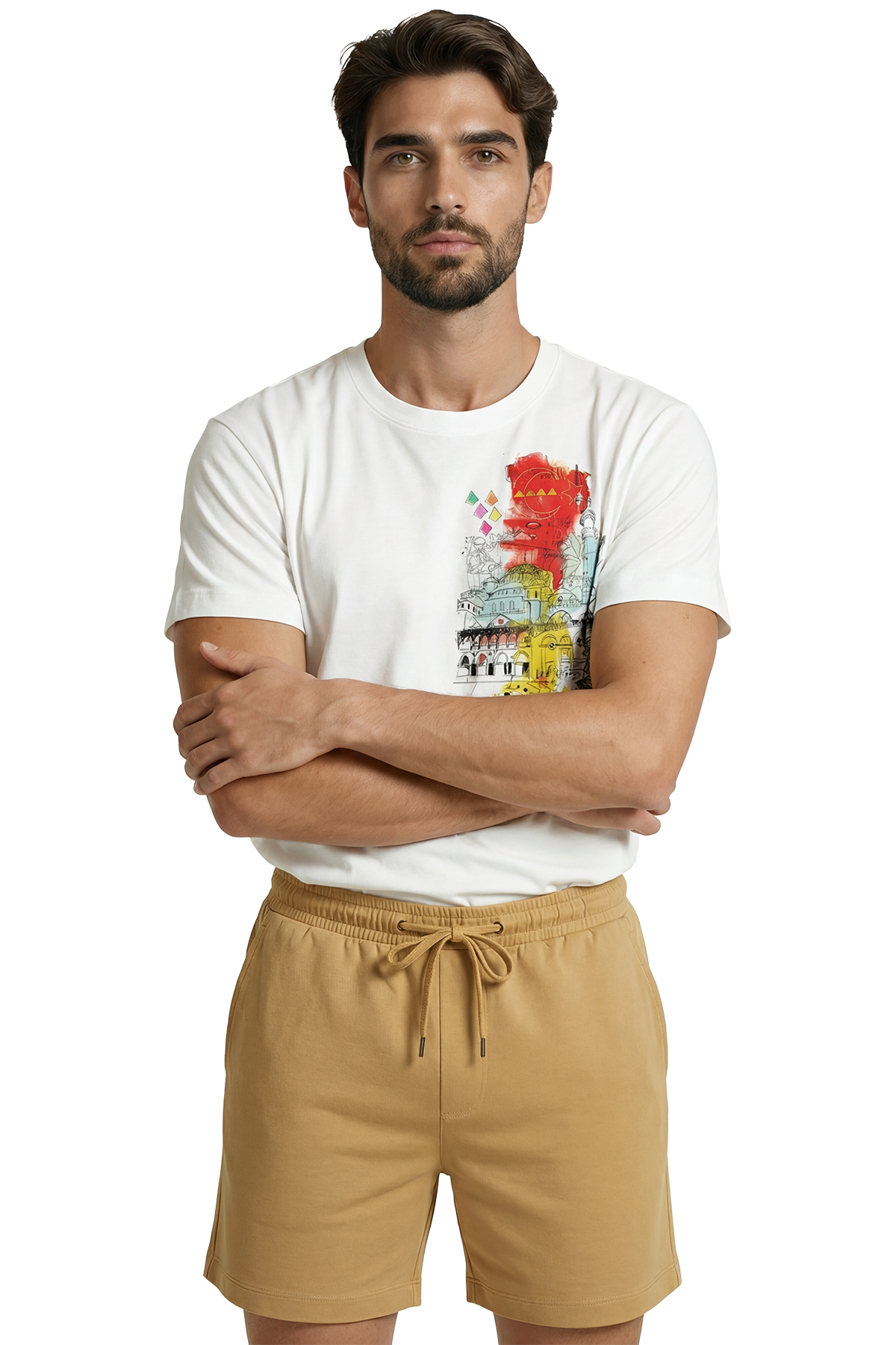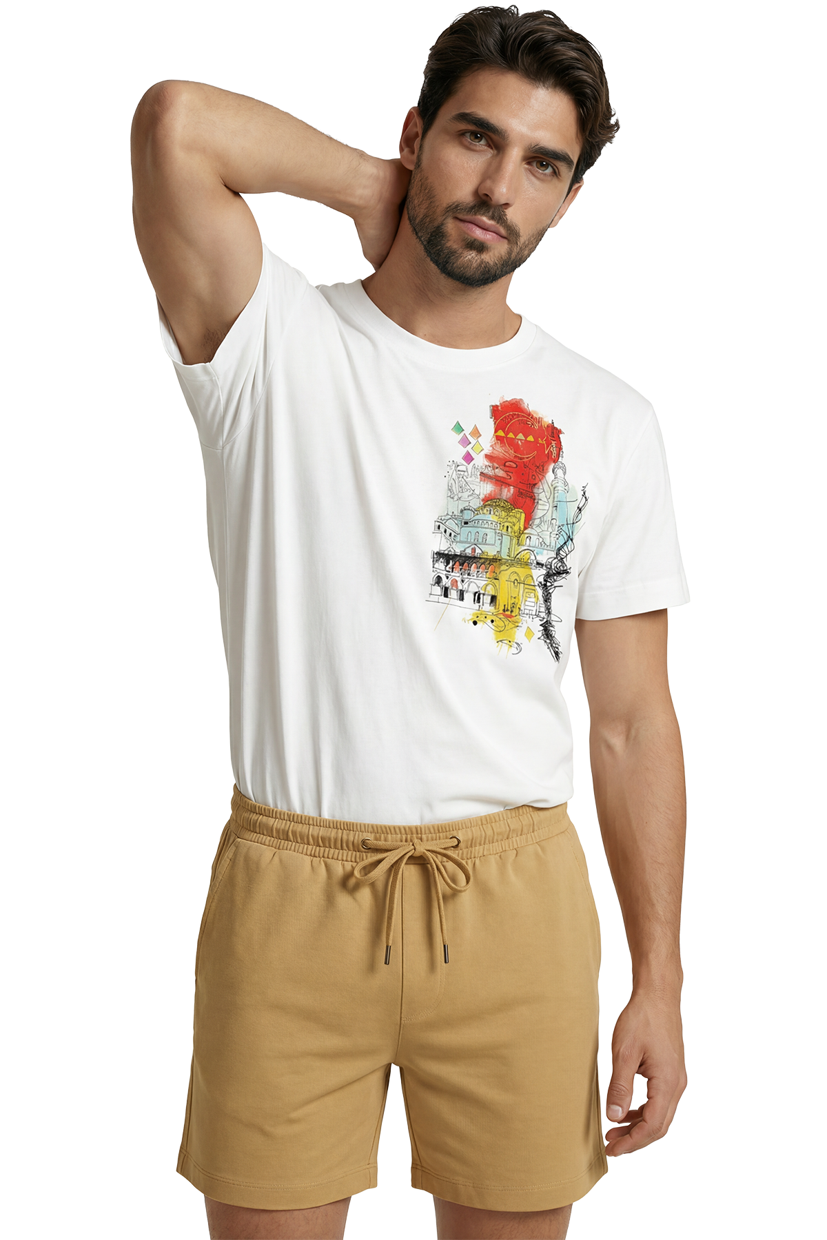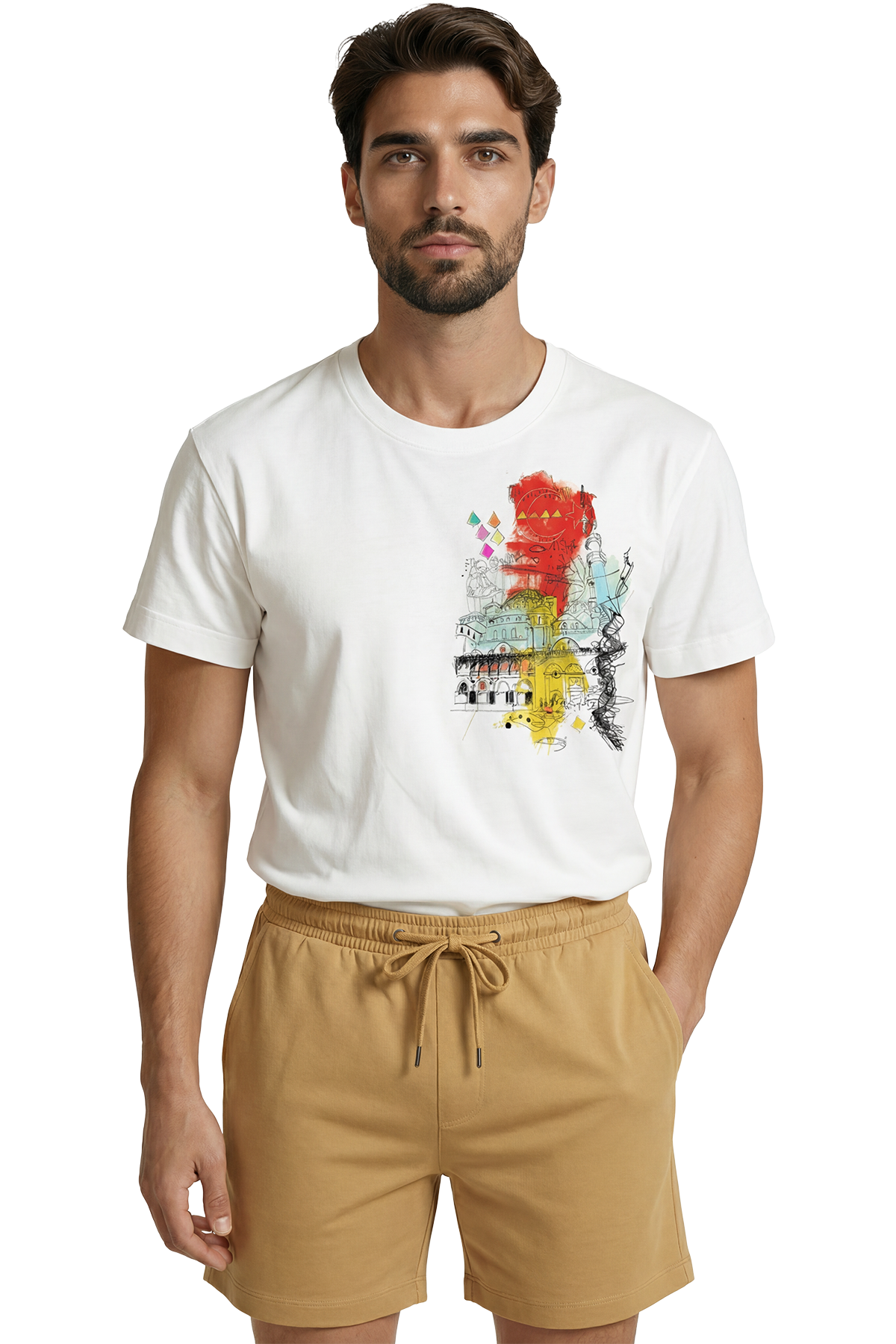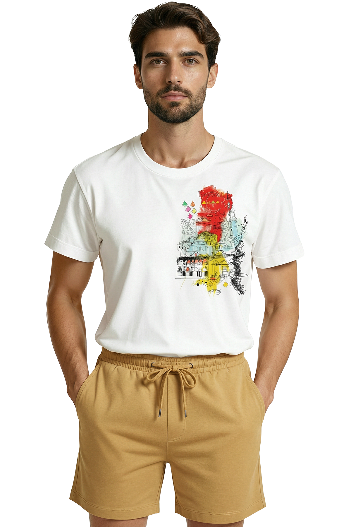 Boğaziçi’nin eşsiz renkleri, Tarihi Yarımada’nın büyüleyici kubbeleri ve İstanbul’un o bitmeyen enerjisi... Şehrin ruhunu, klasik turistik baskıların çok ötesinde, modern bir "Urban Sketch" (Şehir Eskizi) tarzıyla yorumladık. Kırmızı, sarı ve turkuaz sulu boya efektlerinin, siyah eskiz çizgileriyle buluştuğu bu tasarım; İstanbul’a aşık, tarih ve kültür tutkunu erkekler için hem nostaljik hem de çağdaş bir stil sunuyor.