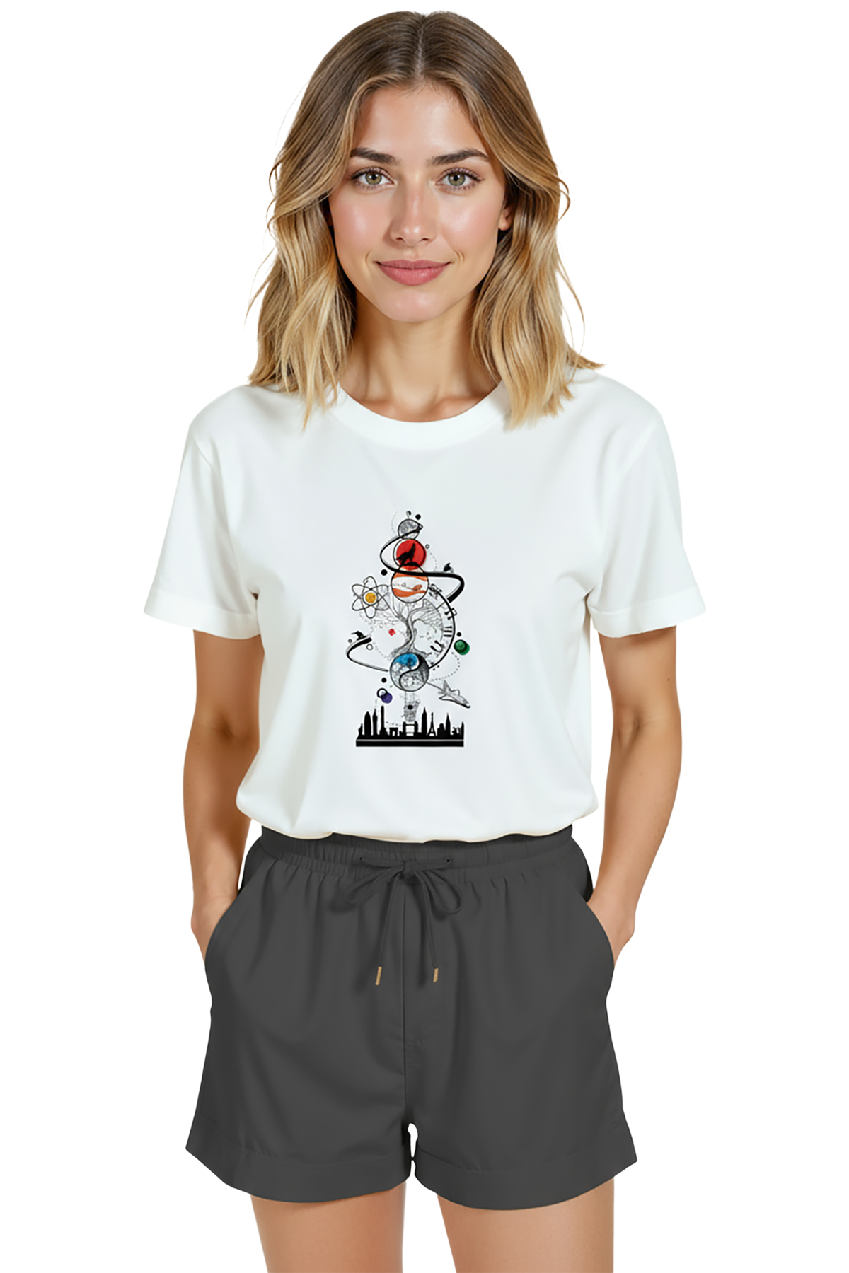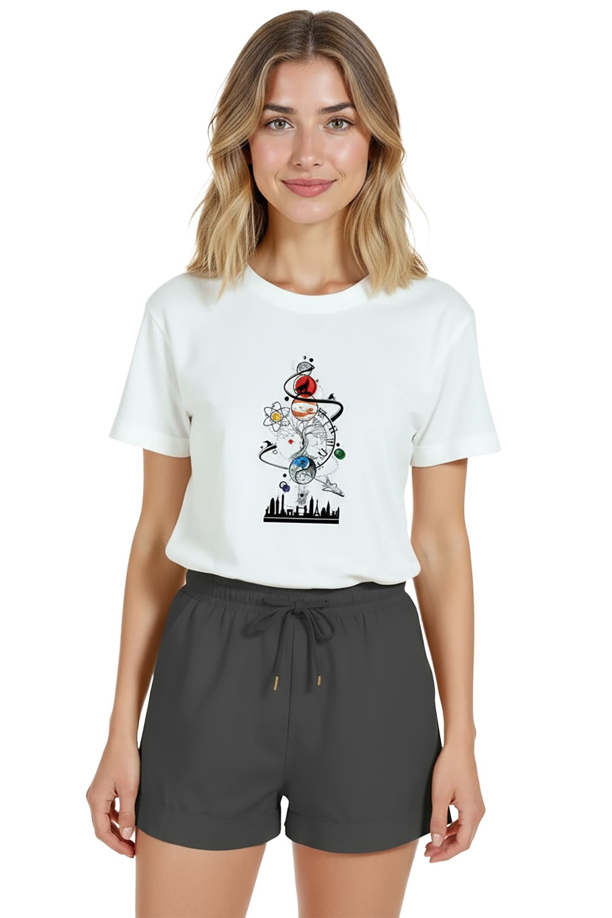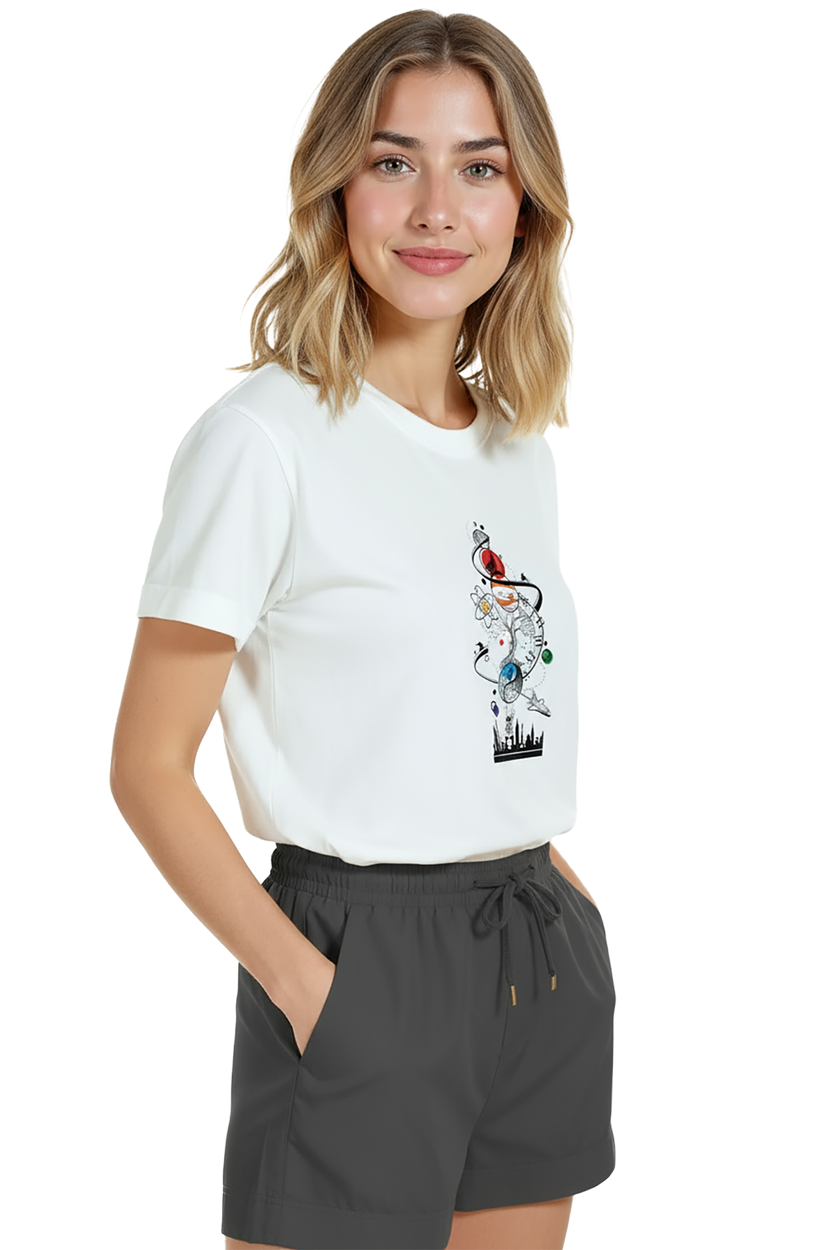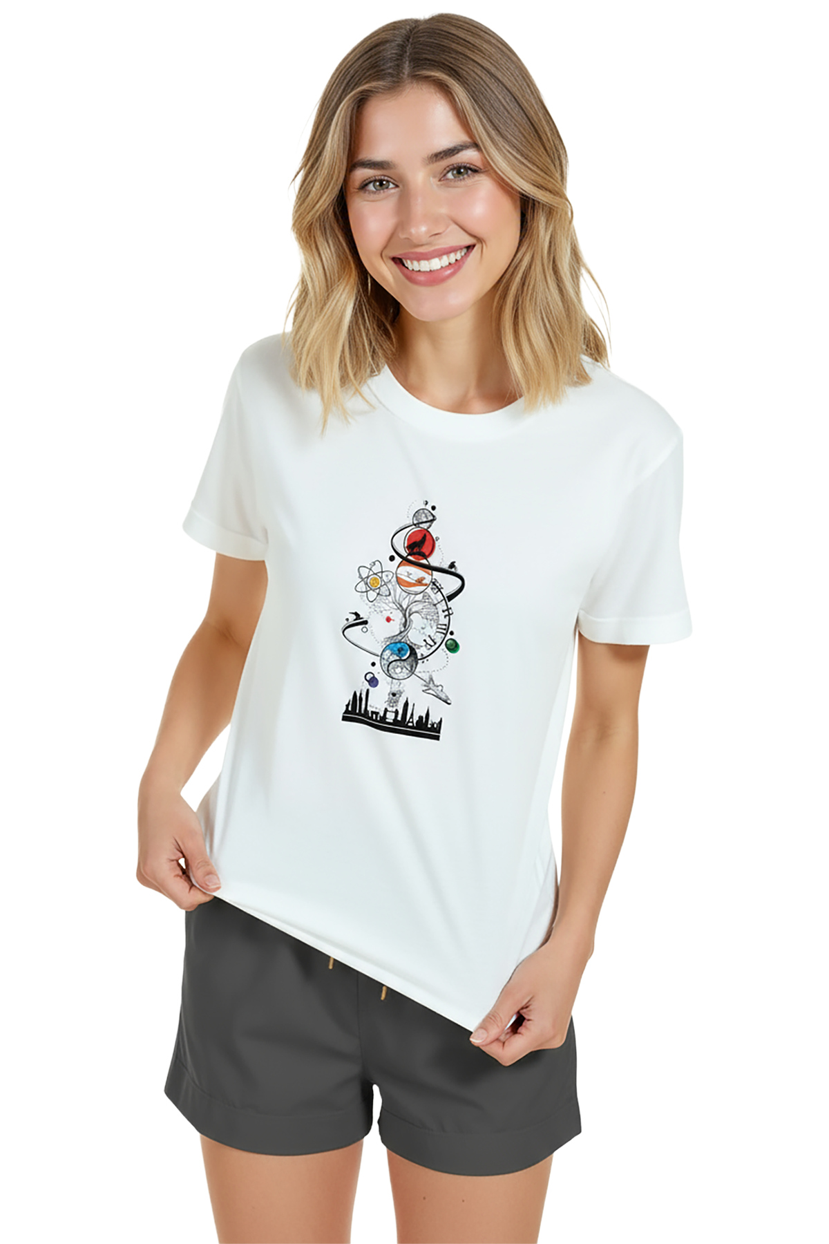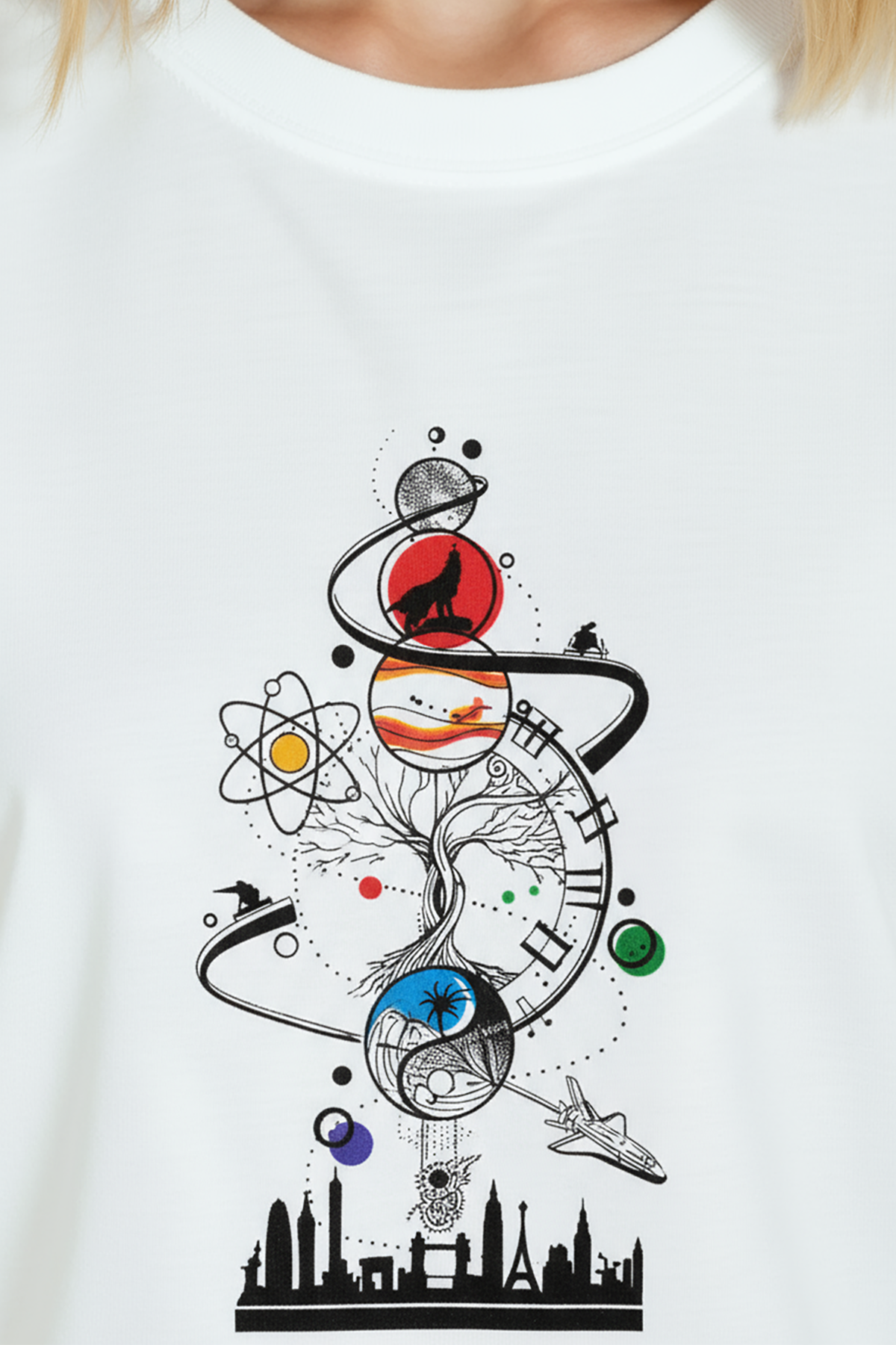 Minimal, sanatsal ve keşif odaklı bir tasarıma sahip kadın tişörtü. Bu beyaz relaxed fit kadın tişört, göğüs merkezine yakın konumda yer alan atom simgesi, gezegenler, dalga‑saat kompozisyonu ve şehir silueti içeren soyut illüstrasyonla dikkat çeker. Ürün %100 pamuk kumaştan üretilmiştir ve relaxed fit kadın kesim sayesinde gün boyu konfor, nefes alabilirlik ve rahat hareket sağlar. Tasarım yüksek çözünürlüklü dijital baskı ile uygulanmış; ince mürekkep çizgileri, renkli gezegen vurguları ve minik ikonografik detaylar uzun süre net kalır. Seyahat, bilim ve şehir temalı günlük kombinler için ideal, hediye seçenekleri arasında öne çıkar.