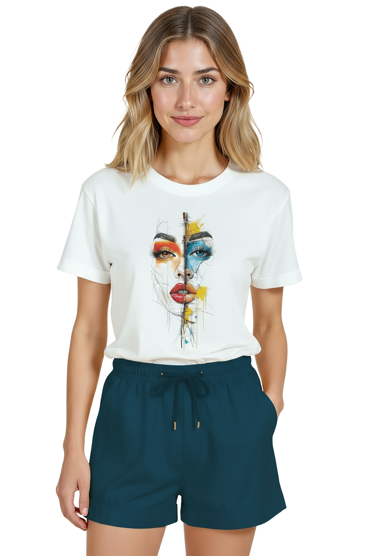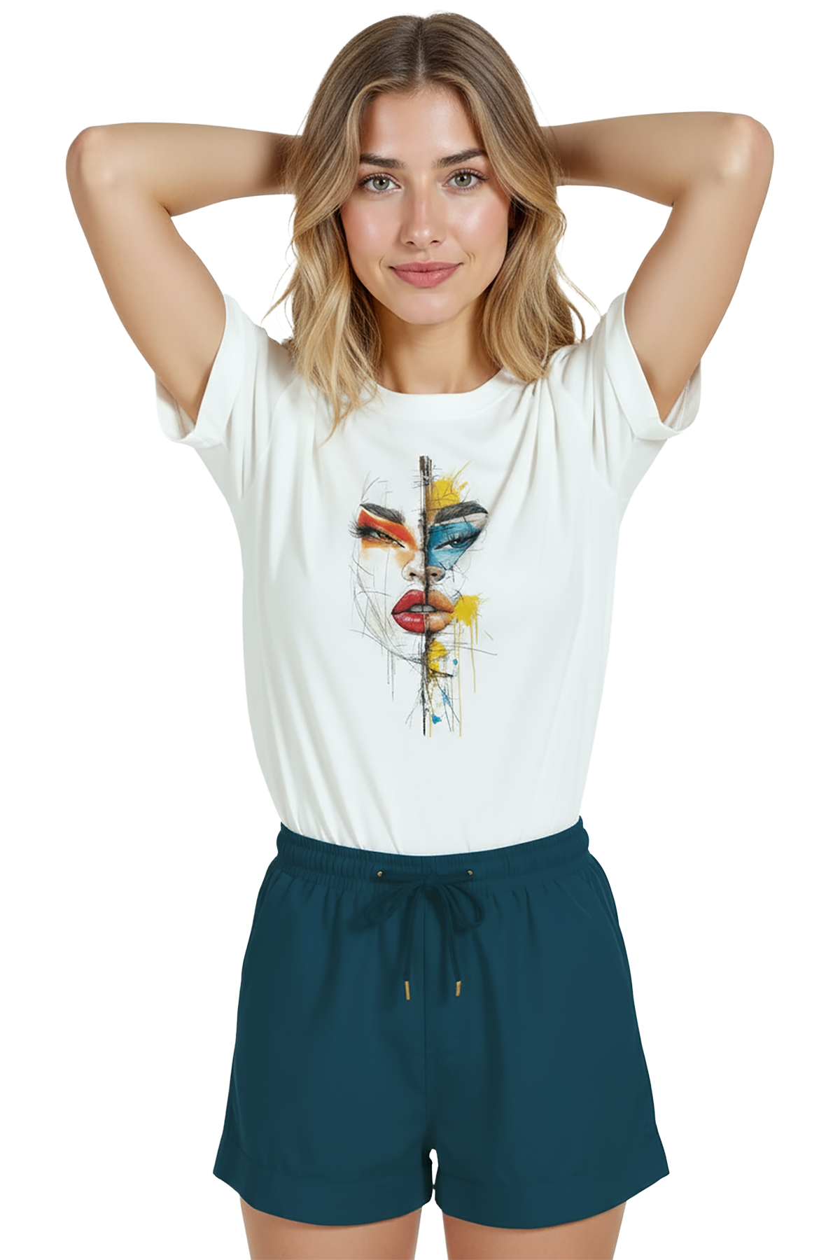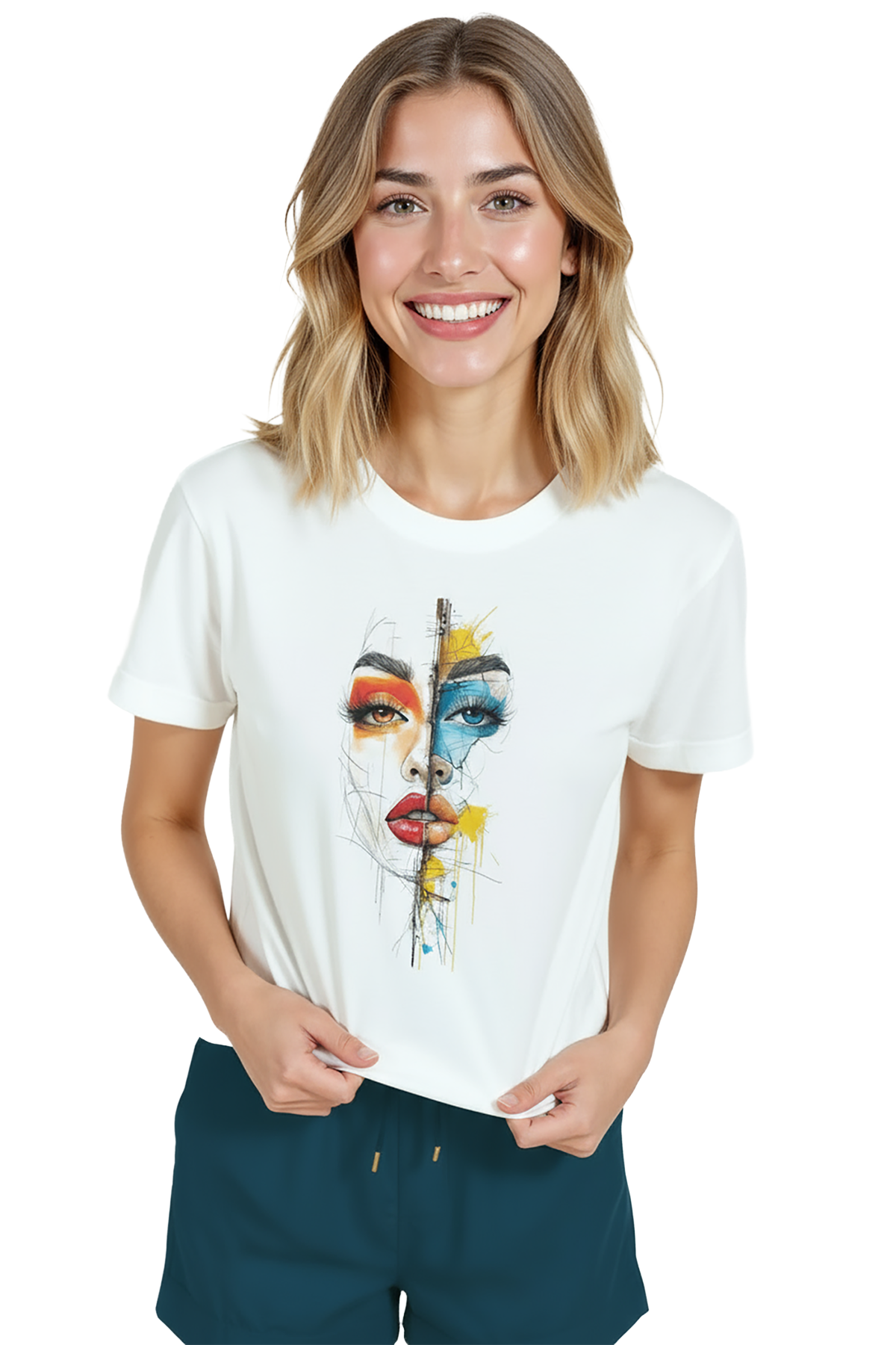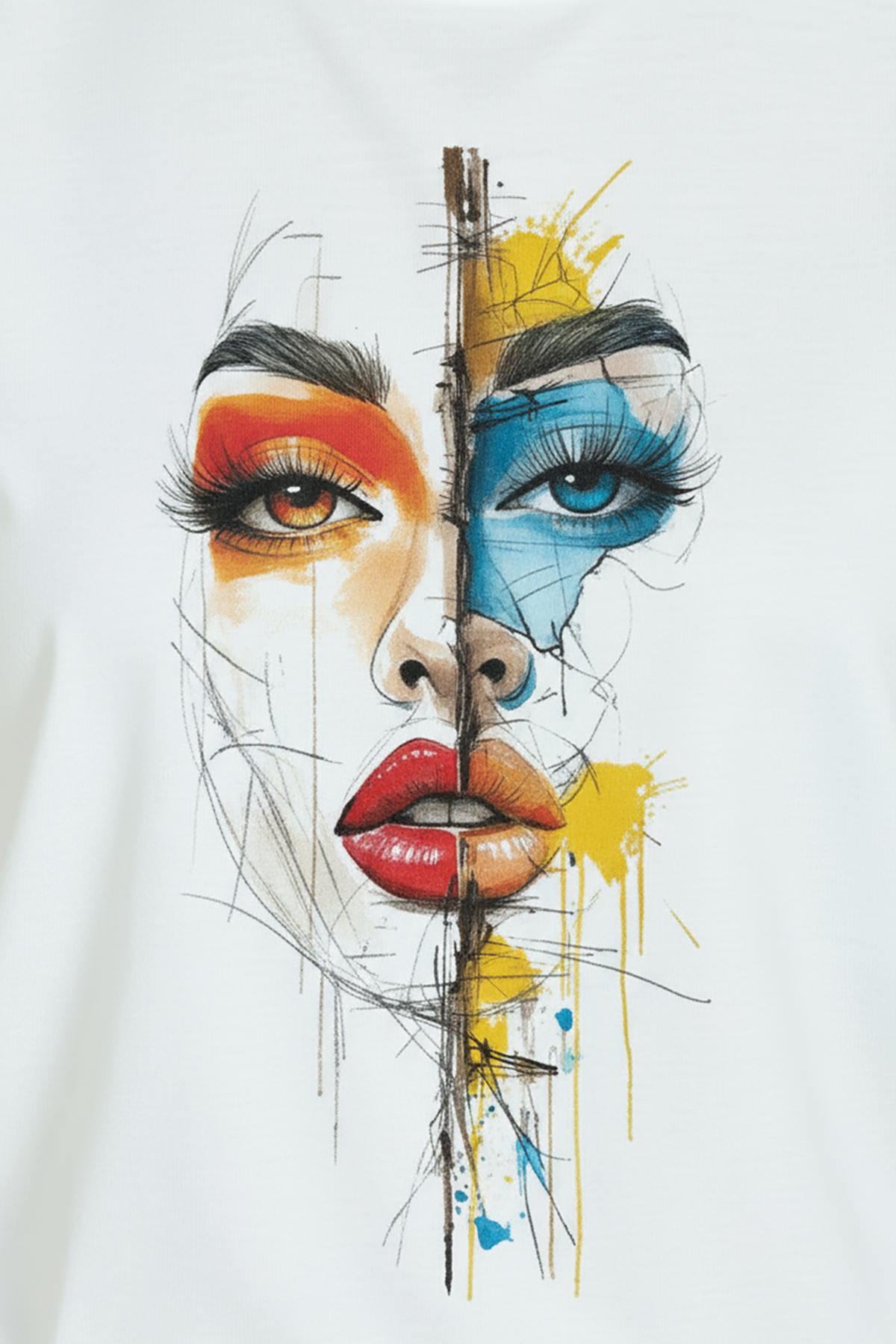 Minimal ve çarpıcı bir sanat ifadesi sunan kadın tişörtü. Bu beyaz relaxed fit kadın tişört, ön göğüste yer alan orta hizada iki renkte bölünmüş portre illüstrasyonu (solda sıcak turuncu‑kırmızı makyaj, sağda soğuk mavi vurgular ve canlı sarı suluboya lekeleri) ile modern ve dikkat çekici bir görünüm sağlar. Ürün %100 pamuk kumaştan üretilmiş olup relaxed fit kadın kesim sayesinde gün boyu konfor, nefes alabilirlik ve özgür hareket sağlar. Baskı yüksek çözünürlüklü dijital baskı ile uygulanmıştır; ince karakalem çizgiler, güçlü renk blokları ve suluboya geçişleri uzun süre canlı kalır. Günlük şehir kombinleri, kafe‑stil ve smart‑casual kullanımlar için ideal, sanat‑odaklı gardıroplara merkez parça ekler.