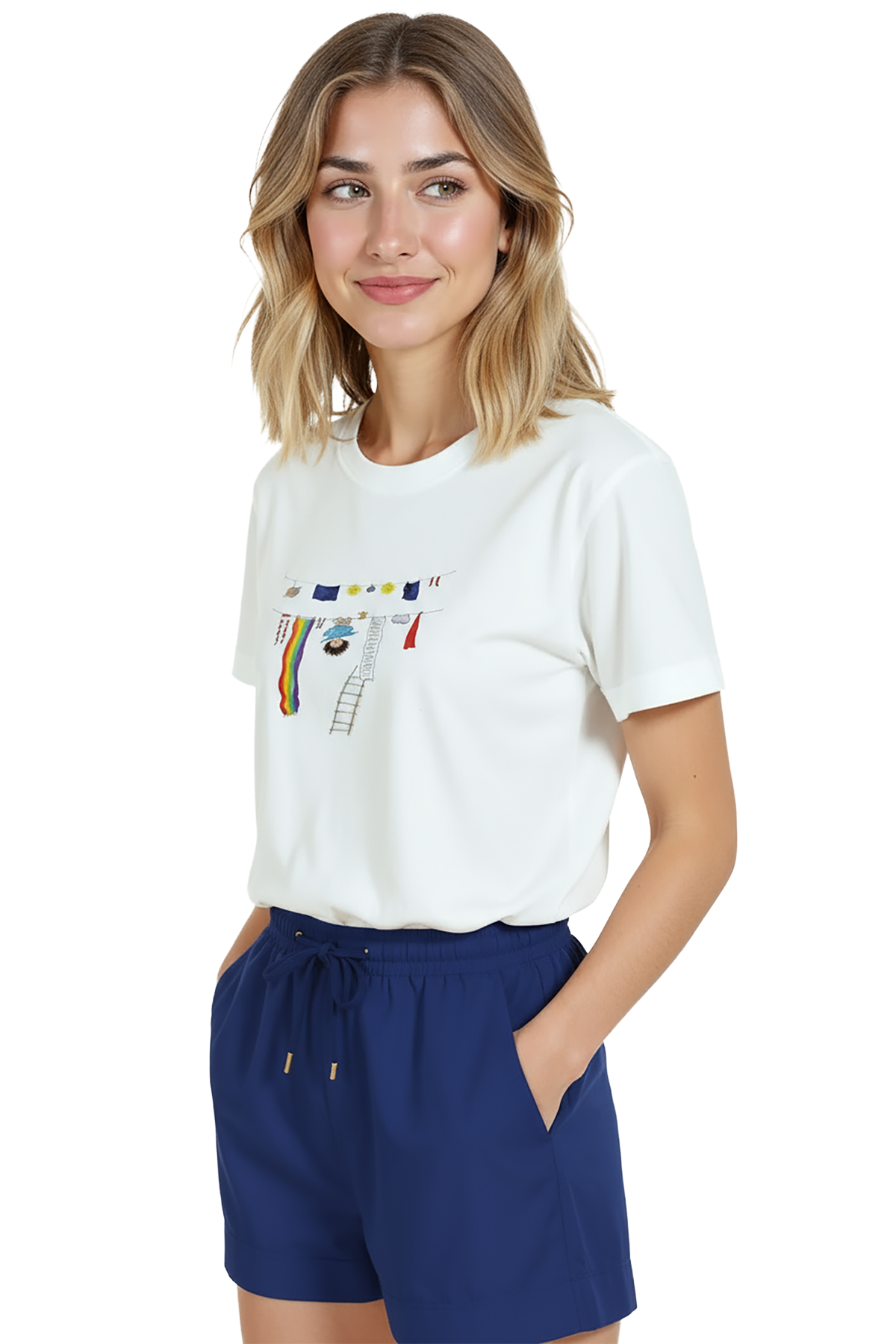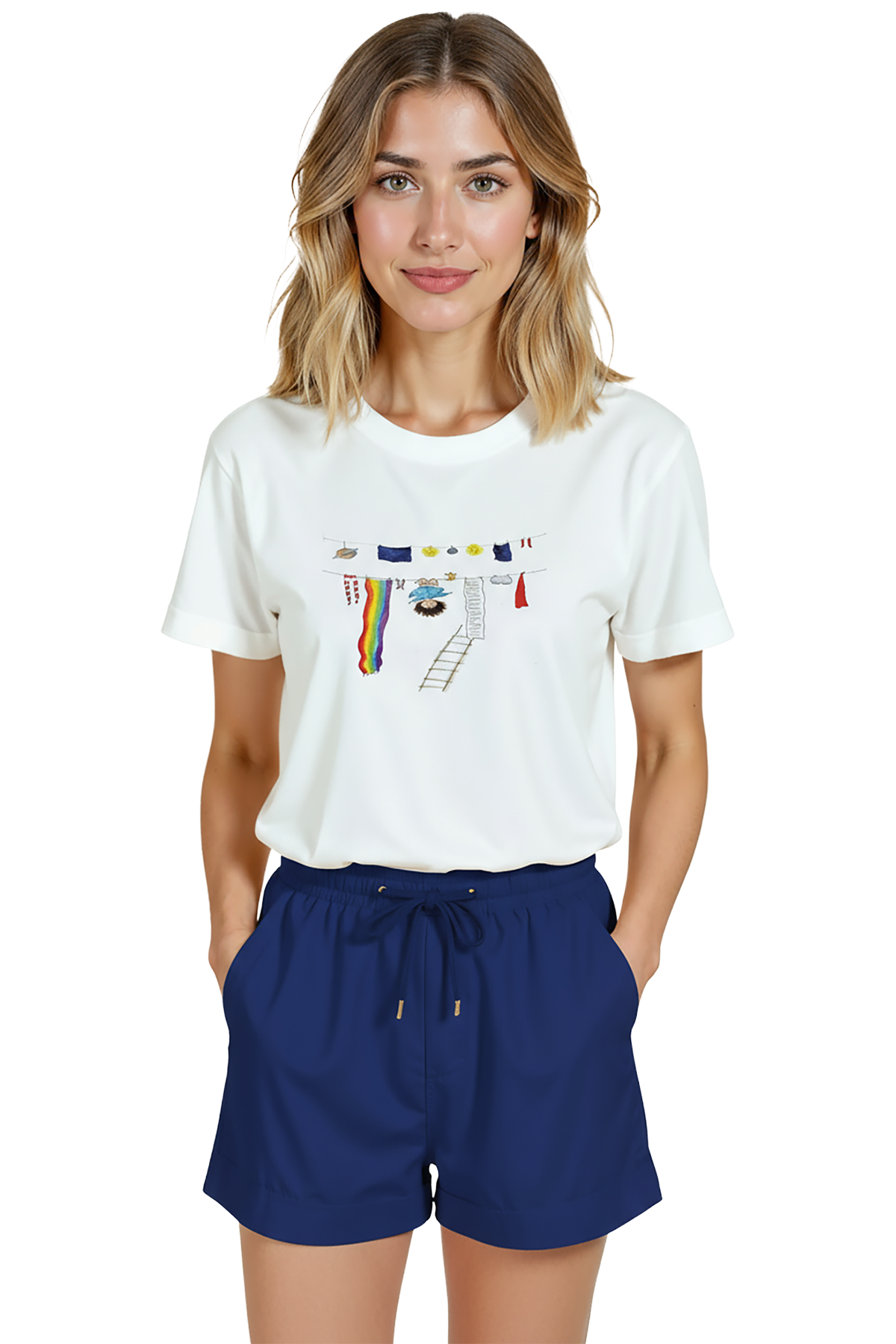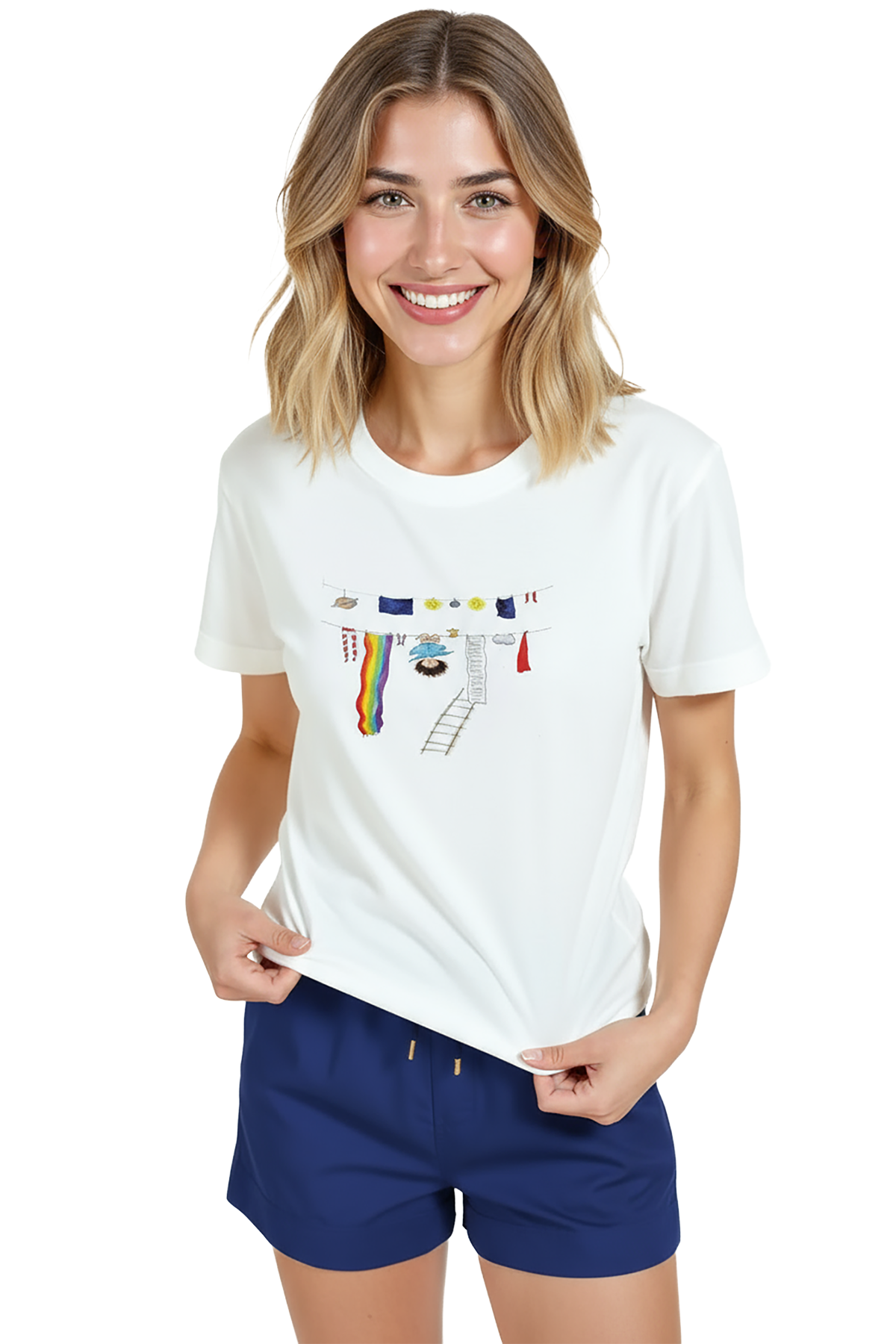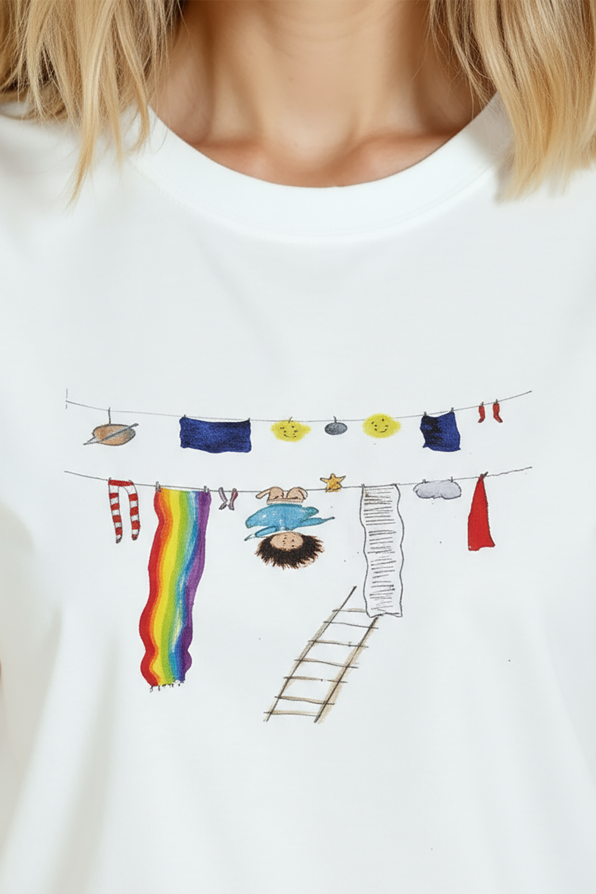 Minimal, neşeli ve hikâye odaklı bir tasarıma sahip kadın tişörtü. Bu beyaz relaxed fit kadın tişört, ön göğüste yer alan çamaşır ipi, merdiven ve gökkuşağı suluboya illüstrasyonu ile samimi ve oyunbaz bir görünüm sunar. Ürün %100 pamuk kumaştan üretilmiştir ve relaxed fit kadın kesim sayesinde gün boyu konfor, nefes alabilirlik ve rahat hareket sağlar. Grafik yüksek çözünürlüklü dijital baskı ile uygulanmış; ince fırça dokuları, pastel tonlar ve küçük detaylar uzun süre canlı kalır. Günlük şehir kombinleri, kafe‑stili ve casual gardıroplar için ideal; hediye seçeneği olarak da öne çıkar.