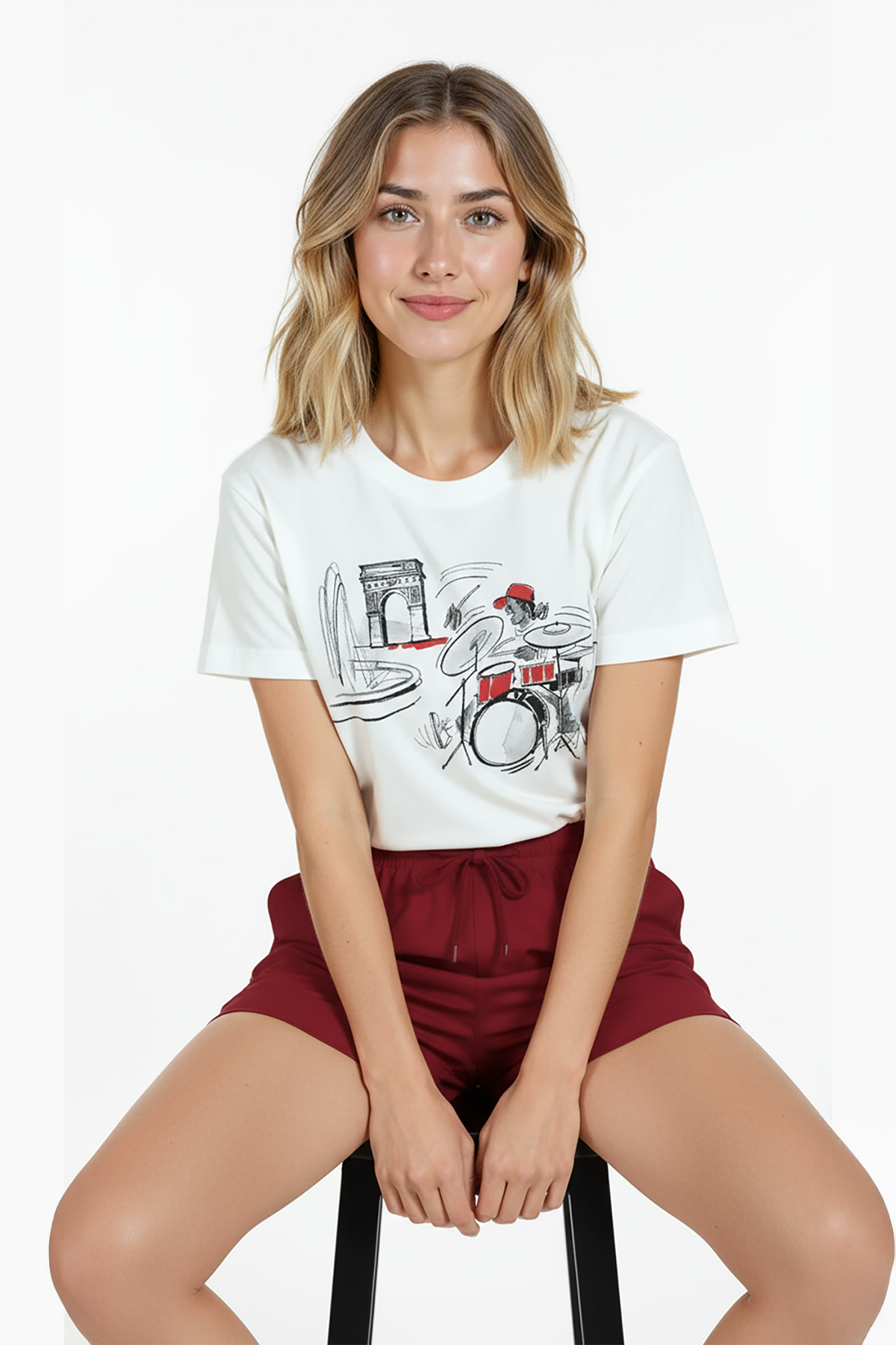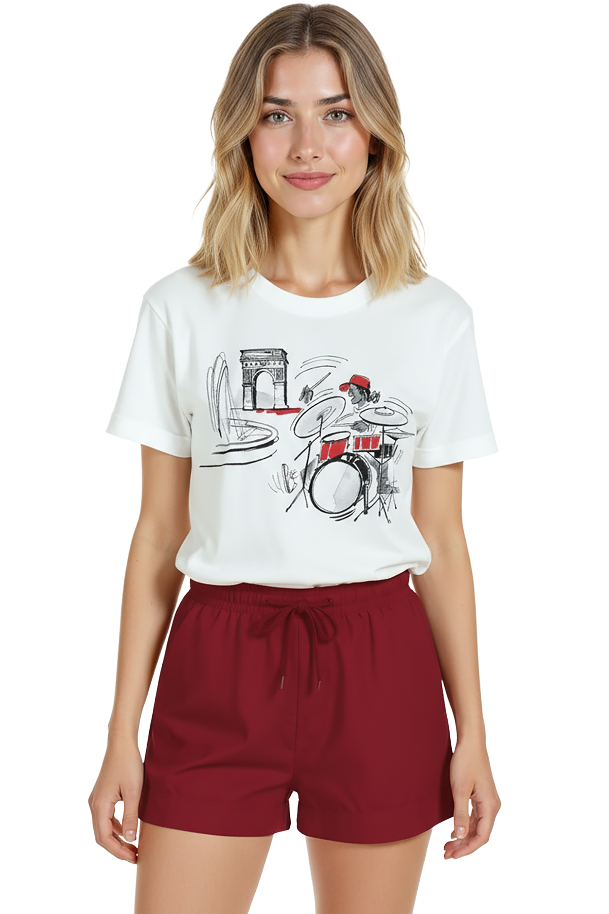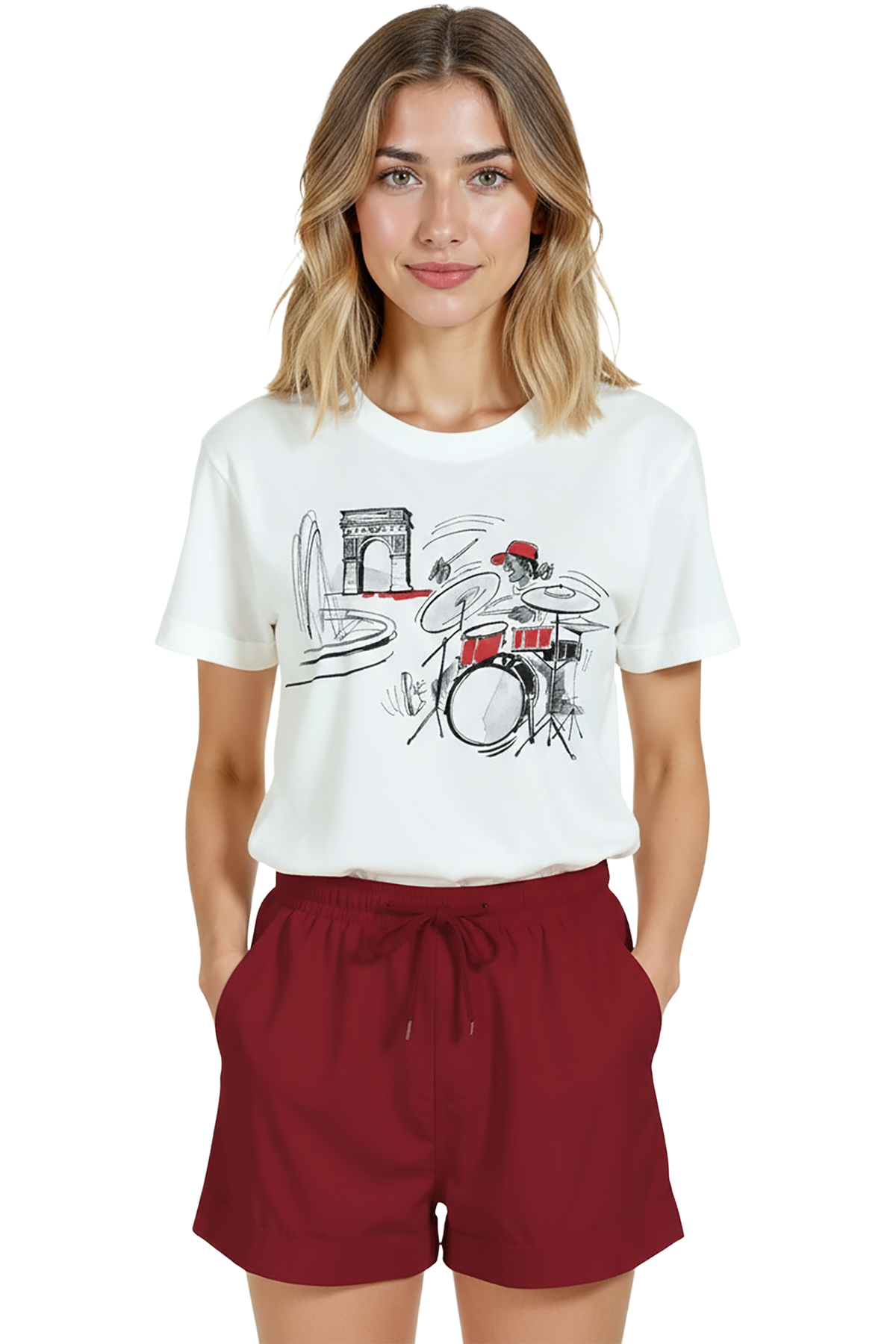 - Bordo/terracotta tonlarında high‑waist short veya chino + sandalet — baskıdaki kırmızı vurguya uyum