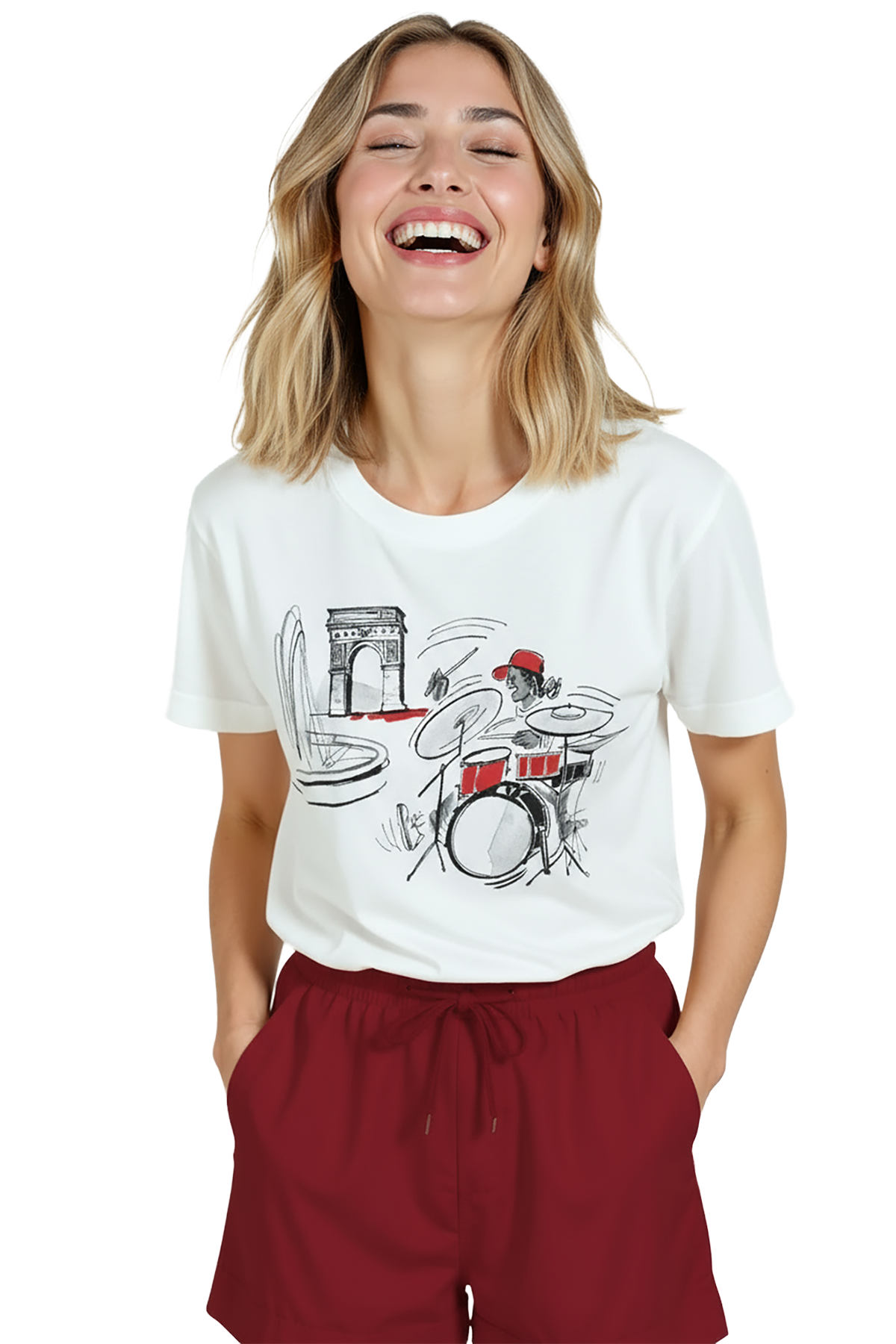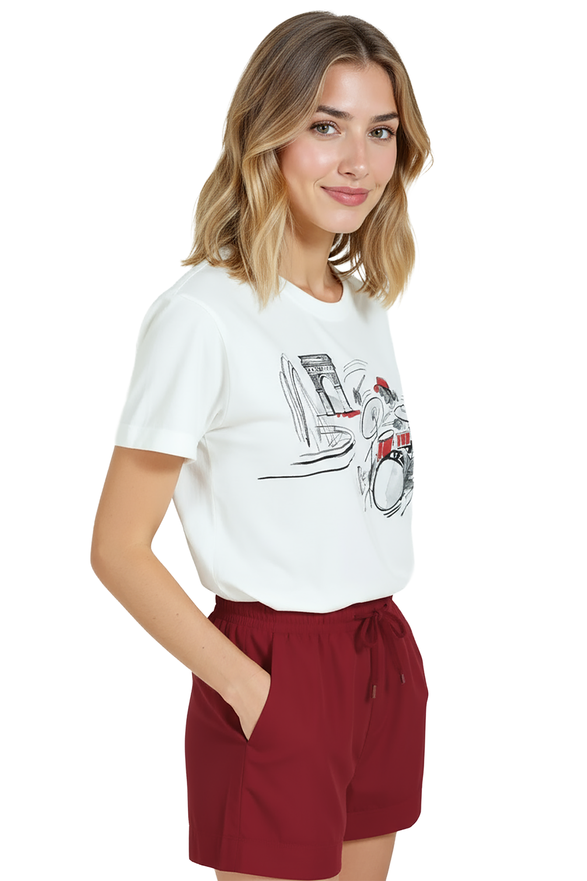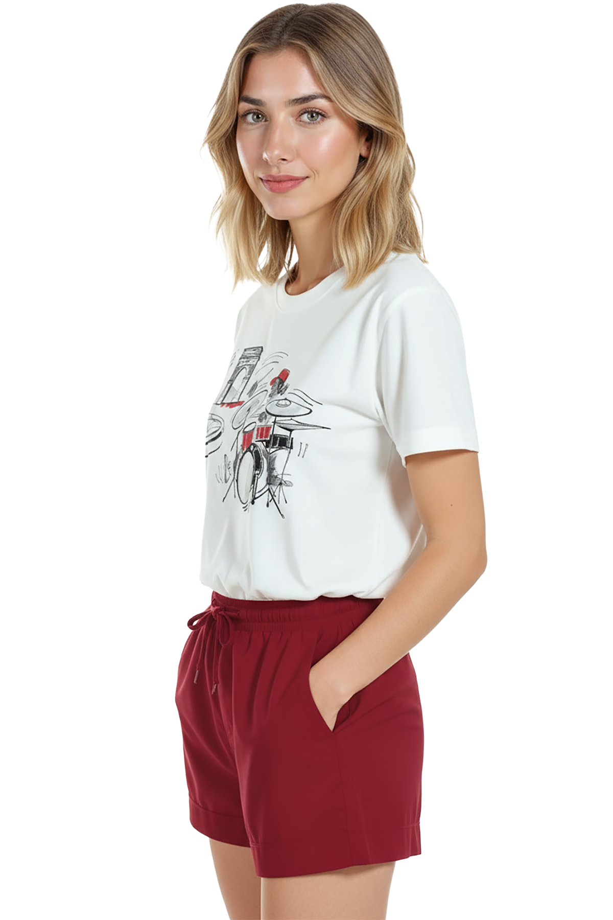 - Bordo/terracotta tonlarında high‑waist short veya chino + sandalet — baskıdaki kırmızı vurguya uyum