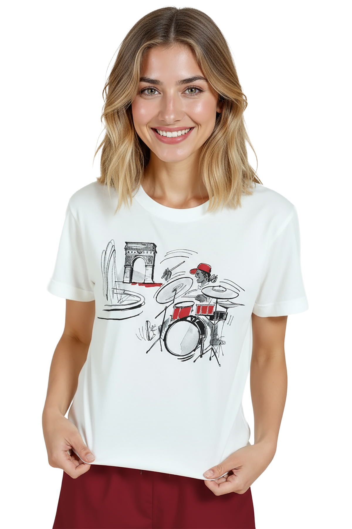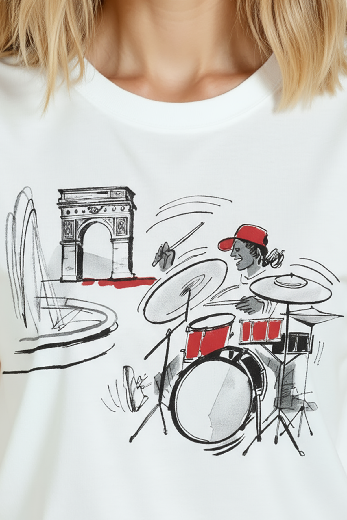 Minimal, ritmik ve şehirli bir ifade sunan kadın tişörtü. Bu beyaz relaxed fit kadın tişört, ön göğüste yer alan çizgisel mürekkep eskiz davulcu illüstrasyonu ve arka planda anıtsal mimari/su öğesi vurgusu ile modern, dinamik bir görünüm sağlar. Kırmızı vurgu detayları (şapka ve davul parçaları) tasarıma enerji katarken, %100 pamuk kumaş ve relaxed fit kadın kesim gün boyu konfor, nefes alabilirlik ve hareket özgürlüğü sunar. Grafik yüksek çözünürlüklü dijital baskı ile uygulanmış; ince çizgiler ve boya dokuları uzun süre canlı kalır. Günlük şehir kombinleri, kafe‑stili ve smart‑casual kullanımlar için ideal, genç ve sanat odaklı gardıroplara güçlü bir parça ekler.