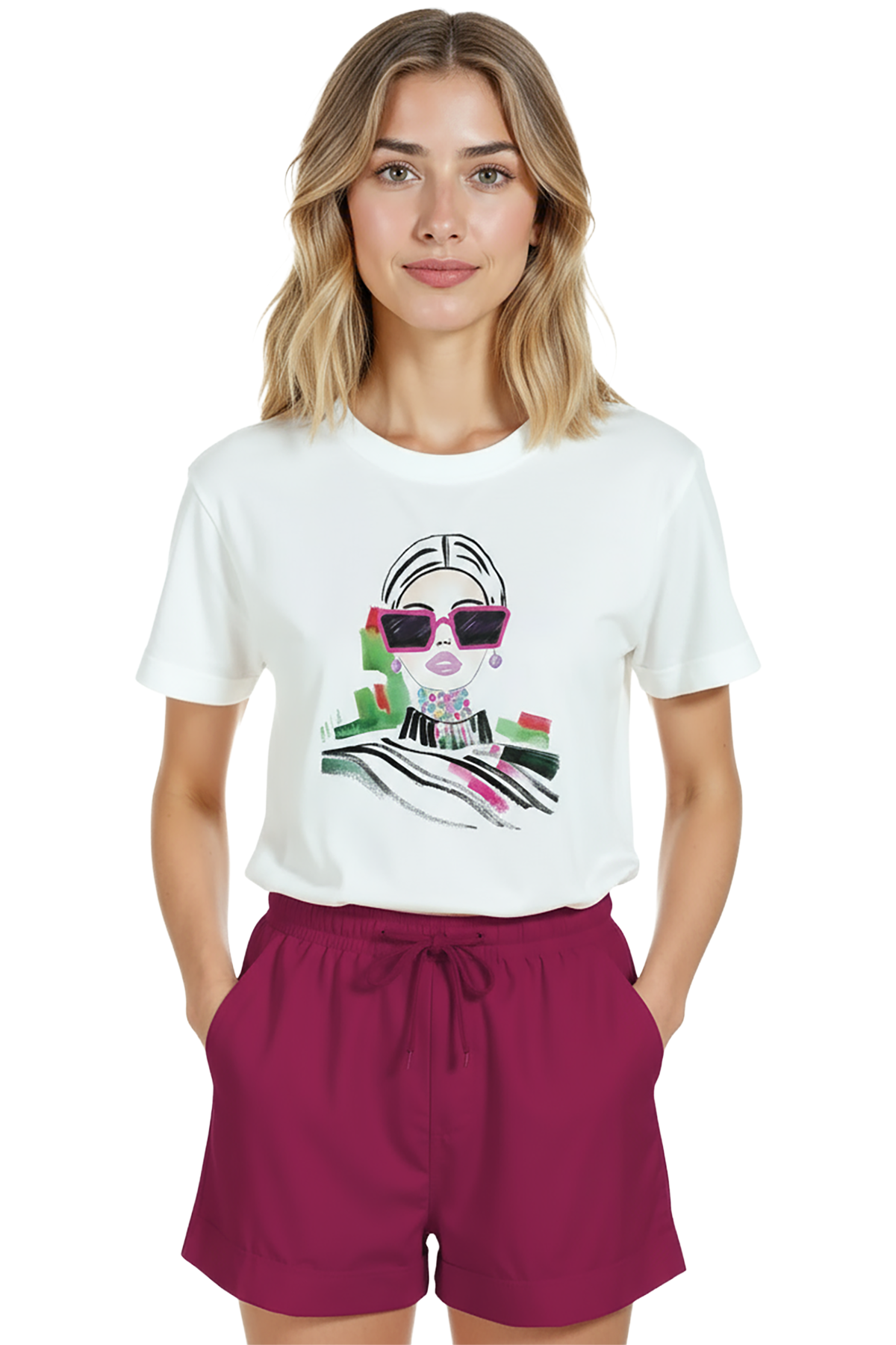 Sanat ve moda duruşunu bir arada sunan kadın tişörtü. Bu beyaz relaxed fit kadın tişört, ön göğüste yer alan çizgisel illüstrasyonlu kadın portresi ve dikkat çekici pembe/füşya güneş gözlüğü vurgusu ile modern ve şık bir ifade sağlar. Ürün %100 pamuk kumaştan üretilmiş olup relaxed fit kadın kesim sayesinde gün boyu konfor, nefes alabilirlik ve rahat hareket özgürlüğü sunar. Tasarım yüksek çözünürlüklü dijital baskı ile uygulanmıştır; canlı renk geçişleri, mürekkep dokuları ve ince çizgiler uzun süre korunur. Günlük şehir kombinleri, kafe‑stil ve smart‑casual kullanımlar için ideal, moda odaklı gardıroplara kolay uyum sağlayan bir parça.