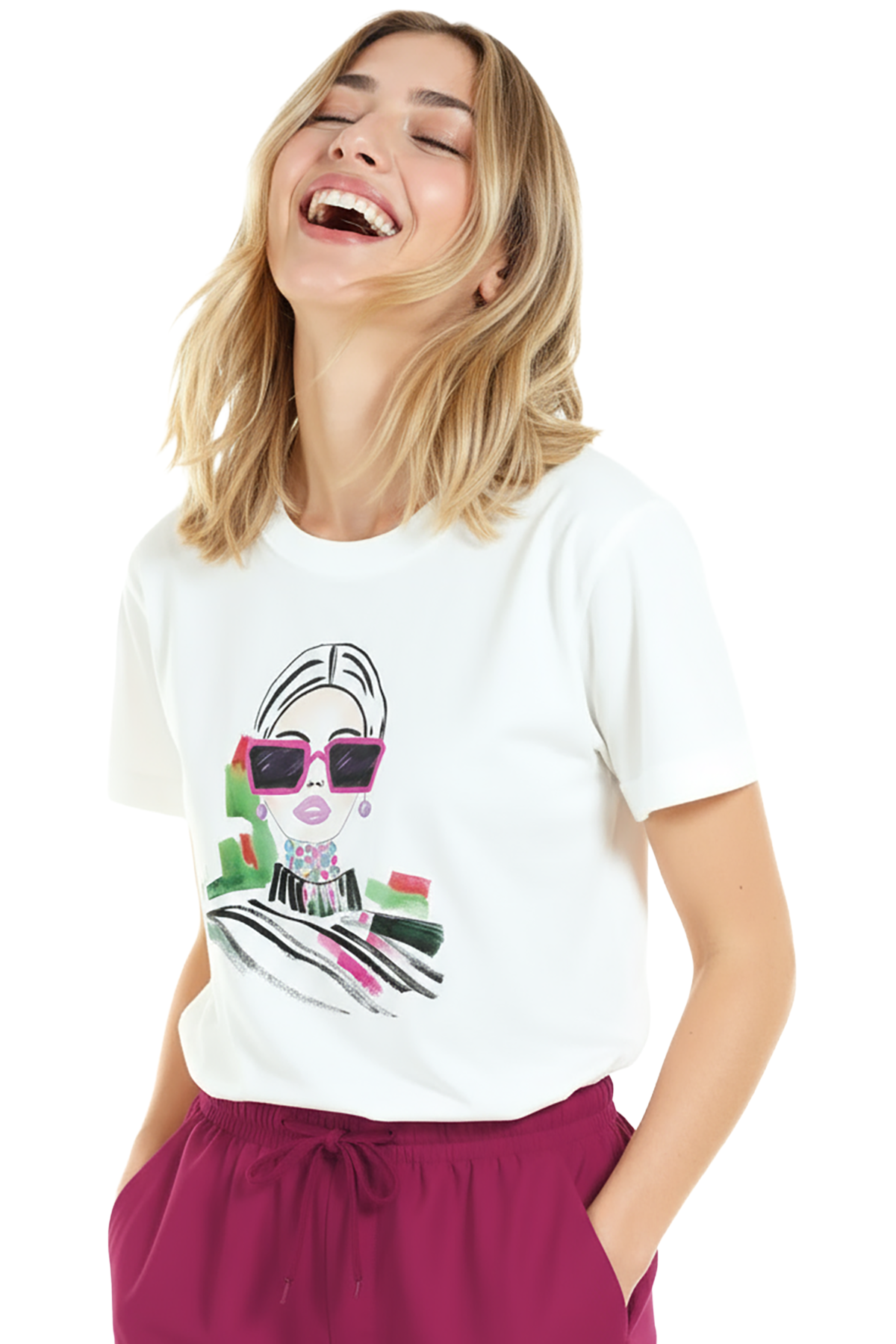 Kadın Beyaz Relaxed Fit %100 Pamuk Tişört – Çizgisel Portre & Pembe Gözlük Baskılı