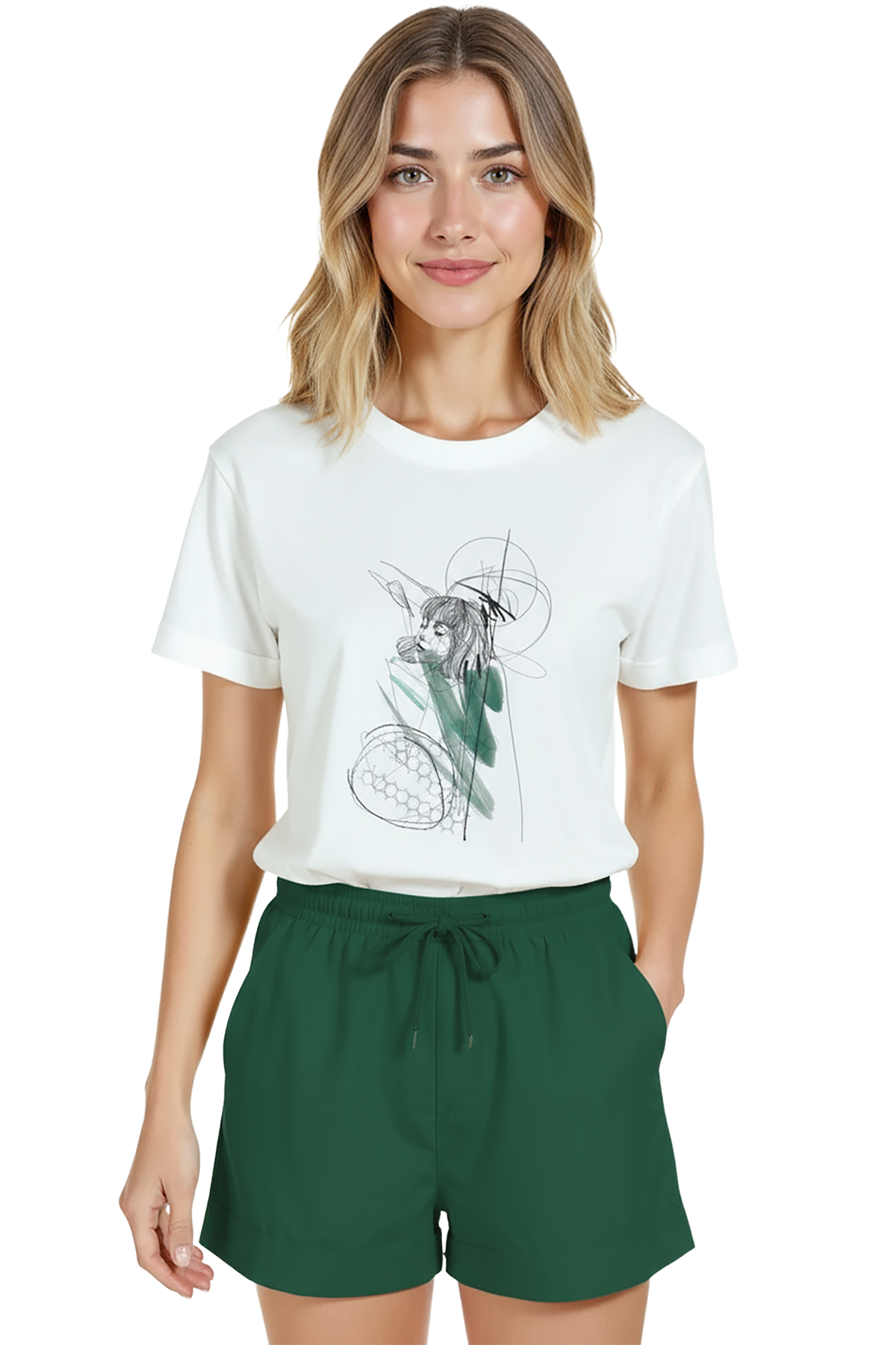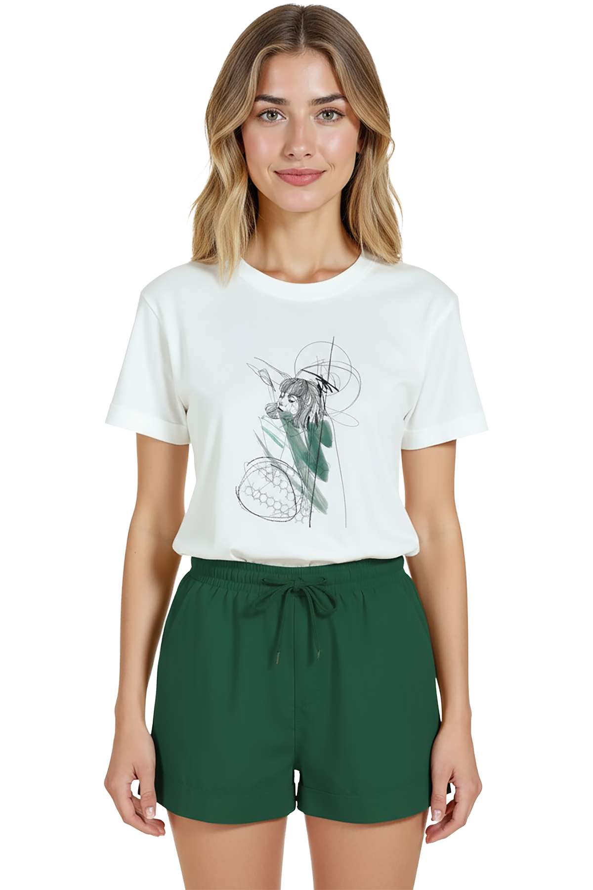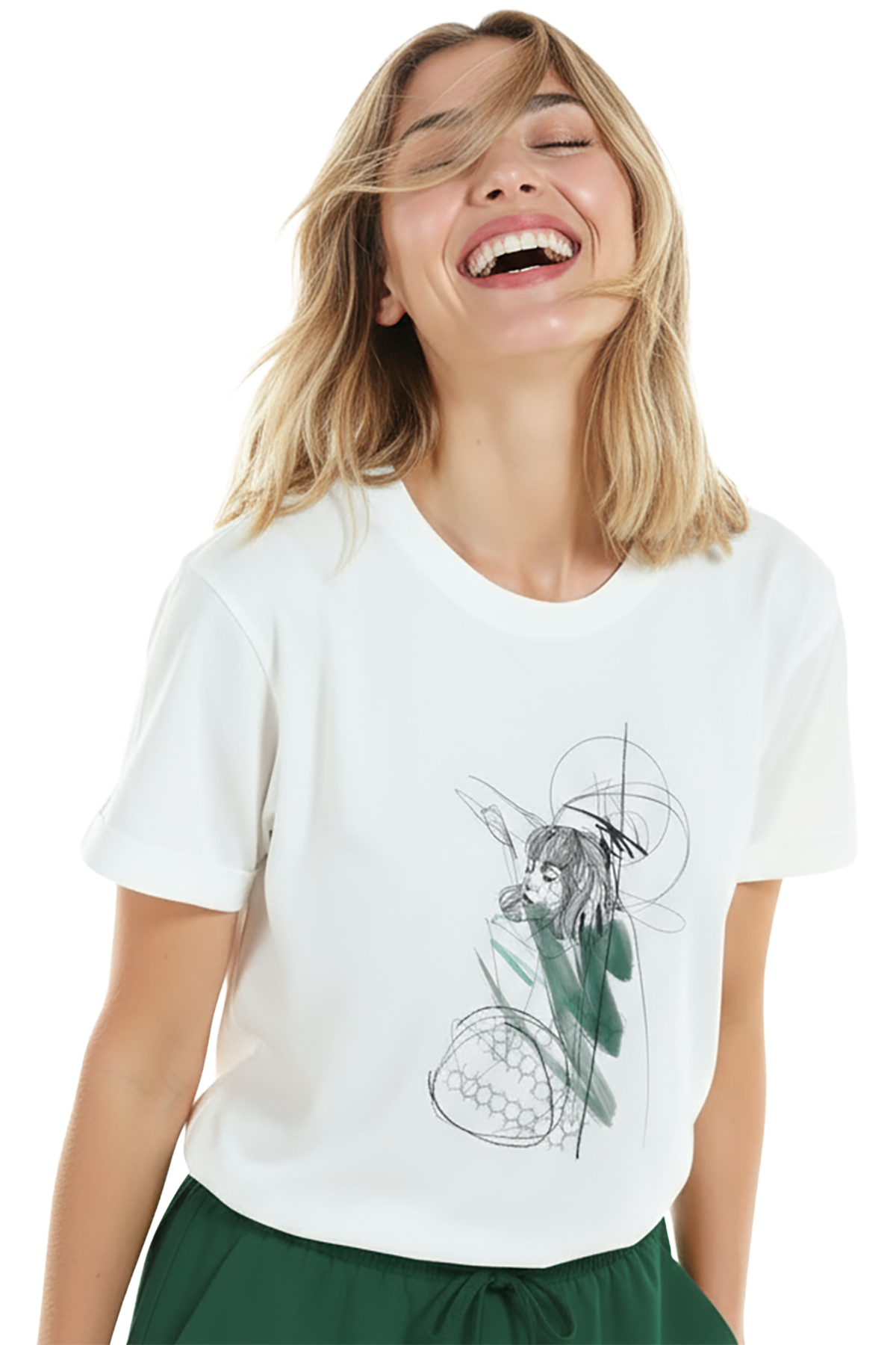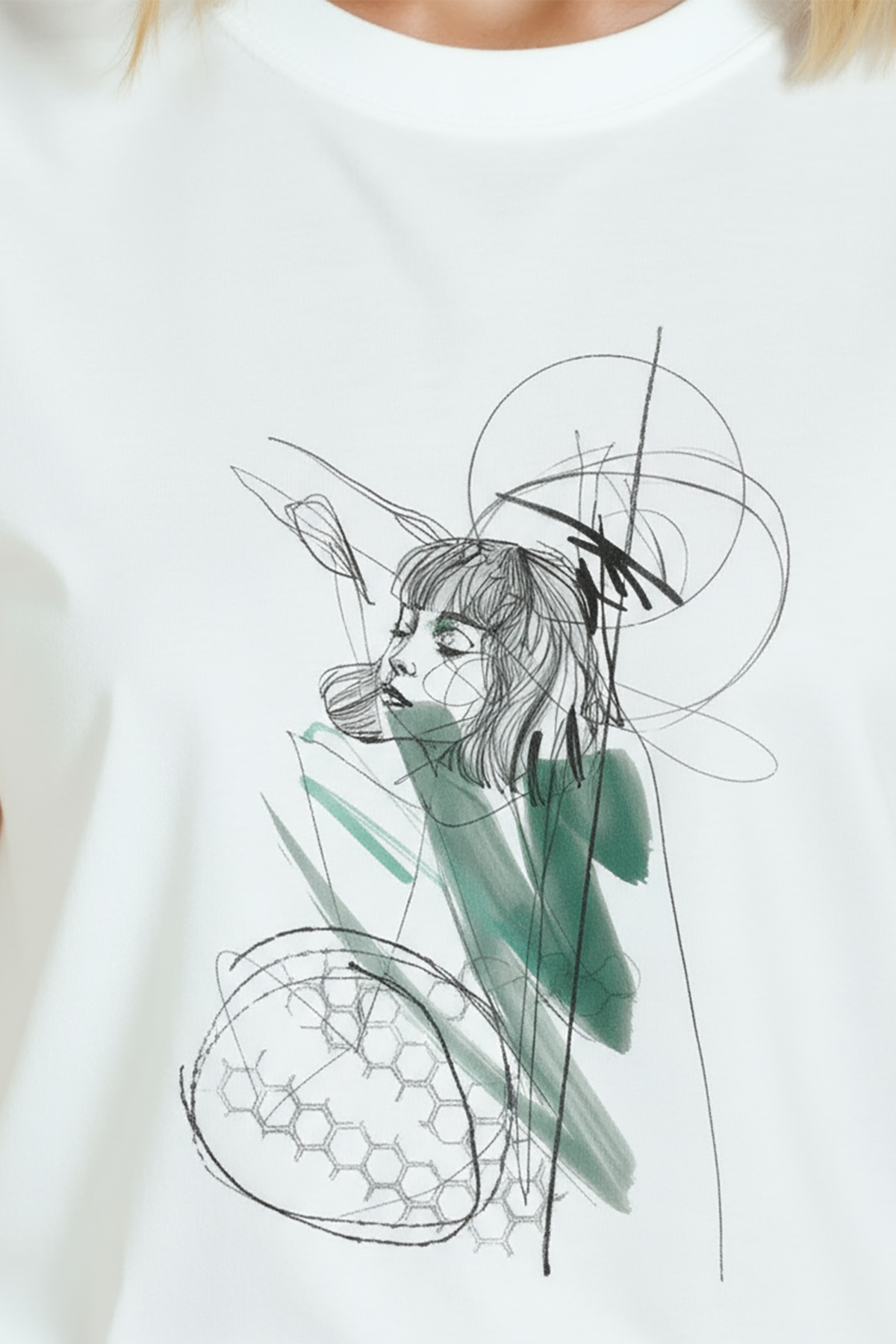 Kadın Beyaz Relaxed Fit %100 Pamuk Tişört – Çizgisel Portre & Yeşil Suluboya Vurgu Baskılı