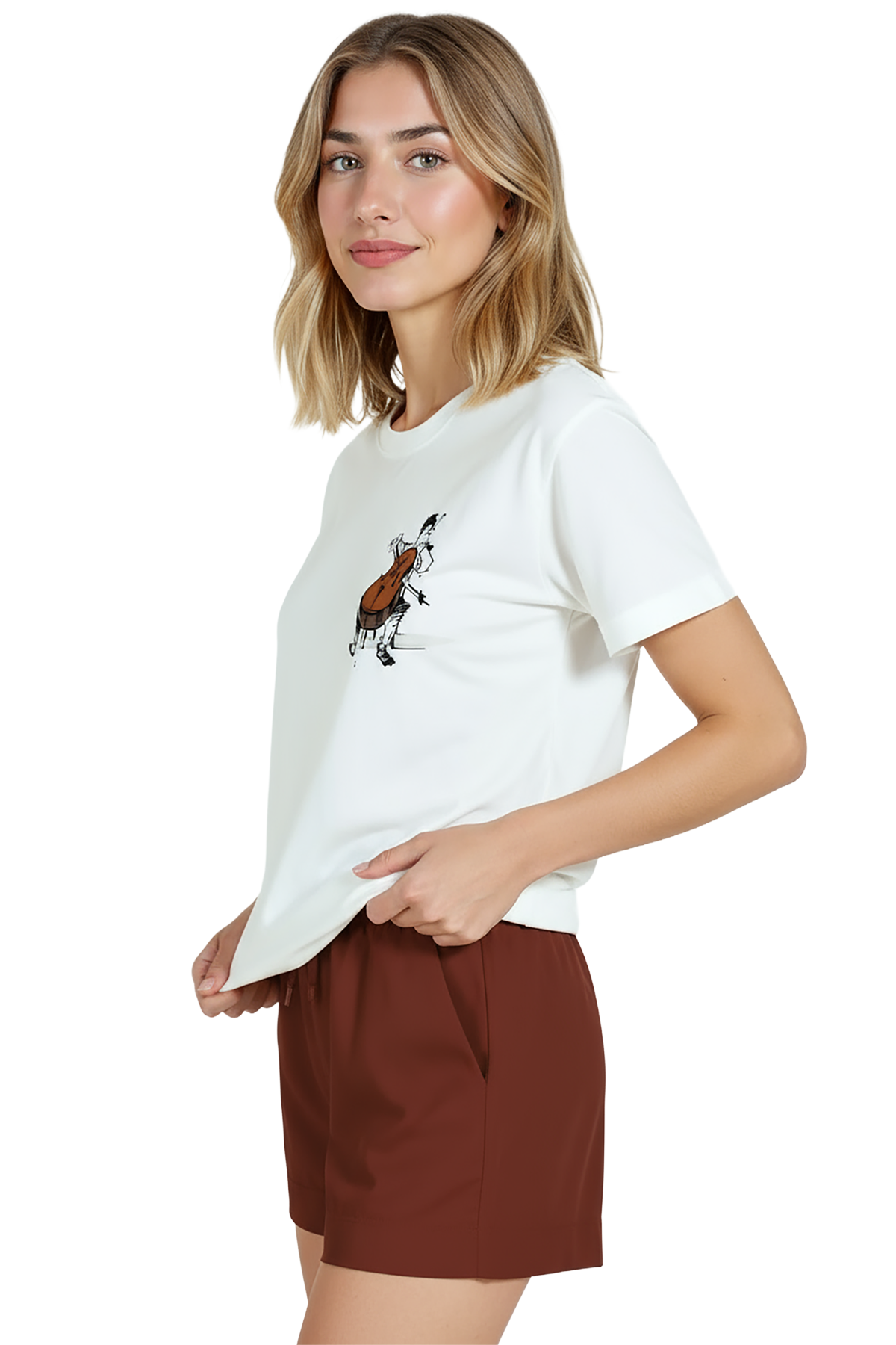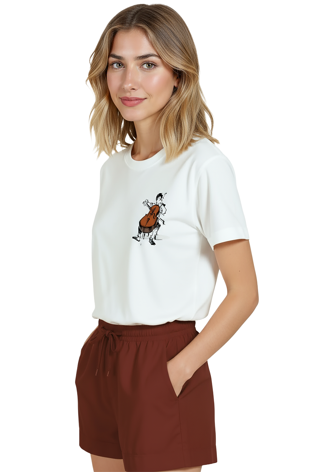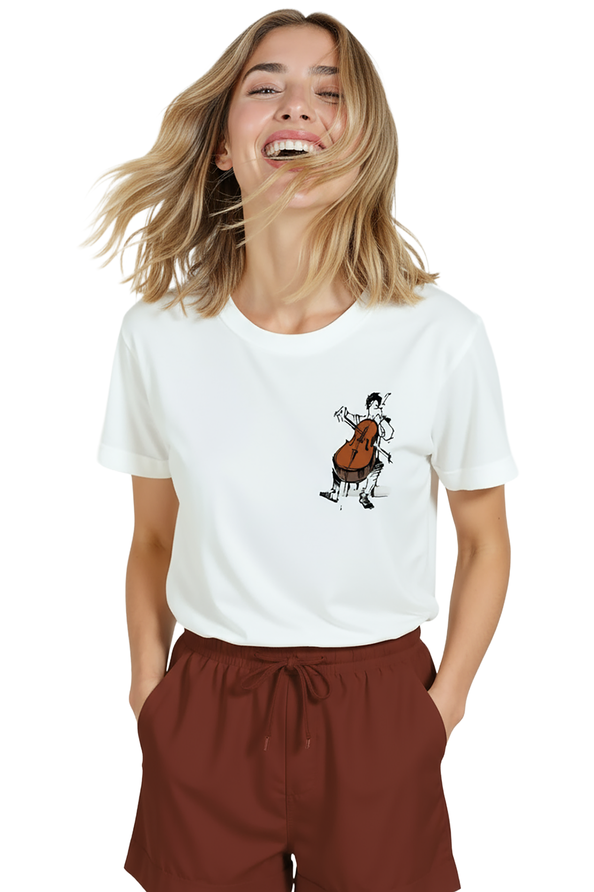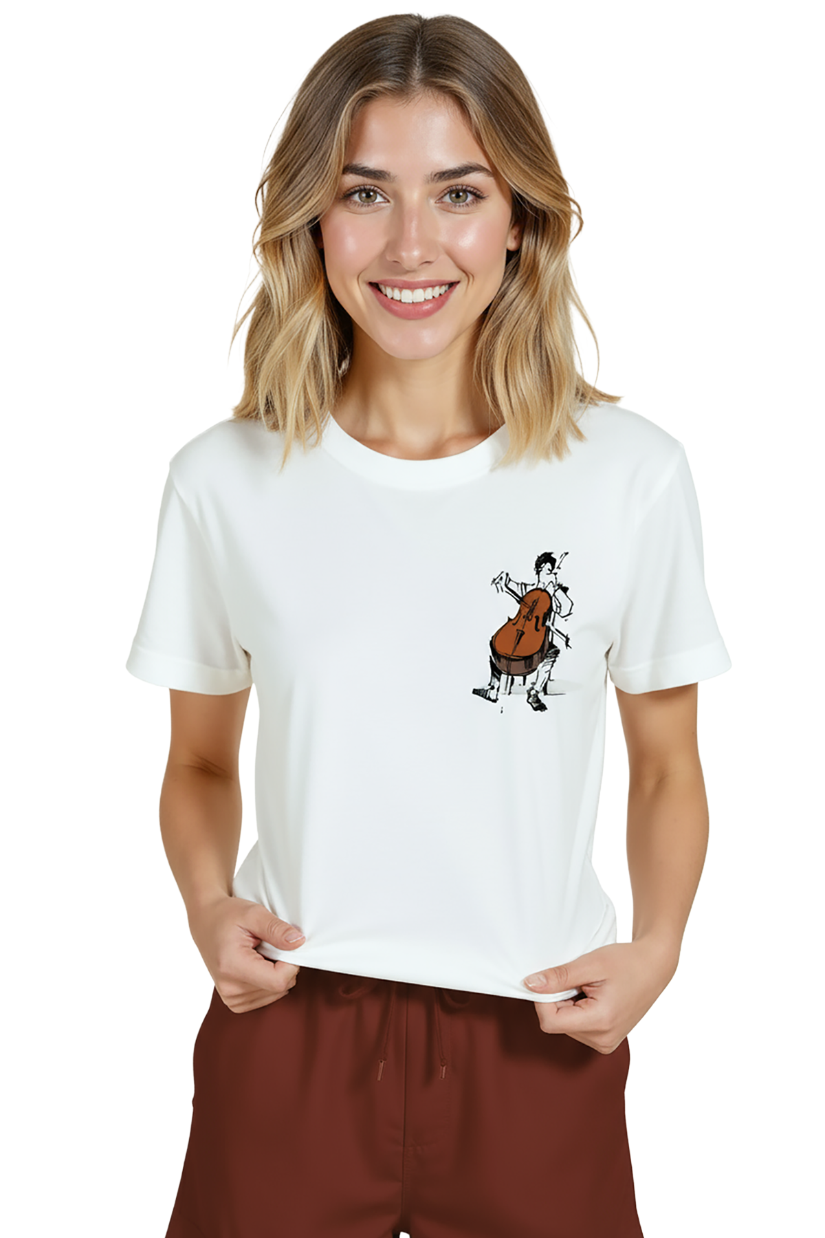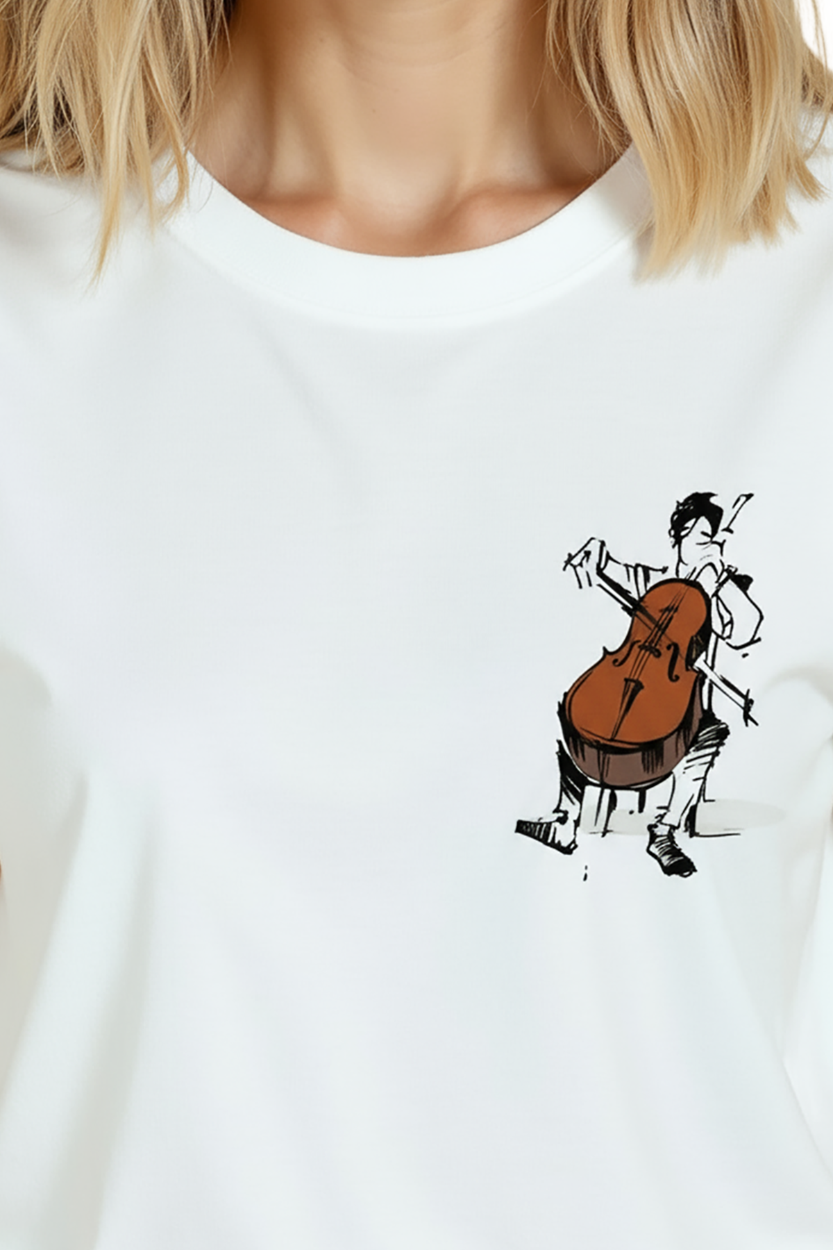 Sanat ve müzik tutkusunu bir arada sunan zarif kadın tişörtü. Bu beyaz relaxed fit kadın tişört, ön göğsün sağ tarafında yer alan çizgisel mürekkep viyolonsel ve müzisyen illüstrasyonu ile minimal ve duygusal bir ifade sağlar. Ürün %100 pamuk kumaştan üretilmiştir ve relaxed fit kadın kesim sayesinde gün boyu konfor, nefes alabilirlik ve rahat hareket sunar. Grafik yüksek çözünürlüklü dijital baskı ile uygulanmış; ince çizgi detayları ve sıcak kahverengi enstrüman vurgusu uzun süre korunur. Günlük şehir kombinleri, kafe‑stil ve smart‑casual kullanımlar için ideal, sanat‑odaklı gardıroplara güçlü bir ek.