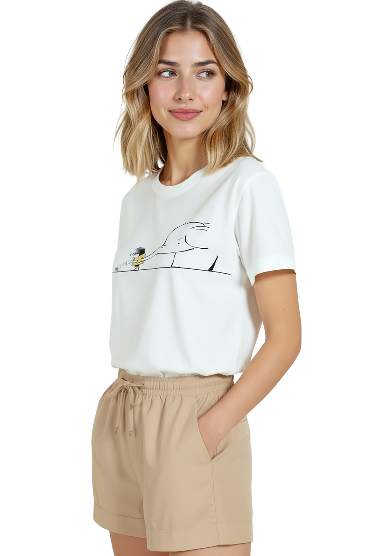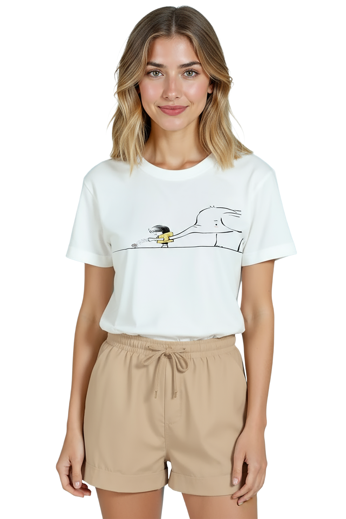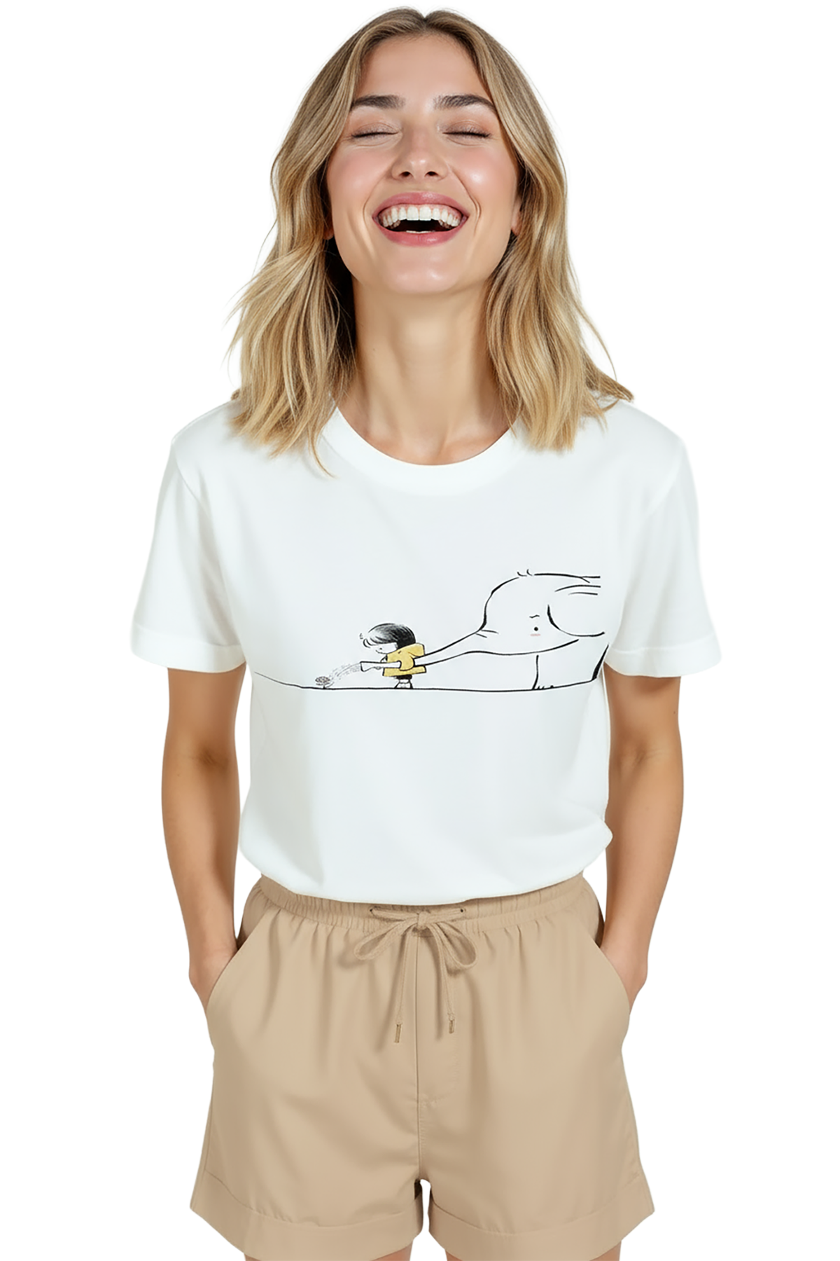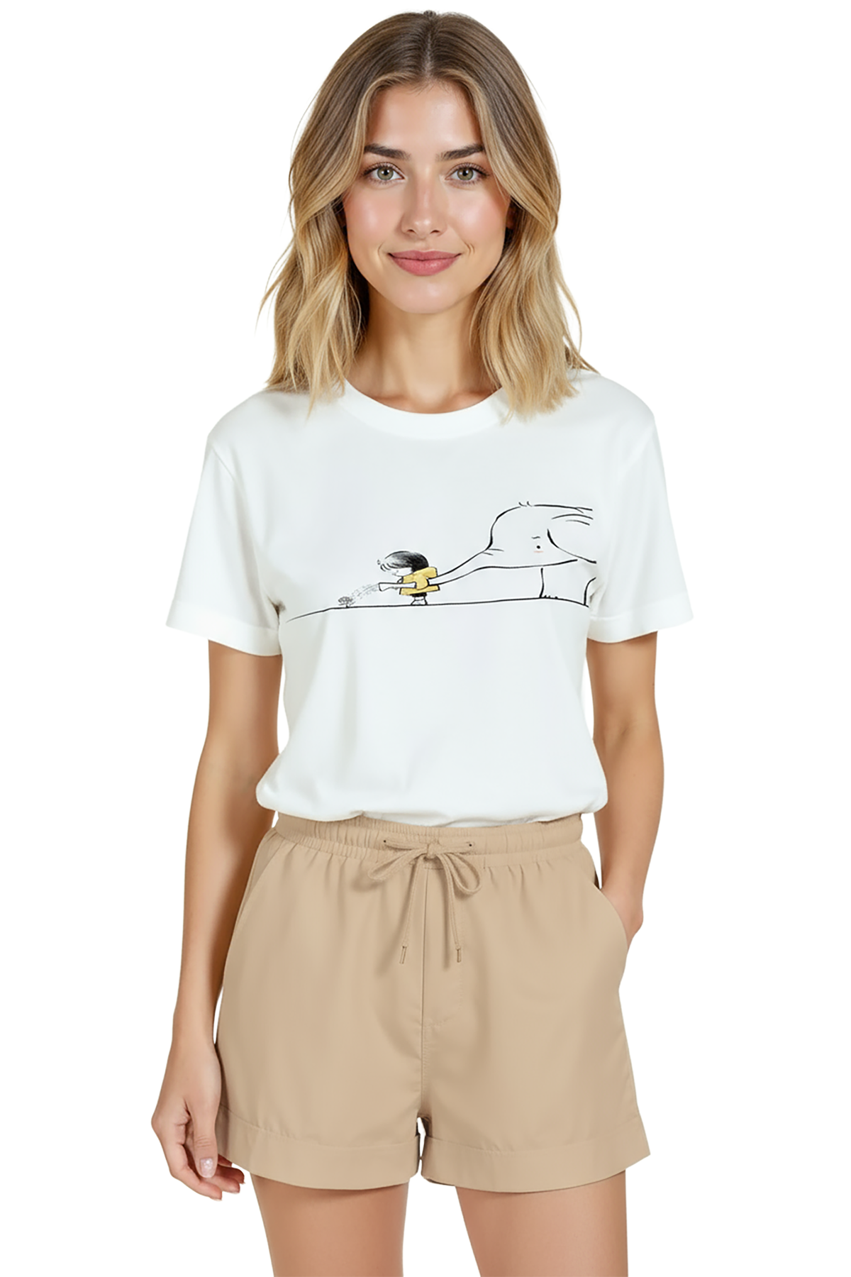 Sanat ve naif hikâyeyi bir arada sunan kadın tişörtü. Bu beyaz relaxed fit kadın tişört, ön göğüste yatay kompozisyonda yer alan çocuk ile filin birlikte bitki suladığı naif illüstrasyon ile duygusal ve samimi bir görünüm sağlar. Ürün %100 pamuk kumaştan üretilmiş olup relaxed fit kadın kesim sayesinde gün boyu konfor, nefes alabilirlik ve rahat hareket özgürlüğü sunar. İnce mürekkep çizgileri ve sıcak sarı suluboya vurgusu tasarıma el‑çizimi hissi verir; baskı yüksek çözünürlüklü dijital baskı ile uygulanmıştır ve detaylar uzun süre korunur. Günlük şehir kombinleri, kafe‑stili ve hediye seçenekleri için ideal, naif‑sanat odaklı bir parçadır.