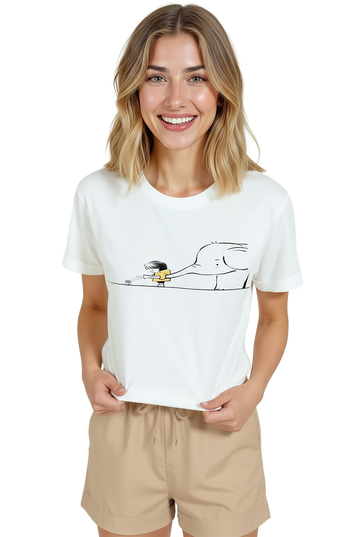 Kadın Beyaz Relaxed Fit %100 Pamuk Tişört – Çocuk & Fil Sulama İllüstrasyonlu