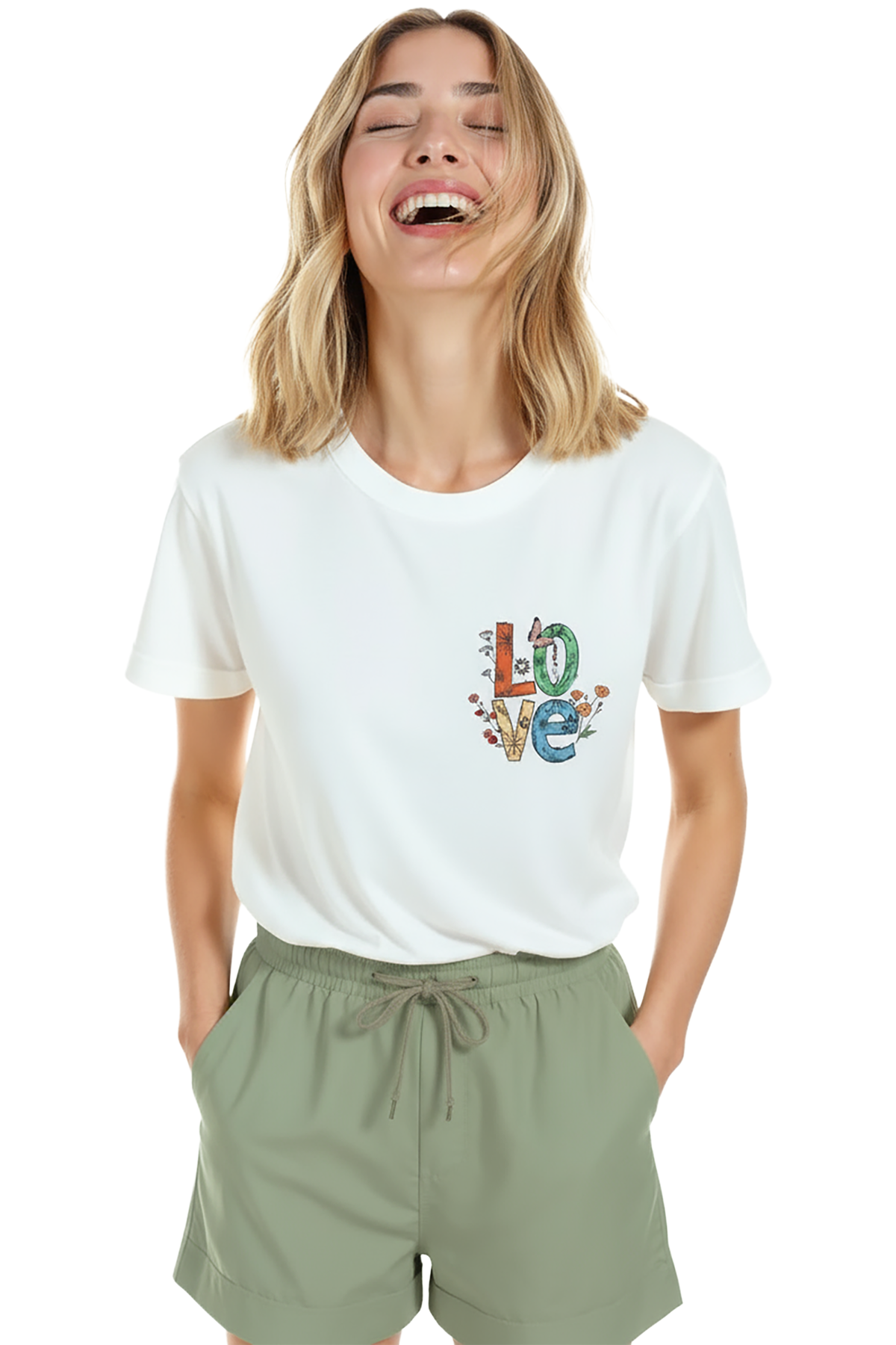 Minimal ve duygusal bir dokunuş sunan kadın tişörtü. Bu beyaz relaxed fit kadın tişört, sağ göğüste yer alan suluboya ve ince karakalem detaylı “LOVE” harfleri ile zarif, doğal bir ifade sağlar. Her harf botanik öğelerle süslenmiş; pastel tonlar ve hafif eskiz dokusu günlük ve smart‑casual kombinlere yumuşak bir vurgu katar. Ürün %100 pamuk kumaştan üretilmiştir; relaxed fit kadın kesim sayesinde hareket özgürlüğü, nefes alabilirlik ve gün boyu konfor sunar. Baskı küçük‑orta göğüs konumunda, yüksek çözünürlüklü dijital baskı ile uygulanmış; renk geçişleri ve ince çizgiler uzun süre canlı kalır. Hediye, kafe‑stil ve tatil gardıropları için ideal, minimal ama anlamlı bir parça.