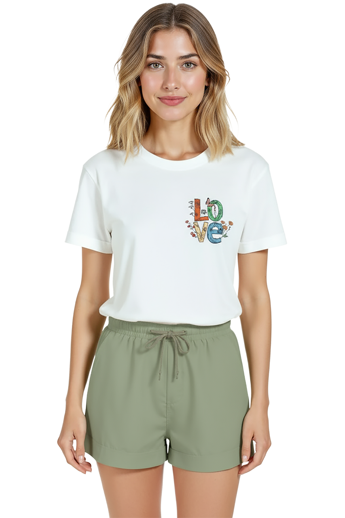 Kadın Beyaz Relaxed Fit %100 Pamuk Tişört – Floral “LOVE” Minyatür Suluboya Baskılı