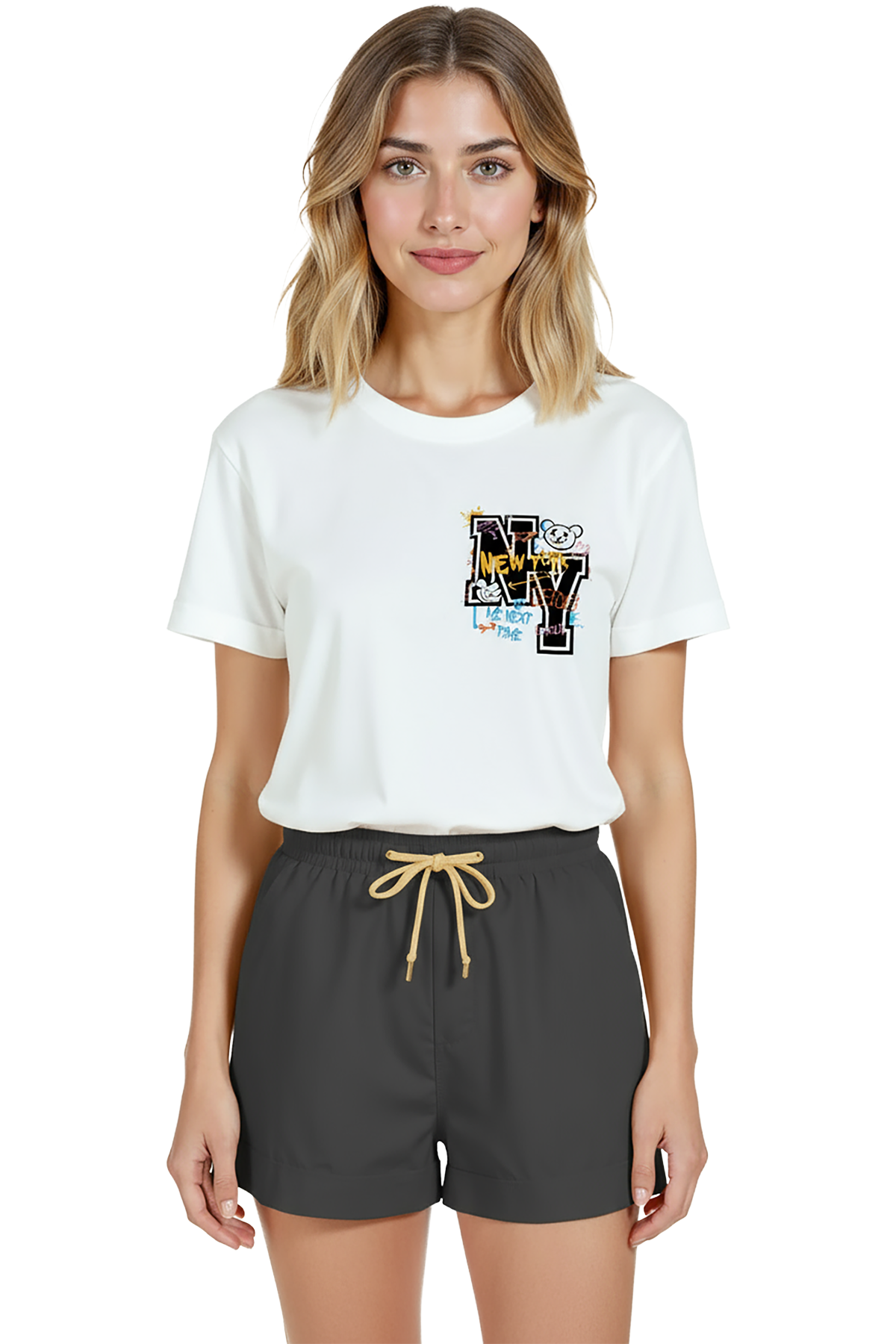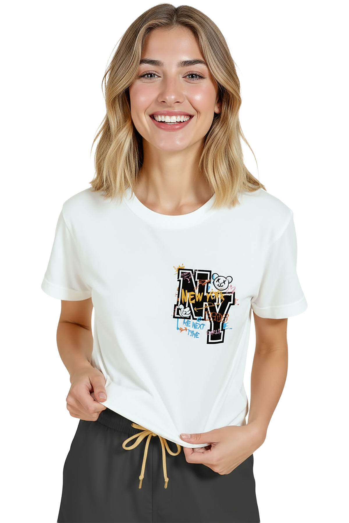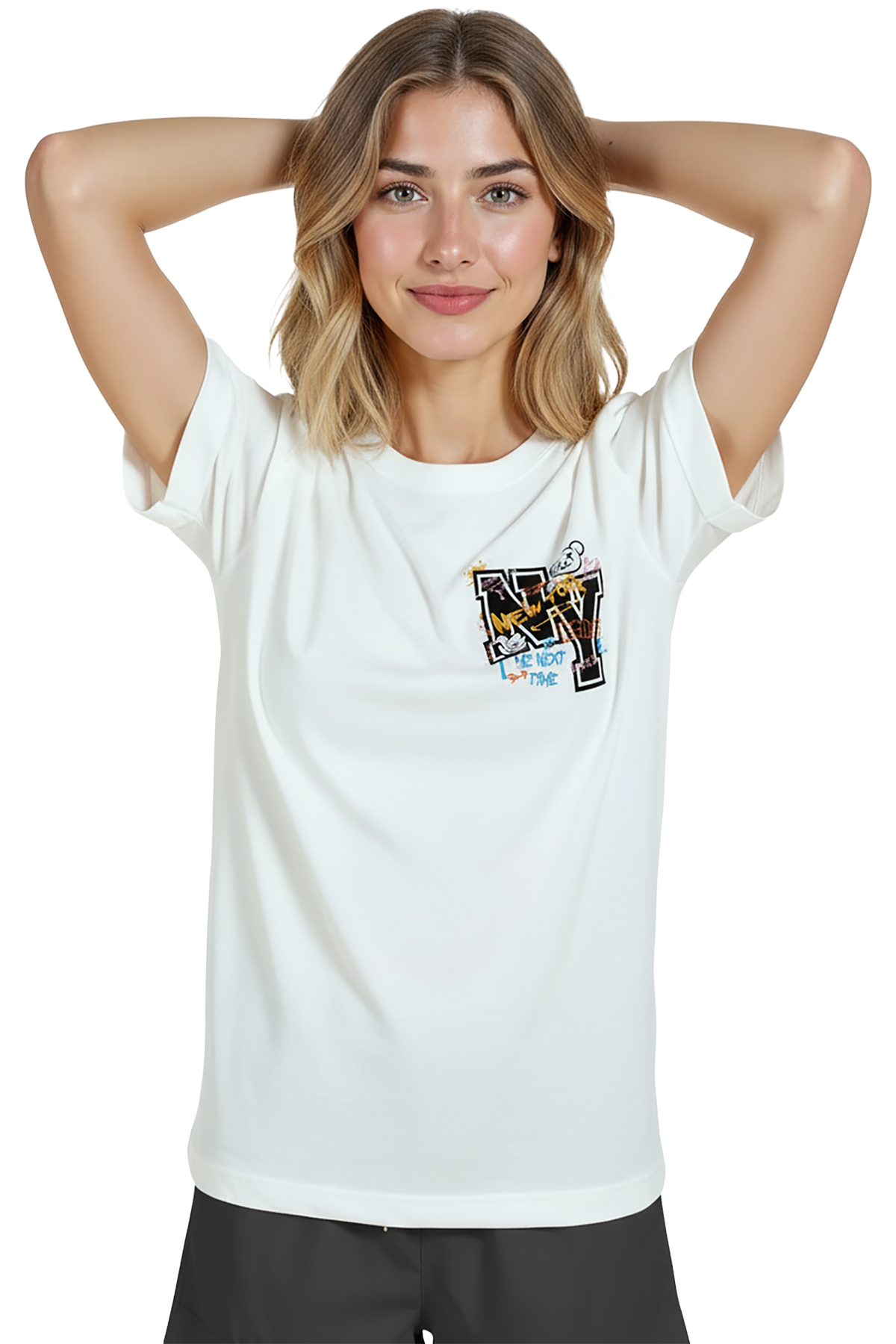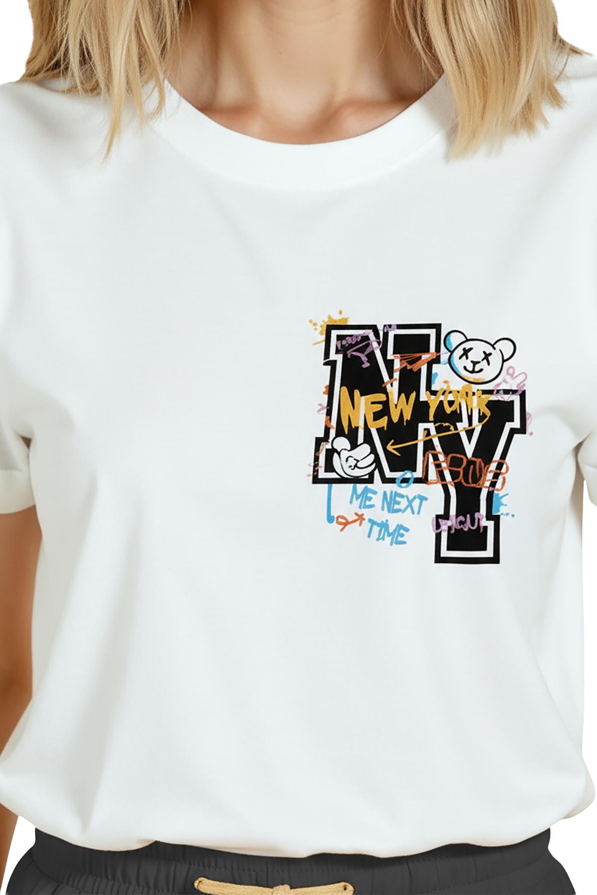 Genç ve şehirli bir ifade sunan kadın tişörtü. Bu beyaz relaxed fit (kadın kesim) tişört, sağ göğüste yer alan grafiti‑stil “NY” tipografisi, renkli suluboya sıçramaları ve küçük teddy bear / doodle detaylarıyla dikkat çeker. Ürün %100 pamuk kumaştan üretilmiş olup relaxed fit kadın kesim sayesinde gün boyu konfor, nefes alabilirlik ve hareket özgürlüğü sağlar. Baskı küçük‑cep/pocket hizasında, yüksek çözünürlüklü dijital baskı ile uygulanmış; sokak estetiği ve yumuşak renk vurguları uzun süre korunur. Günlük şehir kombinleri, streetwear ve casual koleksiyonlar için ideal, hediye seçenekleri arasında öne çıkan bir parça.