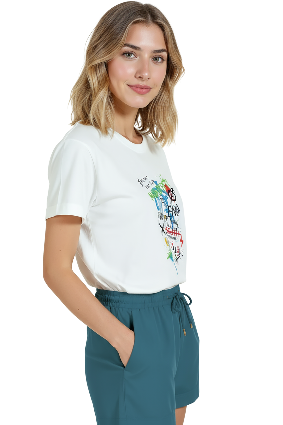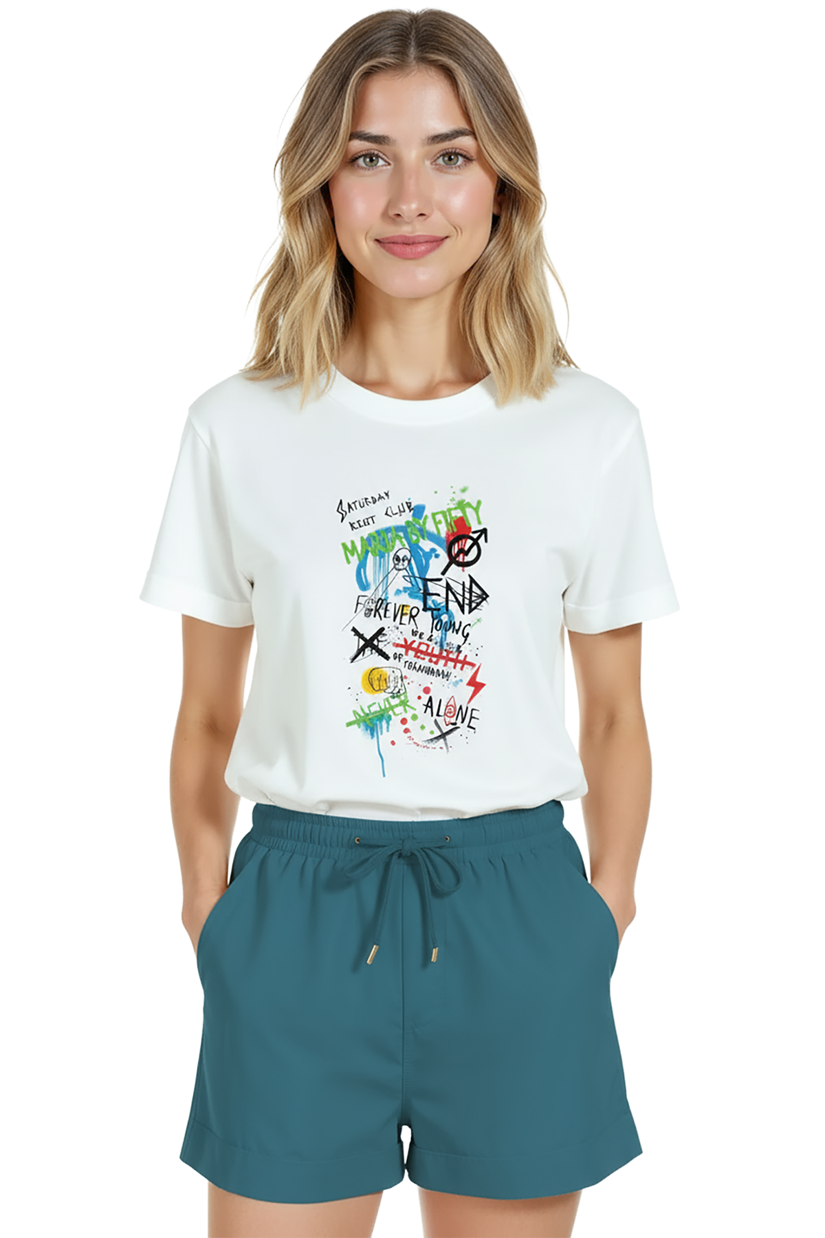 - Petrol/teal veya bordo şort / chino + siyah/kontrast sneaker — baskıdaki renklerle uyum