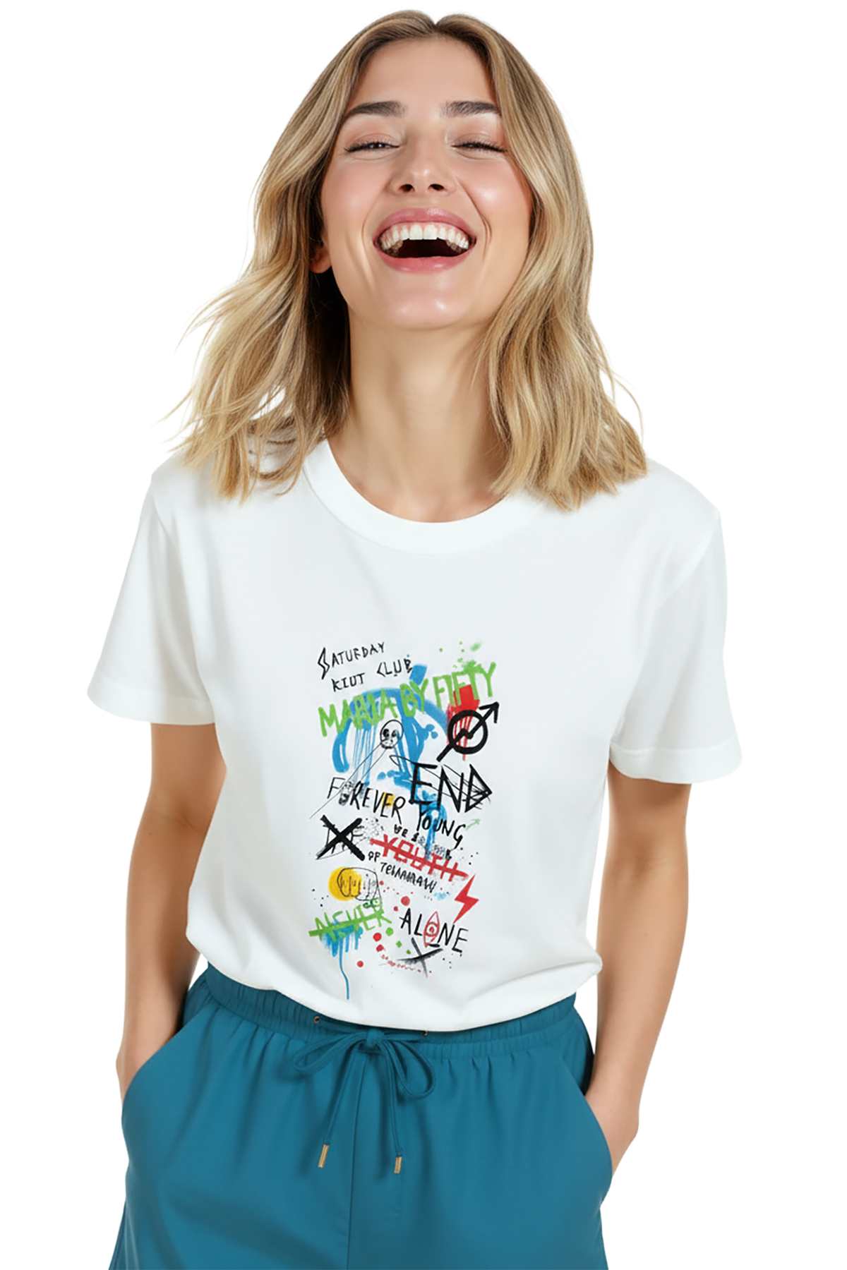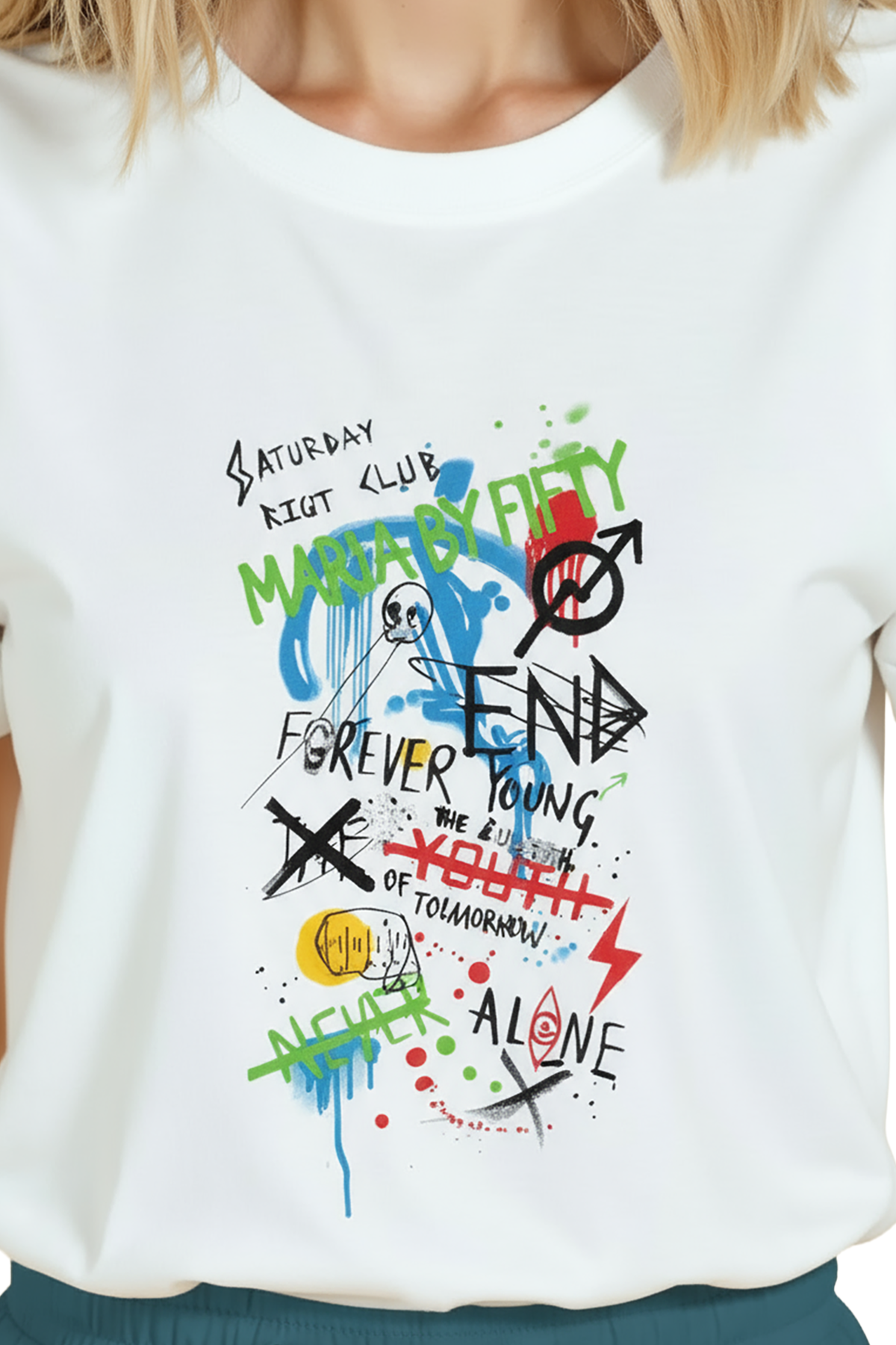 Şehir ruhunu ve sokak sanatını taşıyan şık kadın tişörtü. Bu beyaz relaxed fit kadın tişört, ön göğüste yer alan grafiti‑stil tipografi, drip/spray efektleri ve el çizimi ikonlar ile güçlü bir urban estetik sunar. Ürün %100 pamuk kumaştan üretilmiş olup relaxed fit kadın kesim sayesinde gün boyu konfor, nefes alabilirlik ve hareket özgürlüğü sağlar. Yüksek çözünürlüklü dijital baskı ile uygulanan kompozisyon; canlı renkler, katmanlı dokular ve ince çizgi detaylarıyla kombinlerde merkez parça olur. Günlük streetwear, festival ve kafe‑stil kullanımları için ideal.