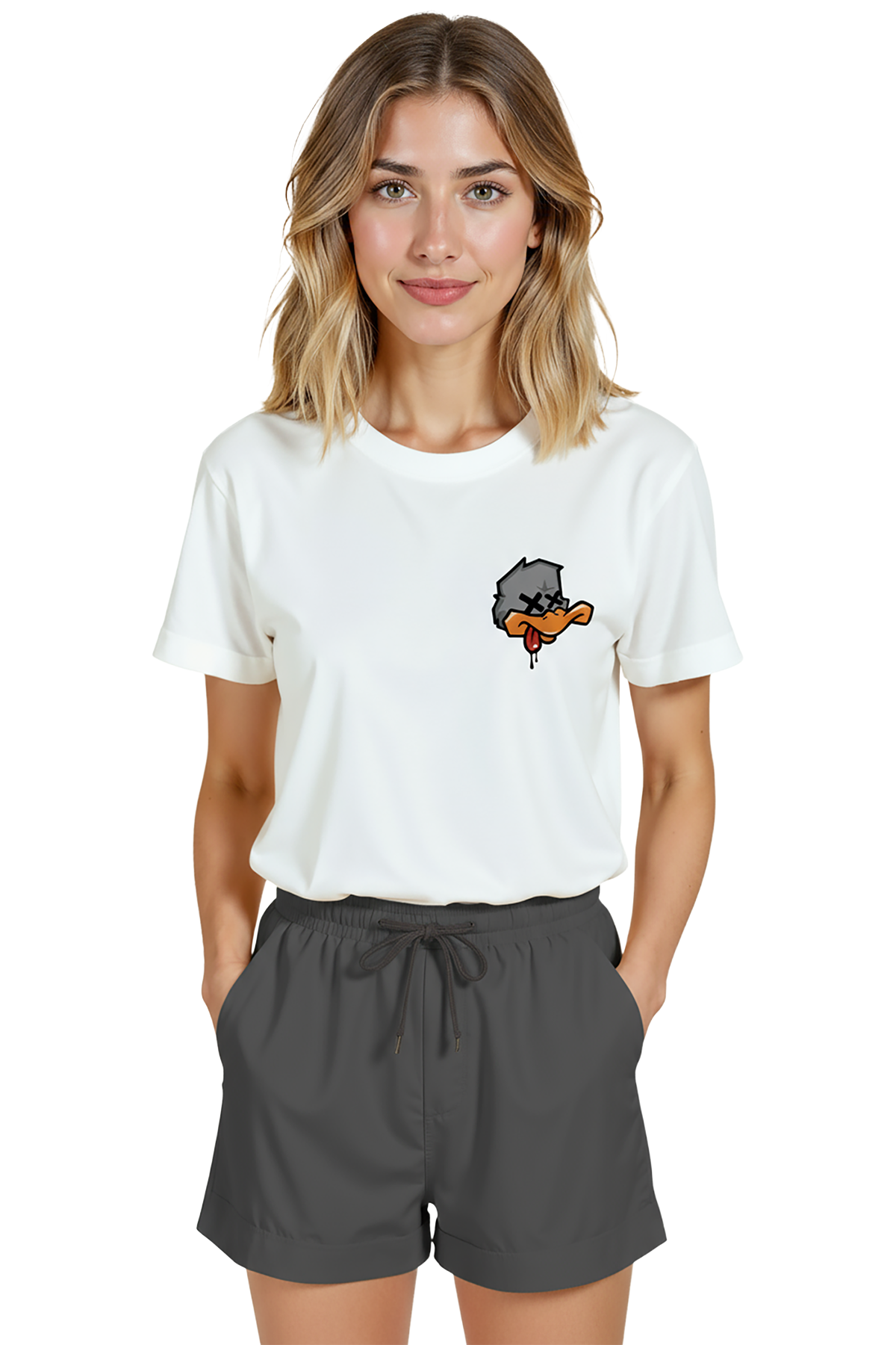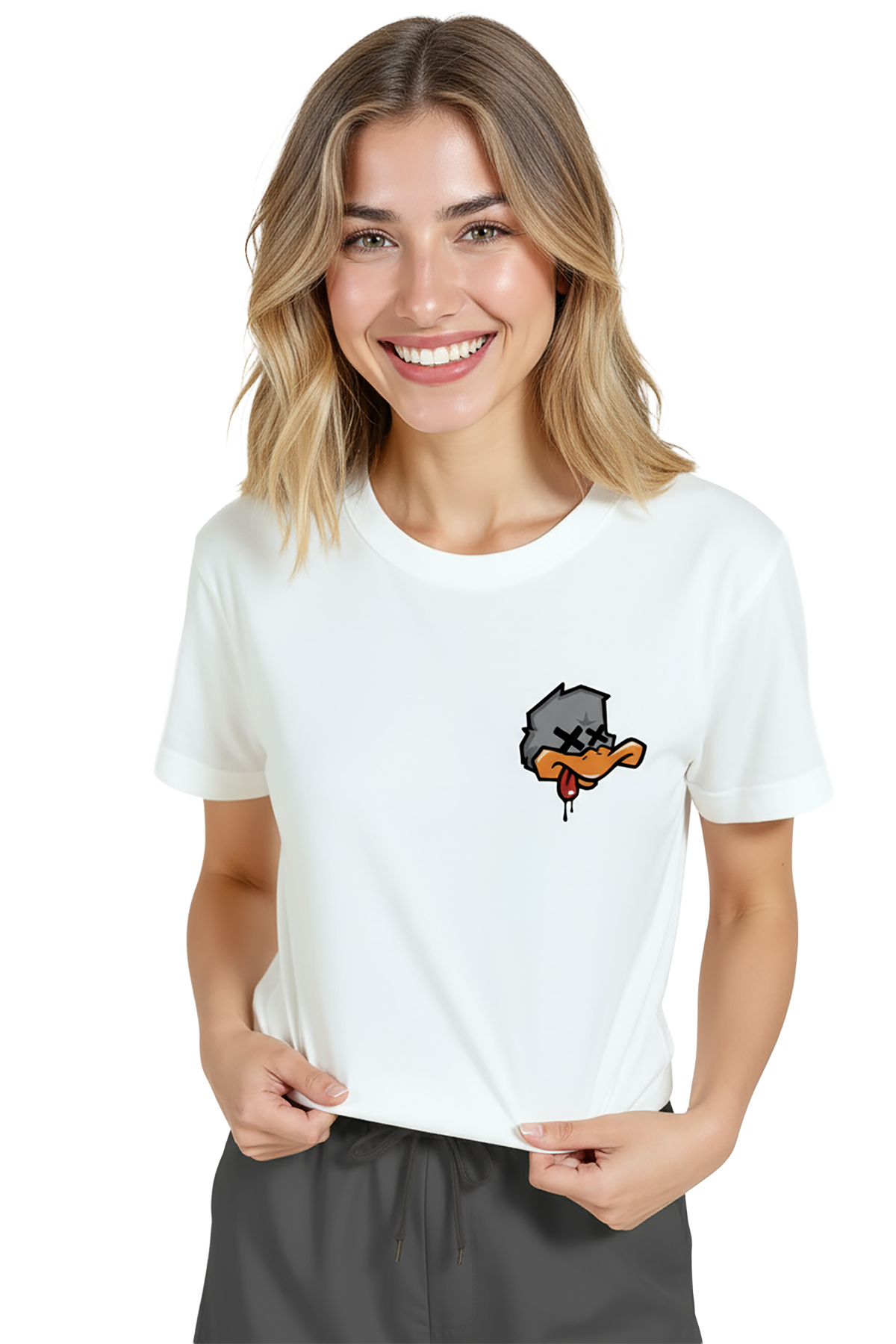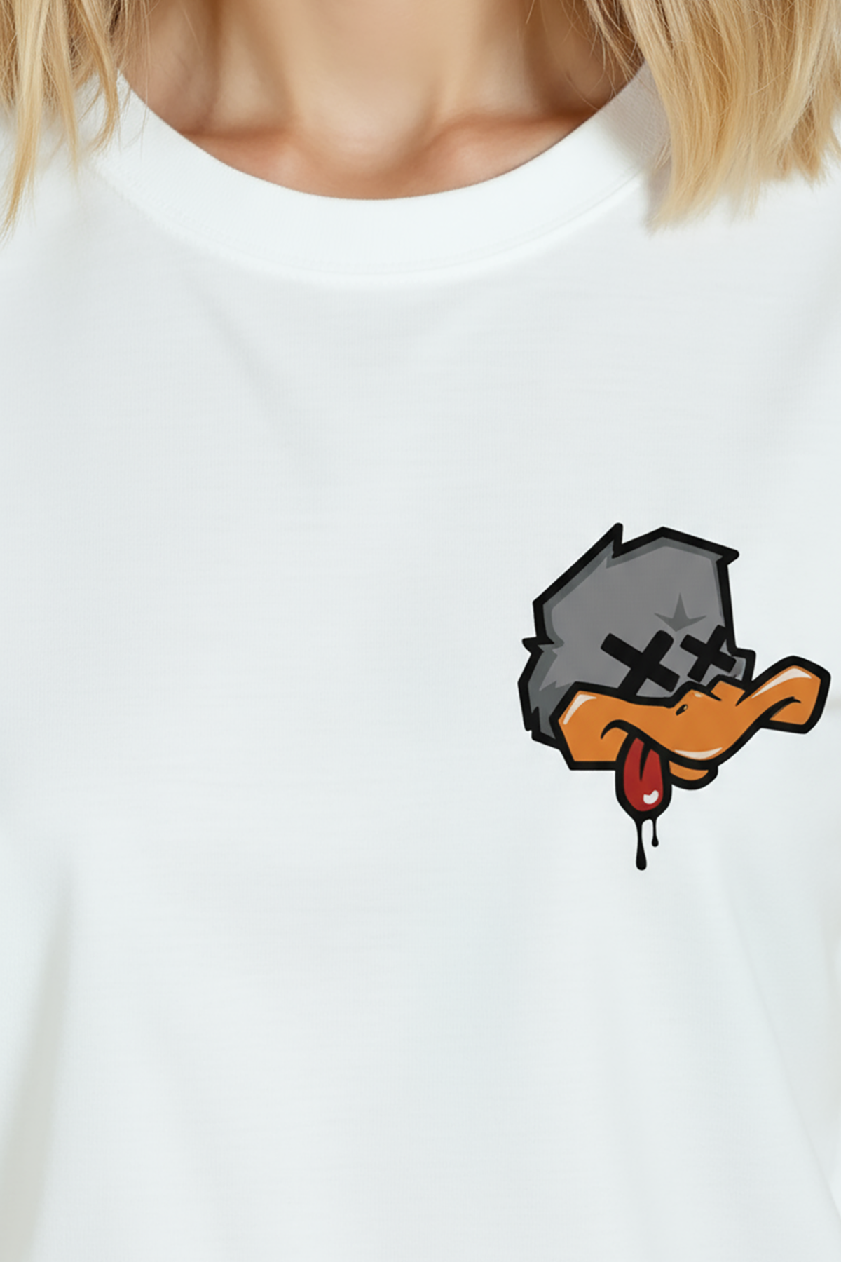Sanat ve sokak estetiğini bir arada sunan enerjik kadın tişörtü. Bu beyaz relaxed fit kadın tişört, ön göğüs üstünde yer alan minimal grafiti‑stil ördek kafa illüstrasyonu ile modern ve dikkat çekici bir görsel sunar; küçük chest‑print konumu günlük kombinlerde şık bir vurgu sağlar. Ürün %100 pamuk kumaştan üretilmiş olup relaxed fit kadın kesim sayesinde gün boyu konfor, nefes alabilirlik ve rahat hareket sunar. Baskı yüksek çözünürlüklü dijital baskı ile uygulanmış; canlı renk kontrastları ve siyah kontur çizgileri uzun süre net kalır. Streetwear, casual ve smart‑casual kombinlere uyumlu, genç ve dinamik gardıroplar için ideal bir parça.
