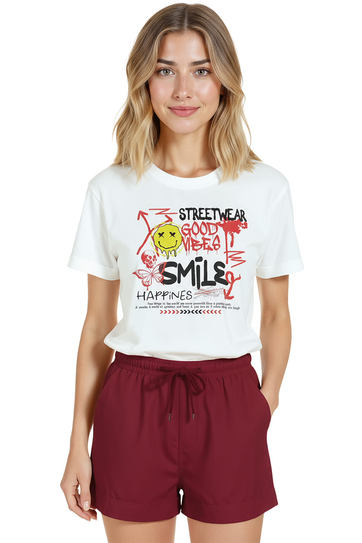 Kadın Beyaz Relaxed Fit %100 Pamuk Tişört – Grafiti Smile & Good Vibes Baskılı