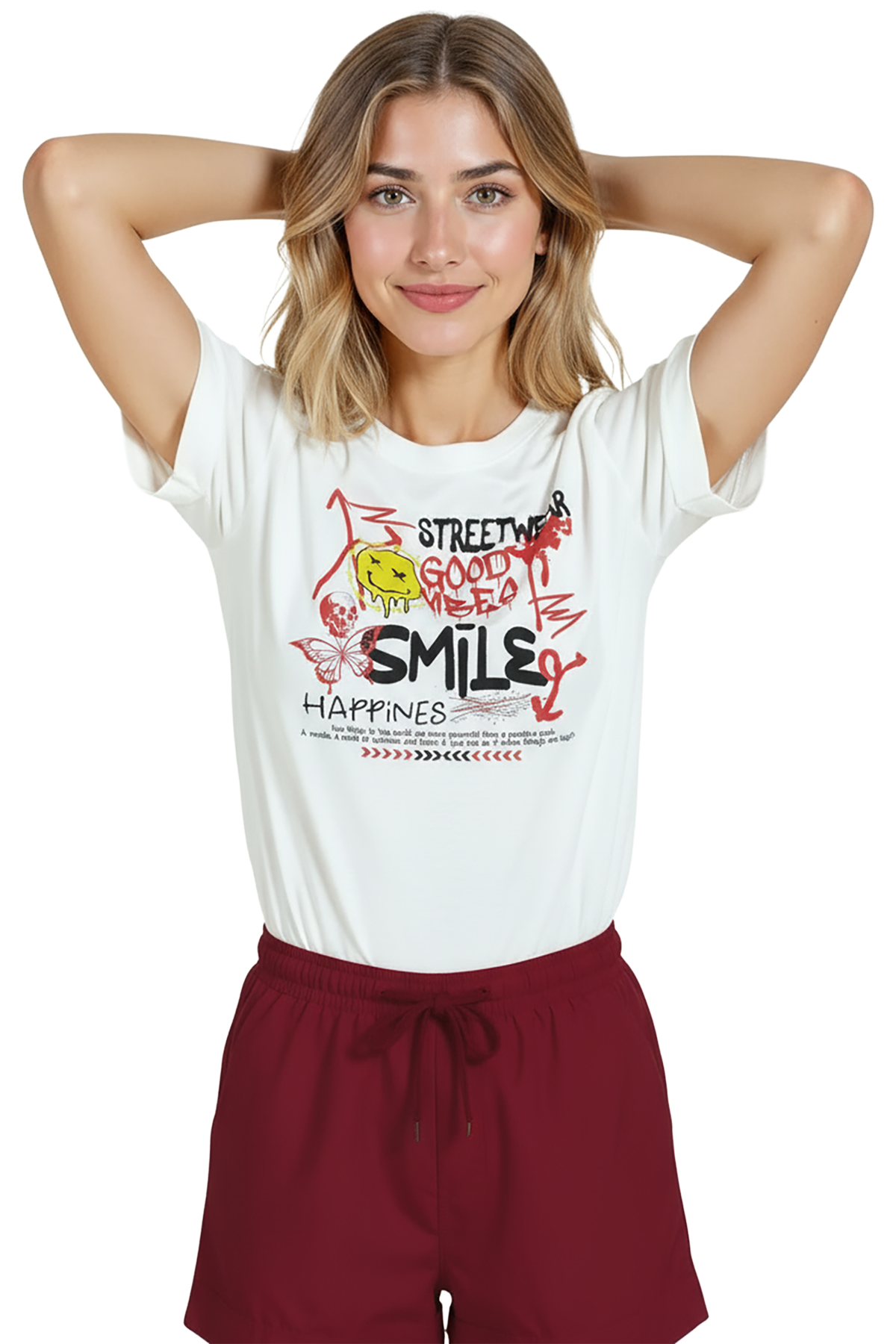 Sanat‑odaklı, sokak ruhunu taşıyan kadın tişörtü. Bu beyaz relaxed fit kadın tişört, ön göğüste yer alan grafiti stilinde “SMILE / GOOD VIBES” kompozisyonu, eriyen sarı smiley ikonu, kelebek ve drip/brush efektleri ile enerjik, genç ve şehirli bir görünüm sunar. Ürün %100 pamuk kumaştan üretilmiş olup relaxed fit kadın kesim sayesinde gün boyu konfor, nefes alabilirlik ve rahat hareket sağlar. Tasarım yüksek çözünürlüklü dijital baskı ile uygulanmış; canlı renk geçişleri ve sokak estetiği detayları uzun süre korunur. Günlük streetwear kombinler, festival ve kafe‑stil kullanımları için ideal bir parça.