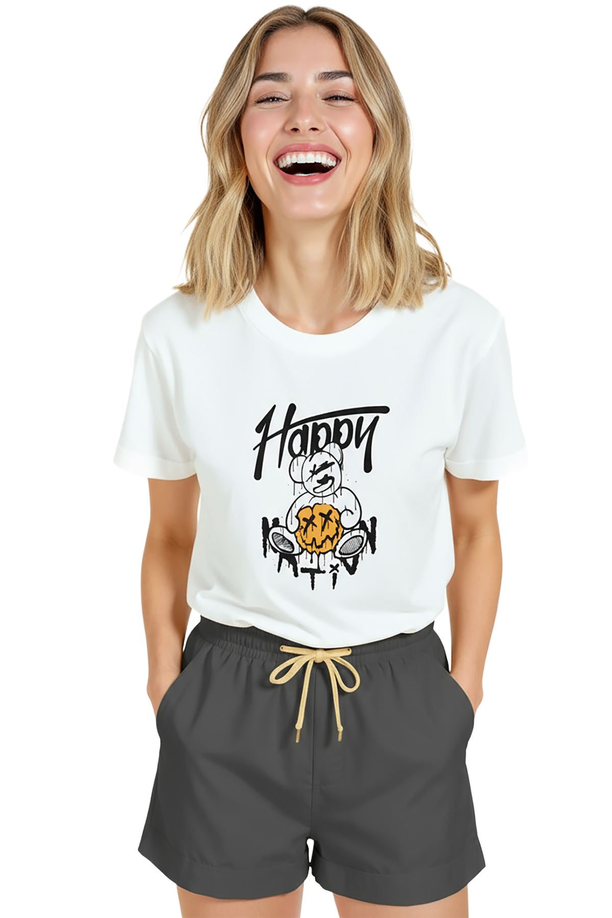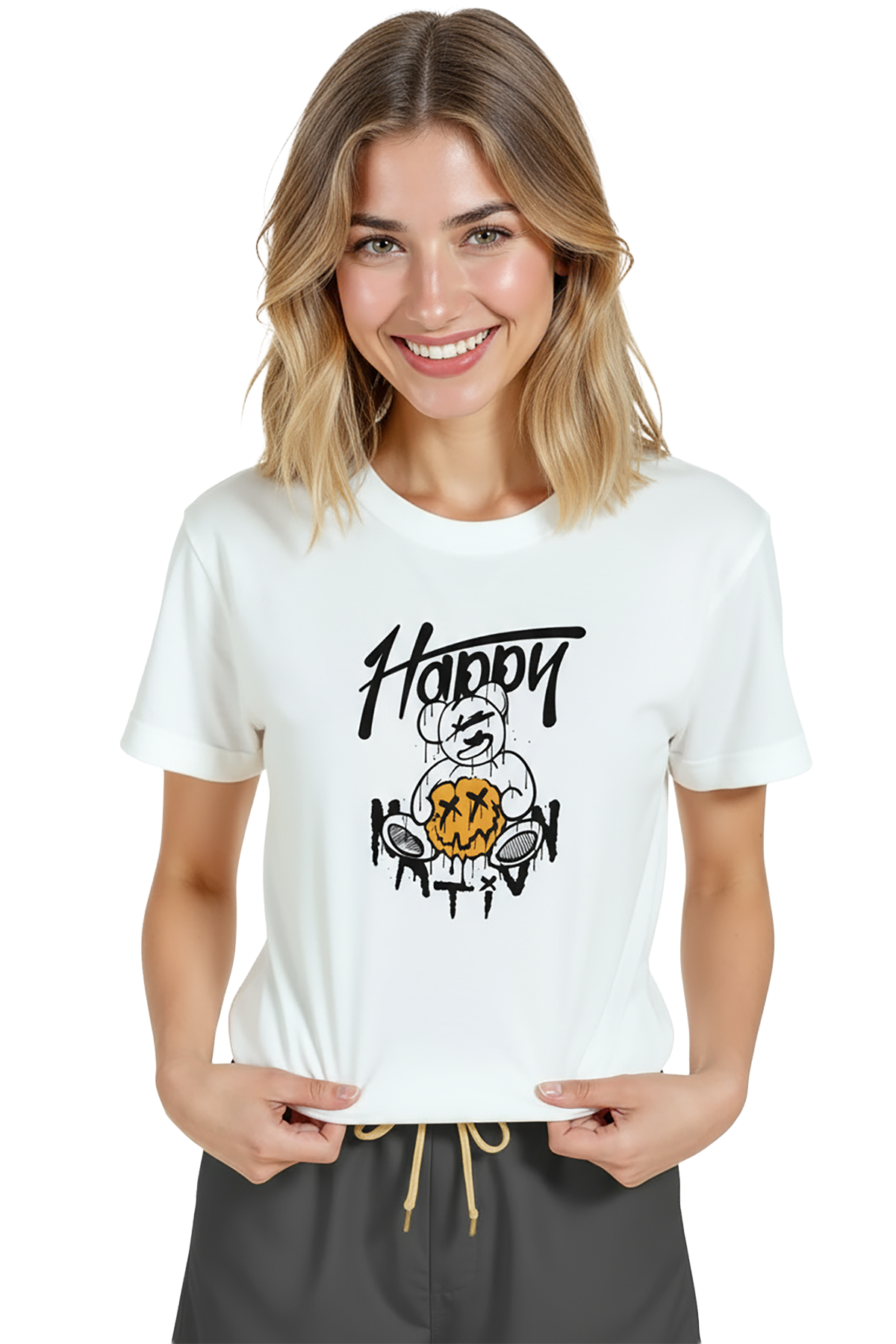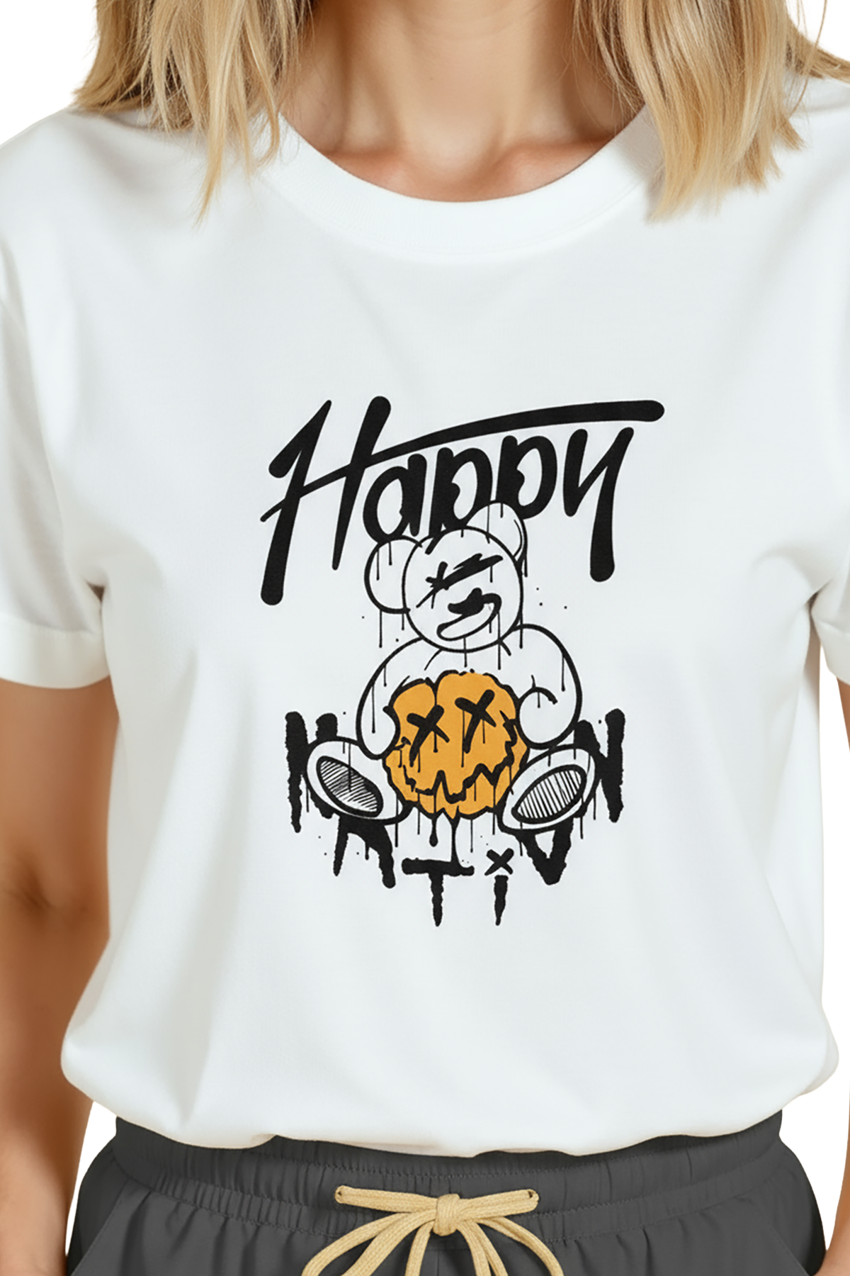 Sokak stili ve sanatçı ruhunu bir arada sunan kadın tişörtü. Bu beyaz relaxed fit kadın tişört, ön göğüste yer alan grafiti tarzı teddy ayı illüstrasyonu ve merkezi drip efektli jack‑o‑lantern (kabak) görseli ile dikkat çeker. Ürün %100 pamuk kumaştan üretilmiş olup relaxed fit kadın kesim sayesinde gün boyu konfor, nefes alabilirlik ve rahat hareket sağlar. Tasarım yüksek çözünürlüklü dijital baskı ile uygulanmıştır; siyah mürekkep çizgileri ve sarı‑turuncu vurgular uzun süre canlı kalır. Genç, şehirli ve street‑casual kombinlerin merkez parçası olarak ideal; hediye ve koleksiyon ürünleri arasında öne çıkar.