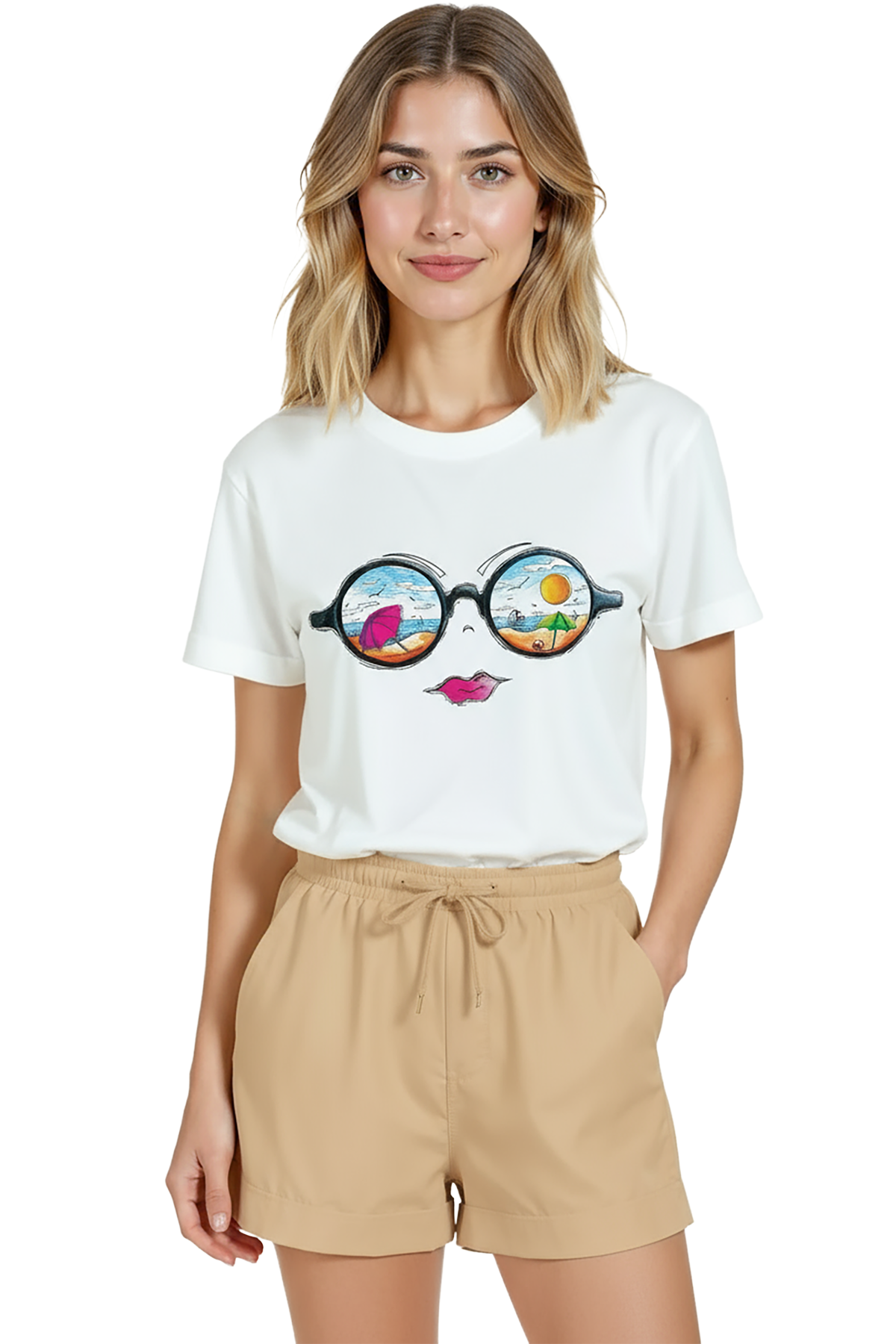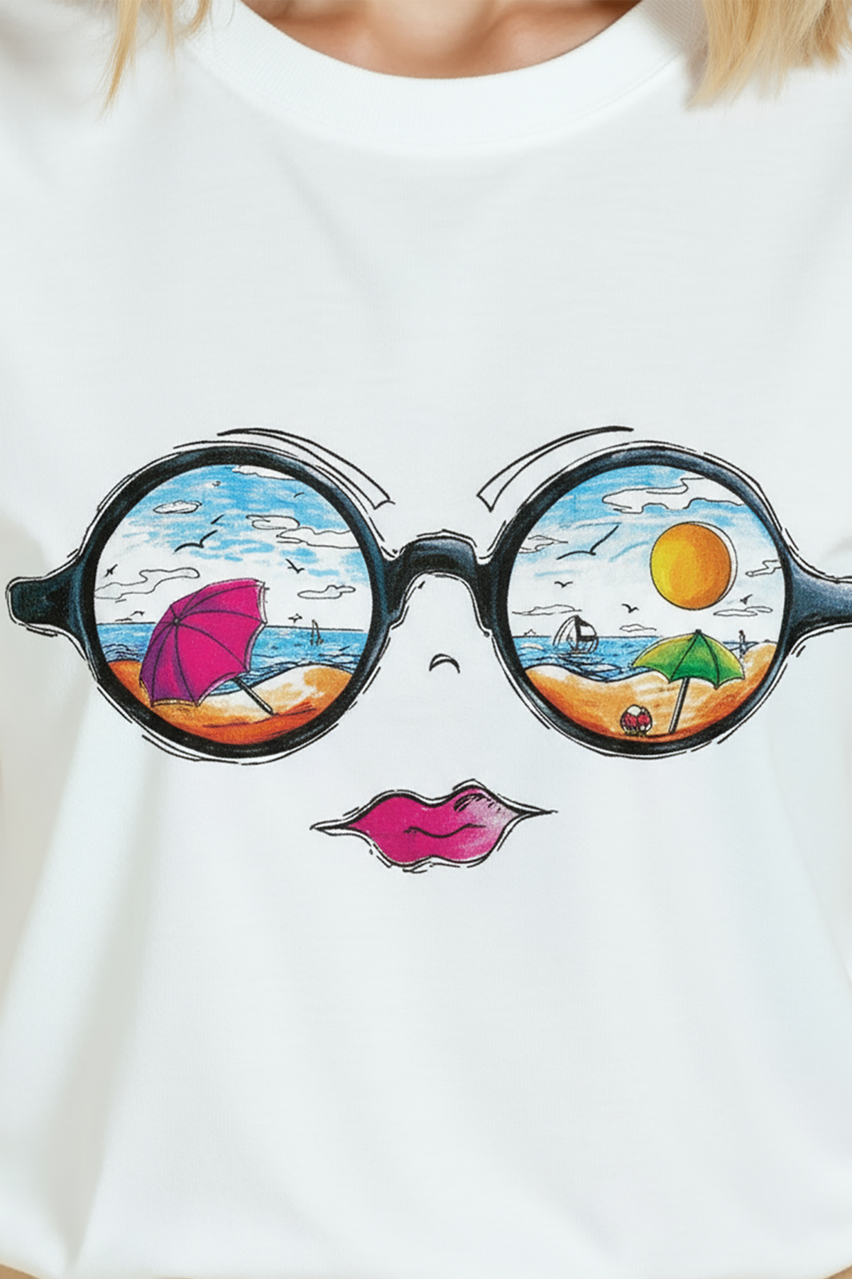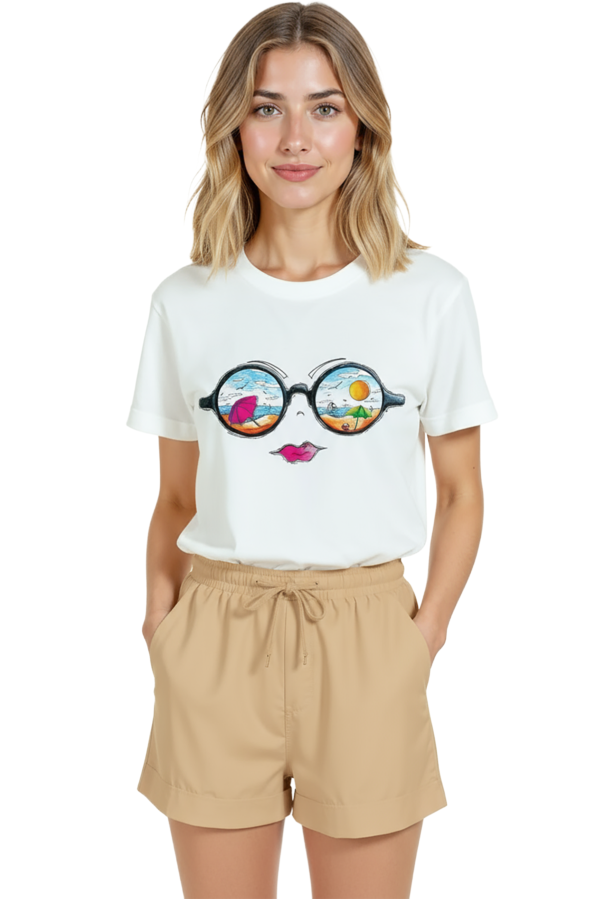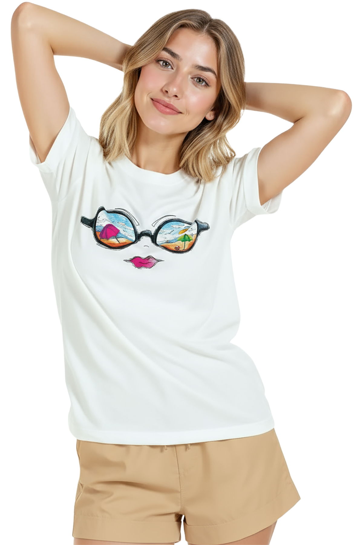 Kadın Beyaz Relaxed Fit %100 Pamuk Tişört – Güneşli Plaj & Gözlük Refleksi Baskılı