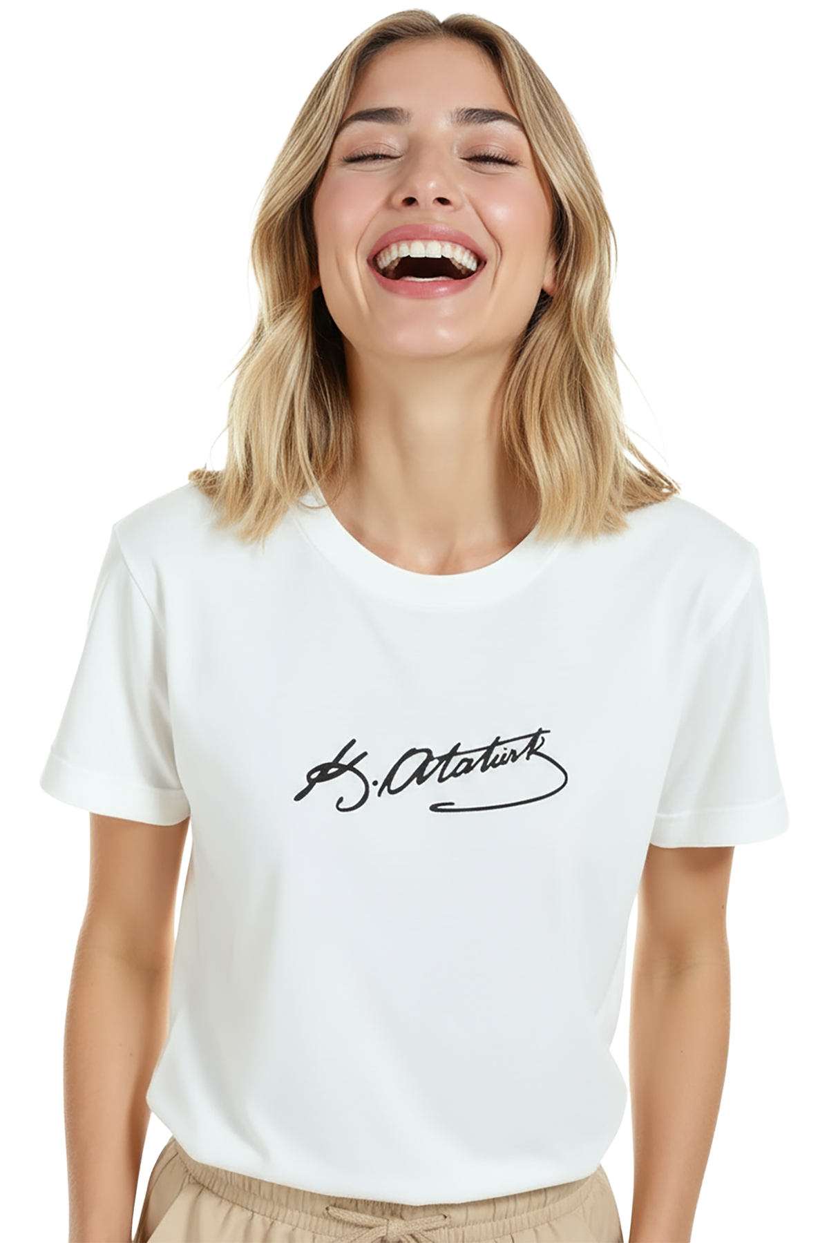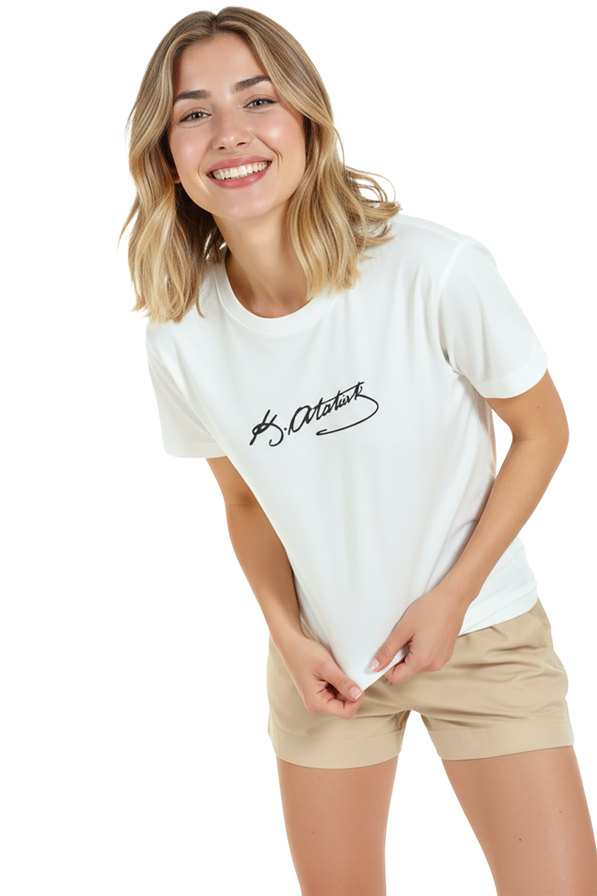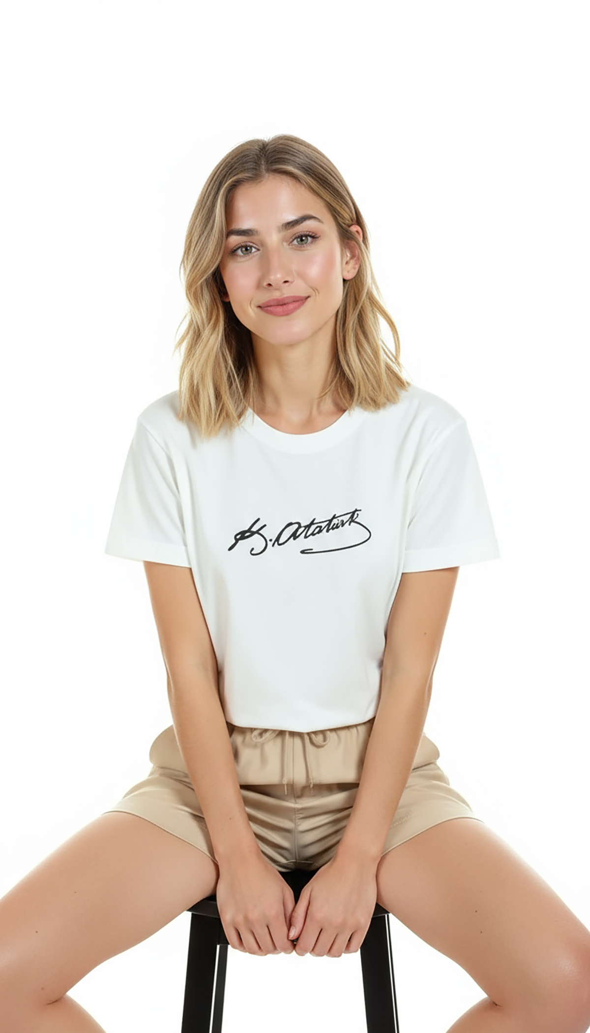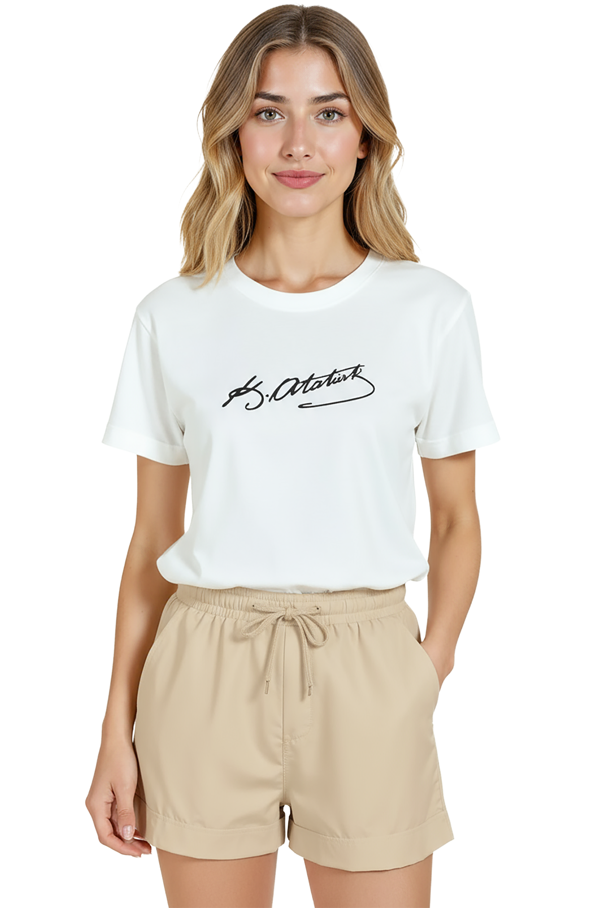 Minimal ve modern bir ifade sunan kadın tişörtü. Bu beyaz relaxed fit kadın tişört, ön göğüste yer alan Atatürk imza‑stili el yazısı grafiği ile sade ama güçlü bir görsel vurgu sağlar. Ürün %100 pamuk kumaştan üretilmiş olup relaxed fit kadın kesim sayesinde gün boyu konfor, nefes alabilirlik ve hareket özgürlüğü sunar. Baskı yüksek çözünürlüklü dijital baskı ile uygulanmıştır; monokrom kontrast ve ince çizgi detayları uzun süre korunur. Günlük şehir kombinleri, minimal gardıroplar ve smart‑casual kullanımlar için ideal bir parça.