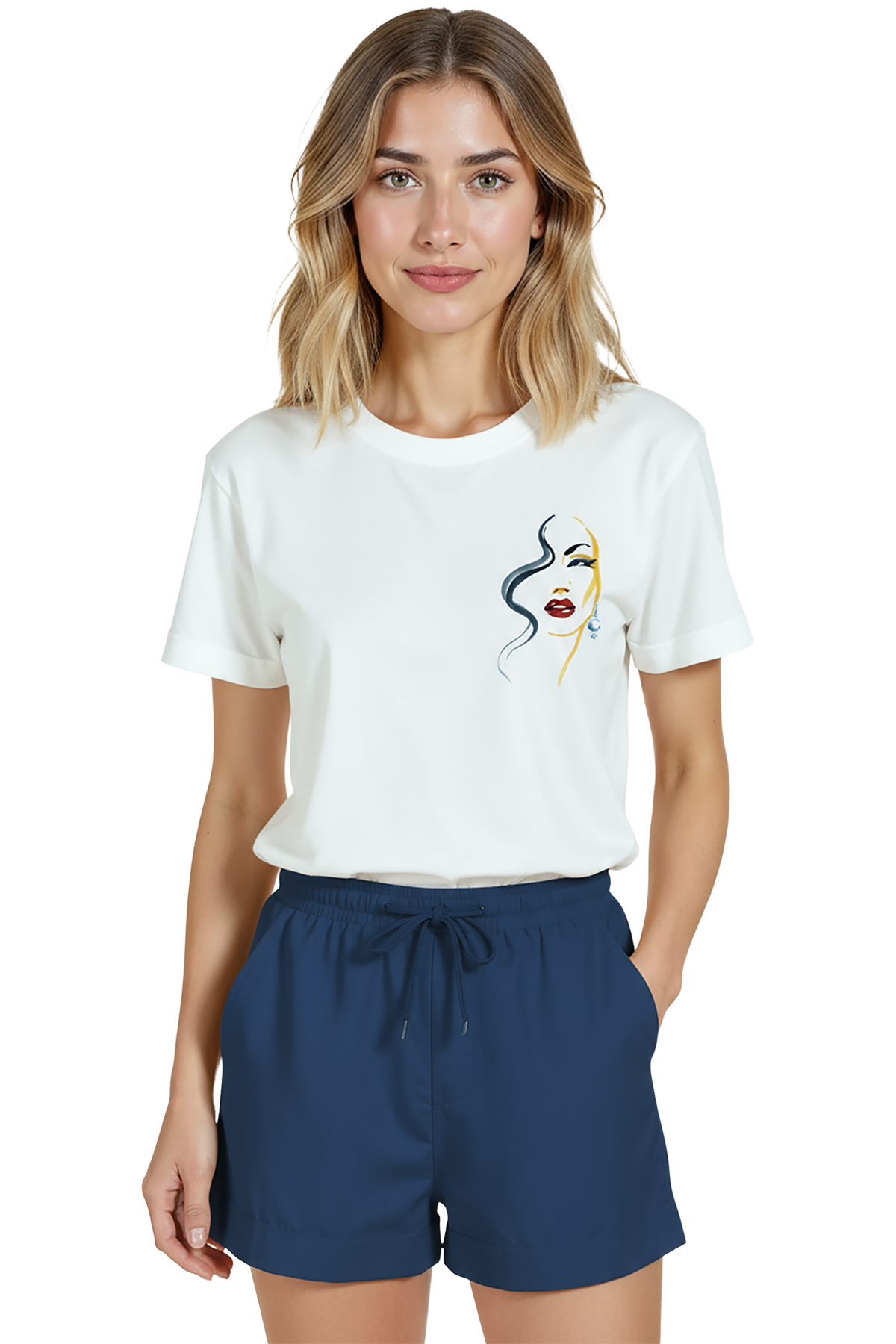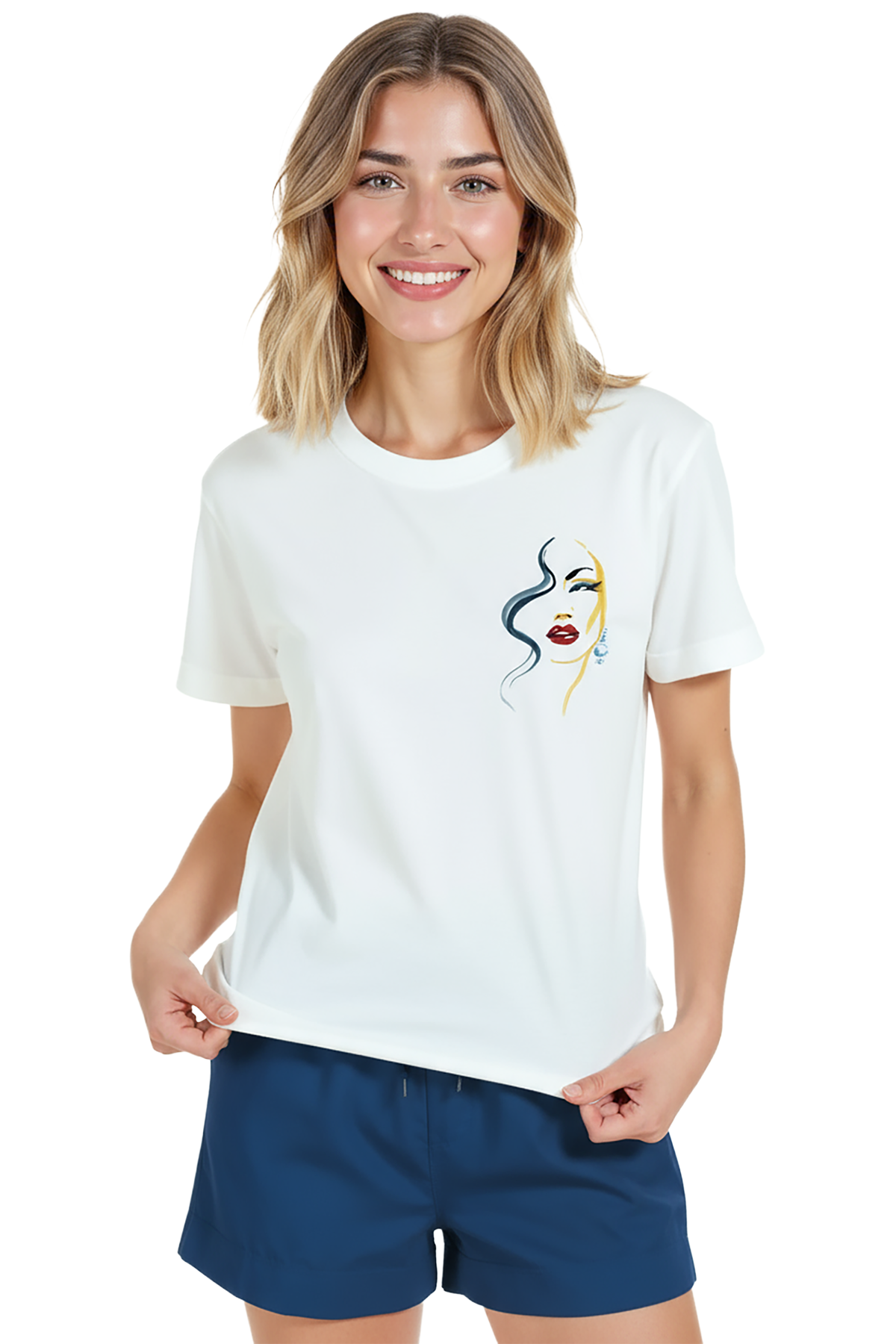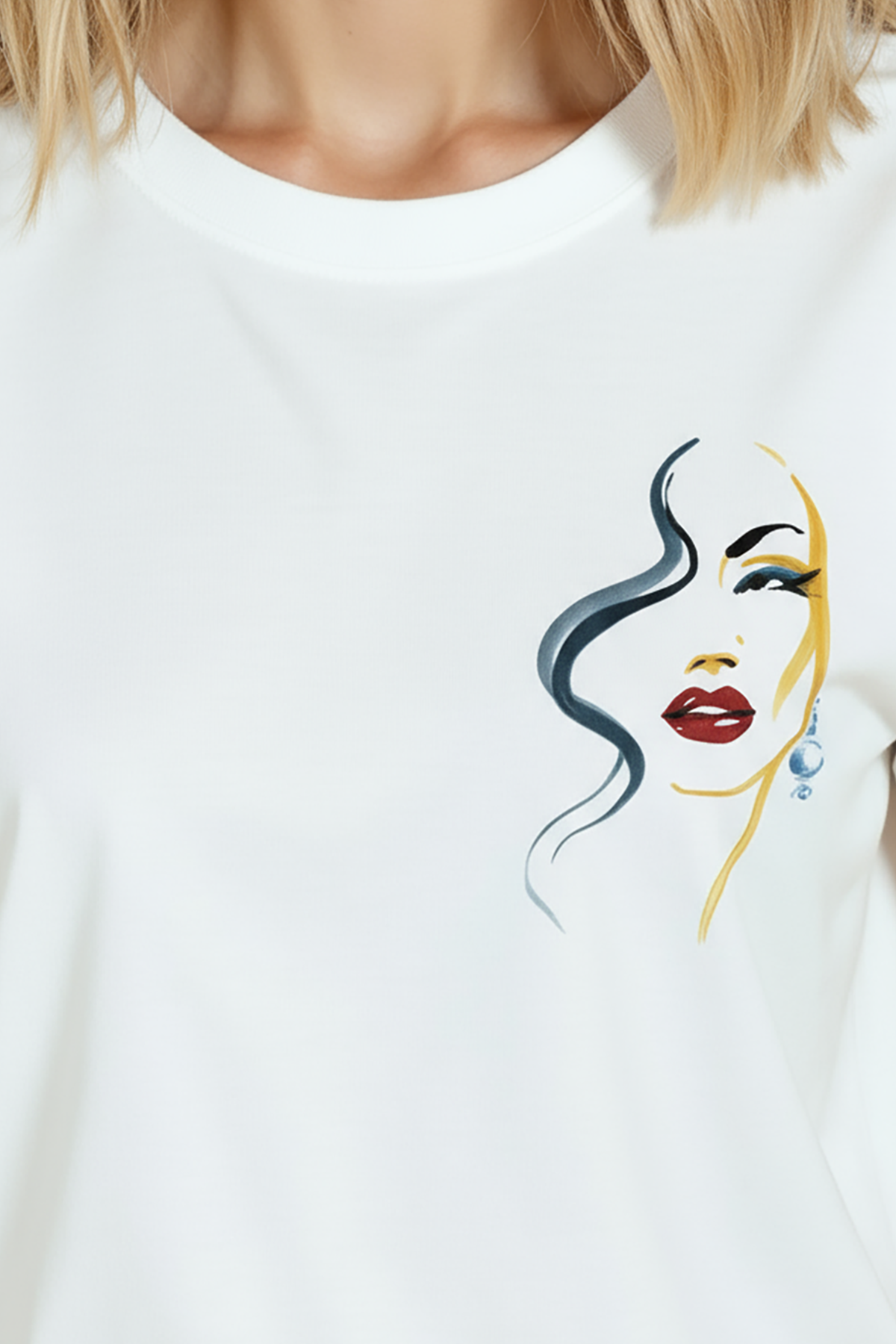Sanat ve zarafeti minimal bir dokunuşla birleştiren kadın tişörtü. Bu beyaz relaxed fit kadın tişört, sağ göğüste yer alan ince mürekkep çizgilerle oluşturulmuş portre illüstrasyonu, kırmızı ruj ve altın‑mavi suluboya vurguları ile sofistike bir görünüm sunar. Ürün %100 pamuk kumaştan üretilmiş olup relaxed fit kadın kesim sayesinde gün boyu konfor, nefes alabilirlik ve rahat hareket sağlar. Baskı küçük‑sağ göğüs konumunda, yüksek çözünürlüklü dijital baskı ile uygulanmıştır; mürekkep çizgileri ve renk dokuları uzun süre canlı kalır. Günlük şehir kombinleri, kafe‑stil ve smart‑casual kullanımlar için ideal, minimal gardıroplara şık bir dokunuş katar.