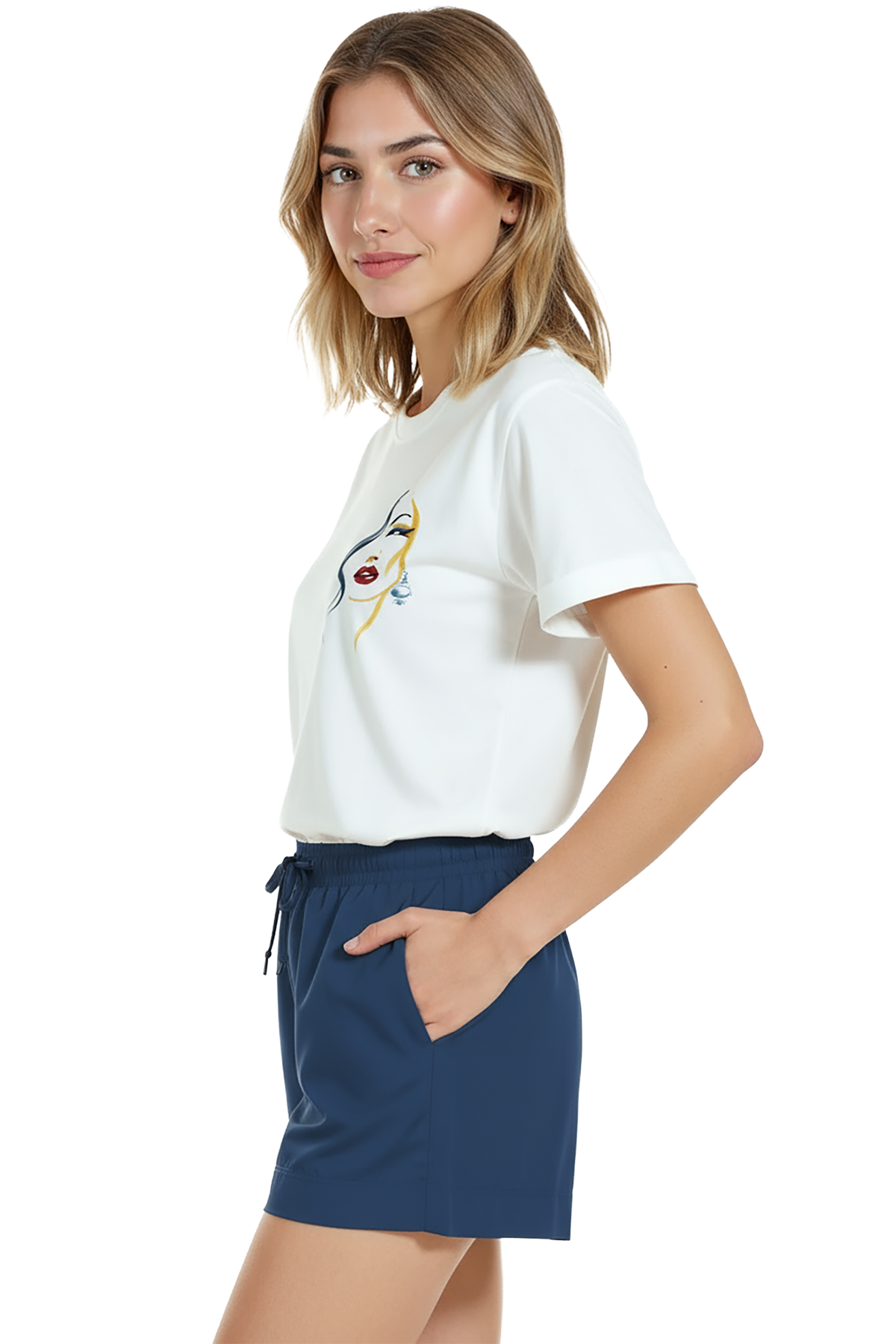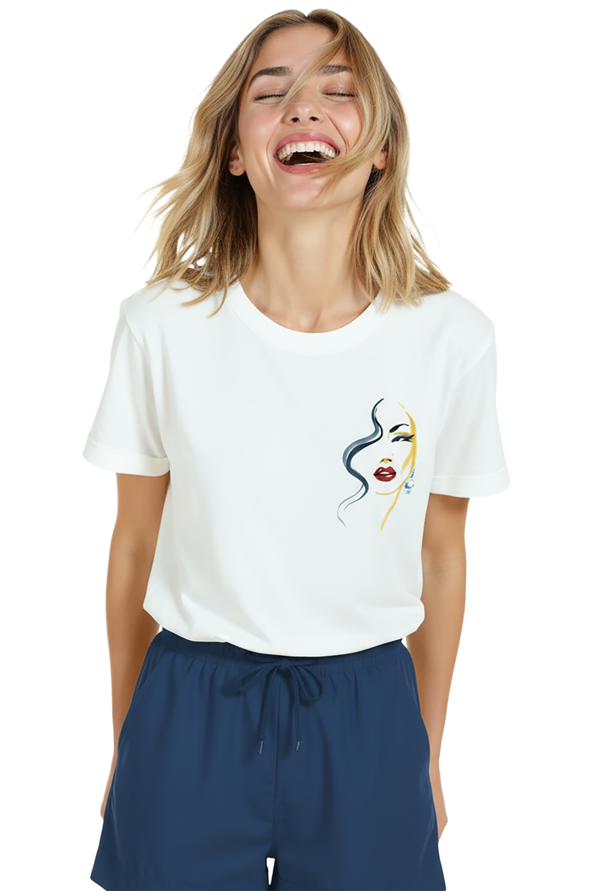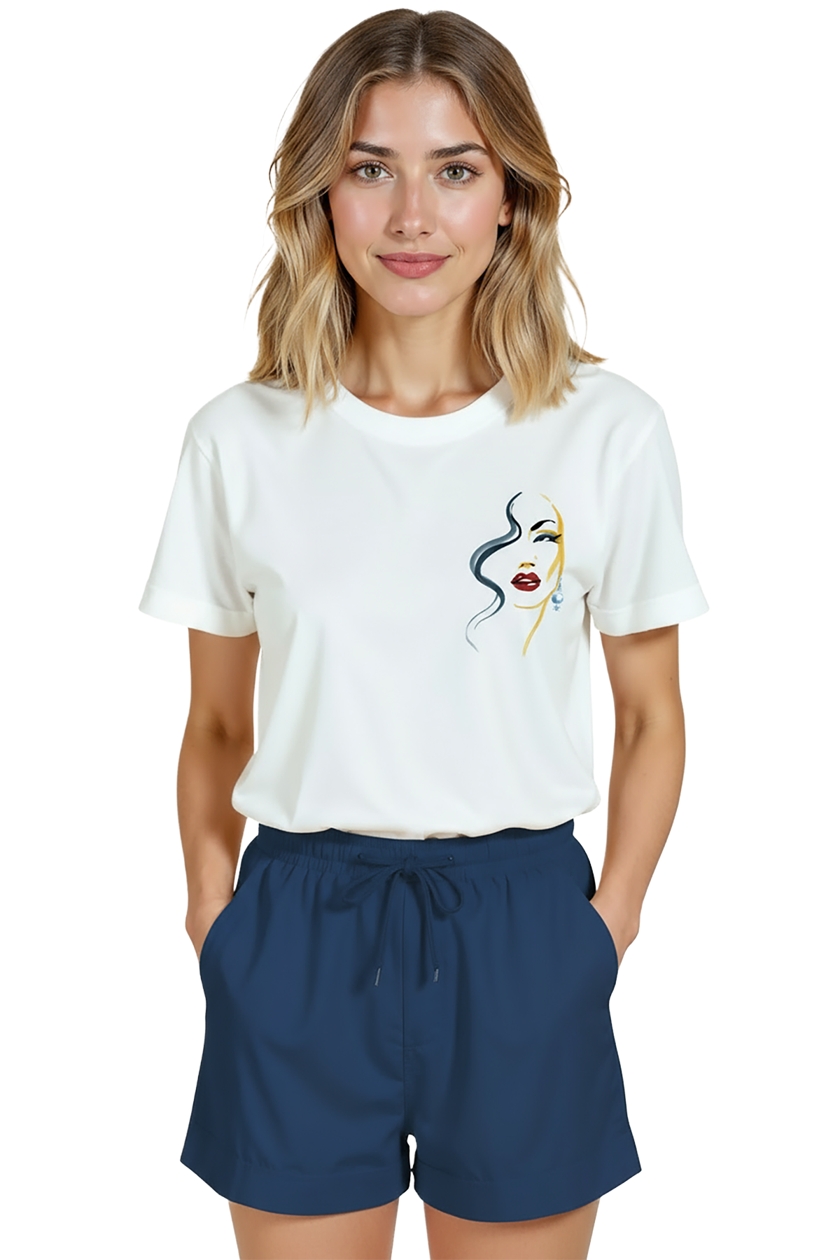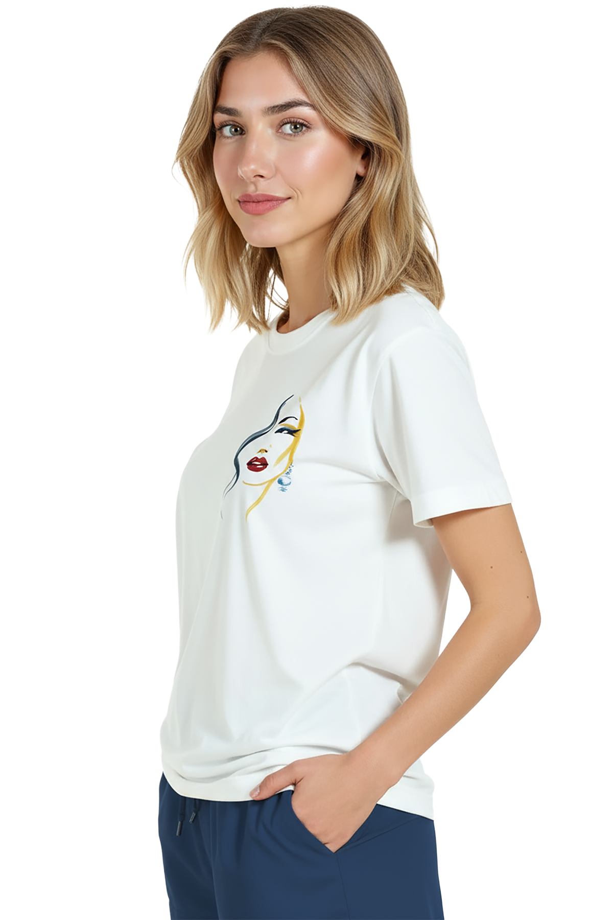 Sanat ve zarafeti minimal bir dokunuşla birleştiren kadın tişörtü. Bu beyaz relaxed fit kadın tişört, sağ göğüste yer alan ince mürekkep çizgilerle oluşturulmuş portre illüstrasyonu, kırmızı ruj ve altın‑mavi suluboya vurguları ile sofistike bir görünüm sunar. Ürün %100 pamuk kumaştan üretilmiş olup relaxed fit kadın kesim sayesinde gün boyu konfor, nefes alabilirlik ve rahat hareket sağlar. Baskı küçük‑sağ göğüs konumunda, yüksek çözünürlüklü dijital baskı ile uygulanmıştır; mürekkep çizgileri ve renk dokuları uzun süre canlı kalır. Günlük şehir kombinleri, kafe‑stil ve smart‑casual kullanımlar için ideal, minimal gardıroplara şık bir dokunuş katar.
