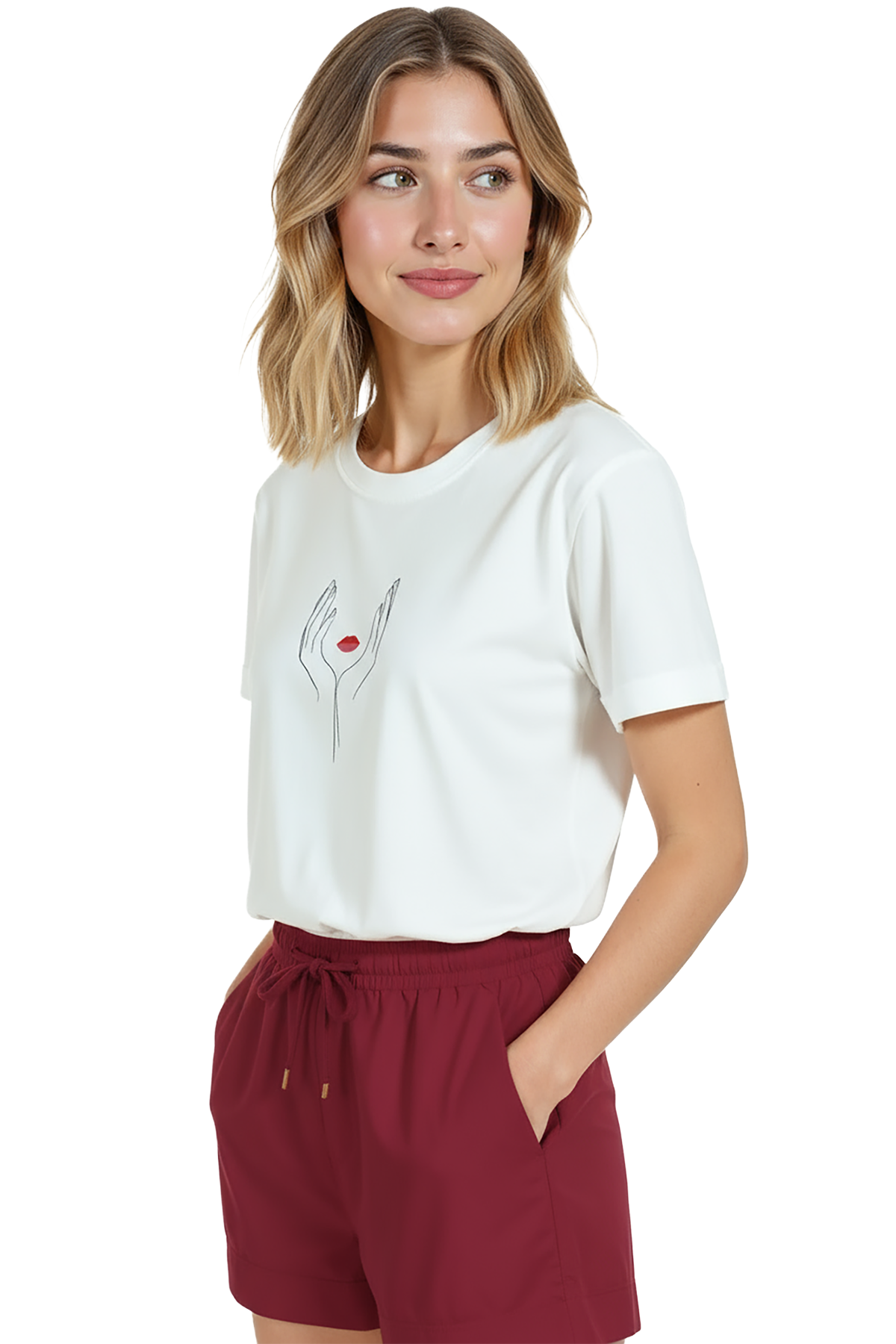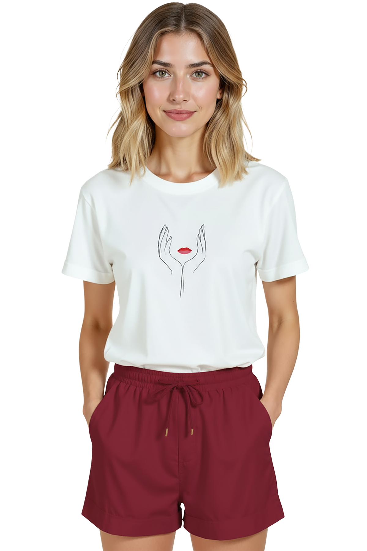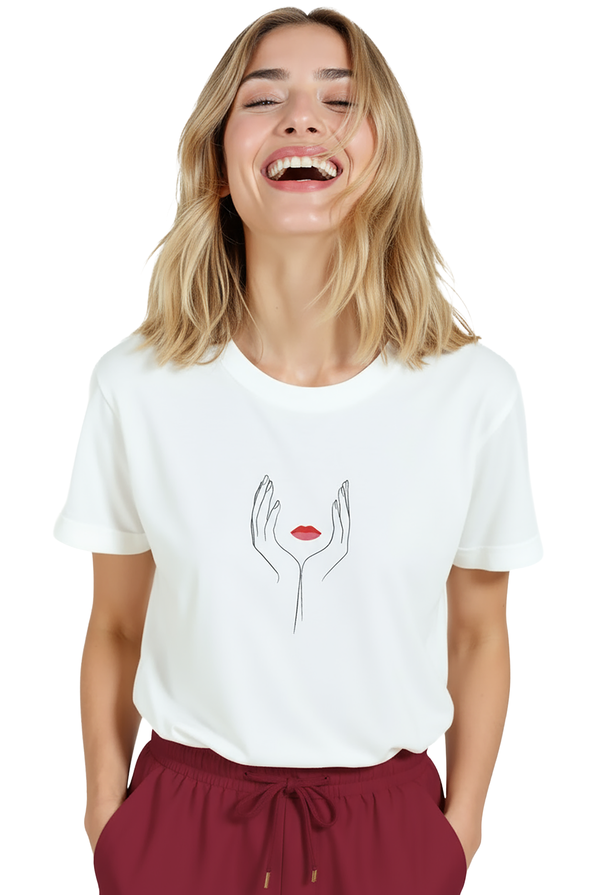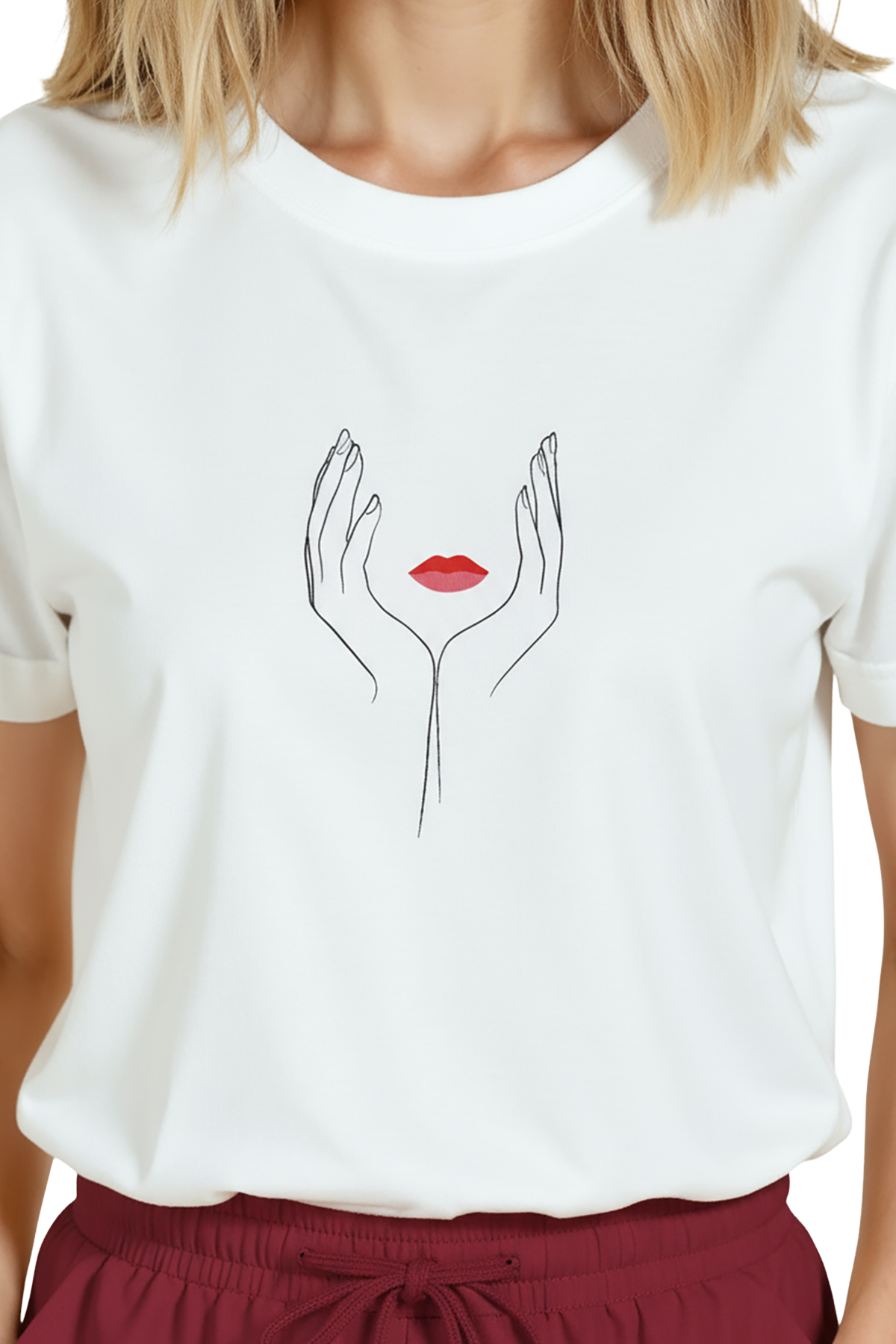 Minimal ve feminen bir estetik sunan kadın tişörtü. Bu beyaz relaxed fit kadın tişört, göğüs merkezinde yer alan ince line‑art eller kompozisyonu ve vurgulu kırmızı dudak detayı ile sade ama etkileyici bir görünüm sağlar. Ürün %100 pamuk kumaştan üretilmiş olup relaxed fit kadın kesim sayesinde gün boyu konfor, nefes alabilirlik ve rahat hareket sunar. Tasarım yüksek çözünürlüklü dijital baskı ile uygulanmış; ince mürekkep çizgileri ve kırmızı renk kontrastı uzun süre canlı kalır. Günlük şehir kombinleri, kafe‑stil ve smart‑casual kullanımlar için ideal, minimal gardıroplara şık bir dokunuş katar.