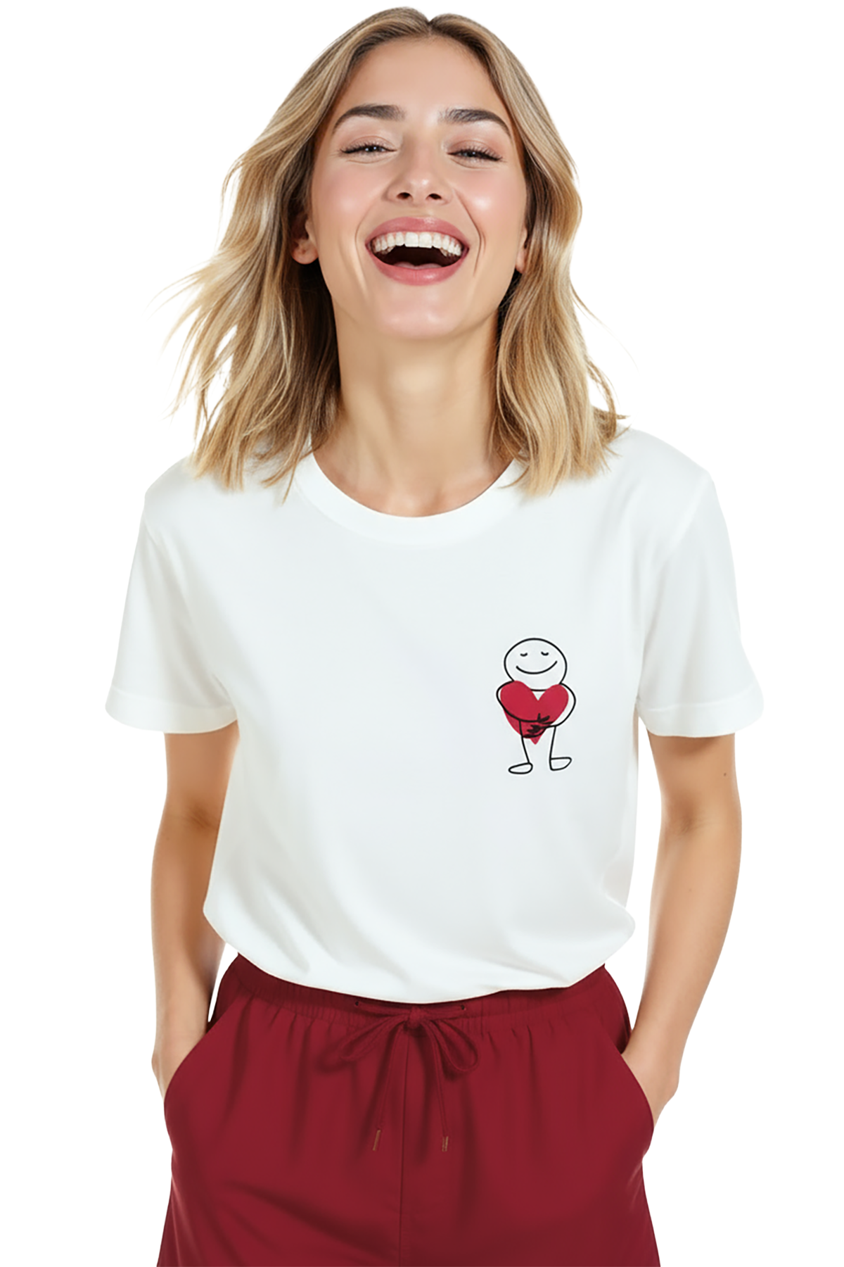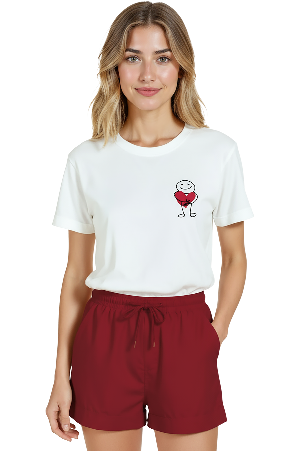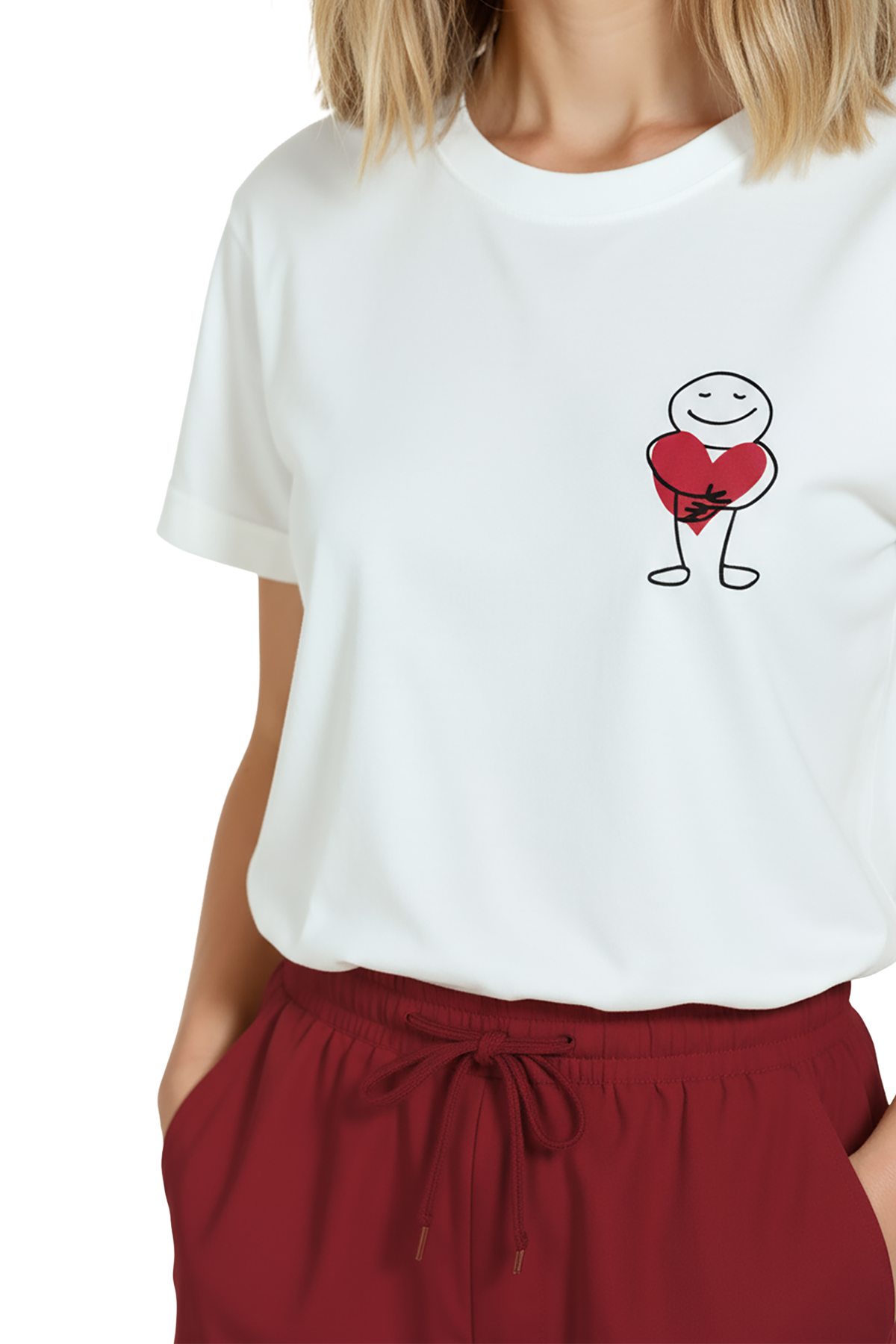 Samimi ve minimal bir dokunuş arayanlar için tasarlanmış kadın tişörtü. Bu beyaz relaxed fit kadın tişört, sağ göğüste yer alan çizgisel karakterin kalbi kucakladığı minimal illüstrasyon ile hem naif hem modern bir görünüm sunar. Ürün %100 pamuk kumaştan üretilmiştir; relaxed fit kadın kesim sayesinde gün boyu konfor, nefes alabilirlik ve hareket özgürlüğü sağlar. Baskı yüksek çözünürlüklü dijital baskı ile uygulanmış olup ince çizgi detayları ve kırmızı kalp vurgusu uzun süre canlı kalır. Günlük şehir kombinleri, kafe‑stil ve soft smart‑casual kullanımlar için ideal, hediye ve minimal gardıroplar için uyumlu bir parça.