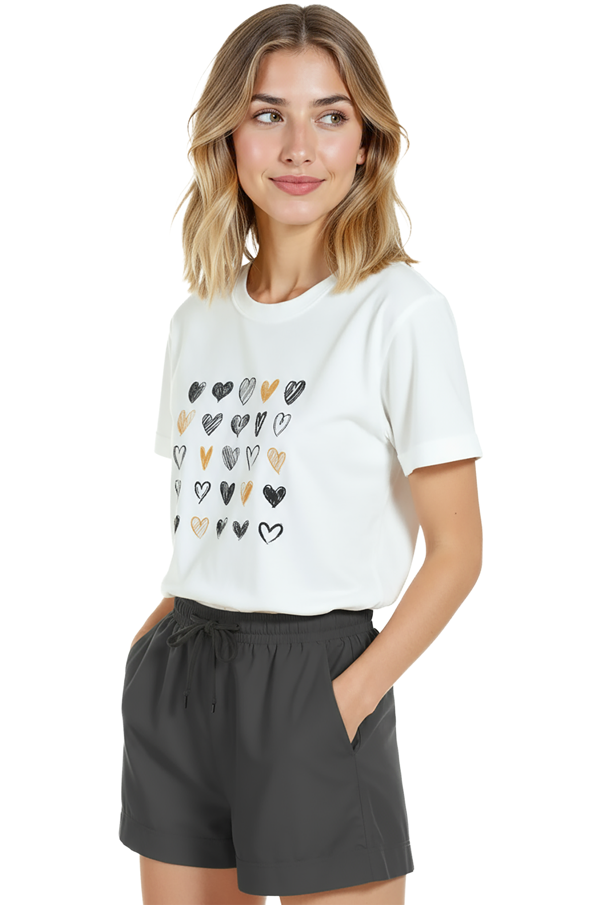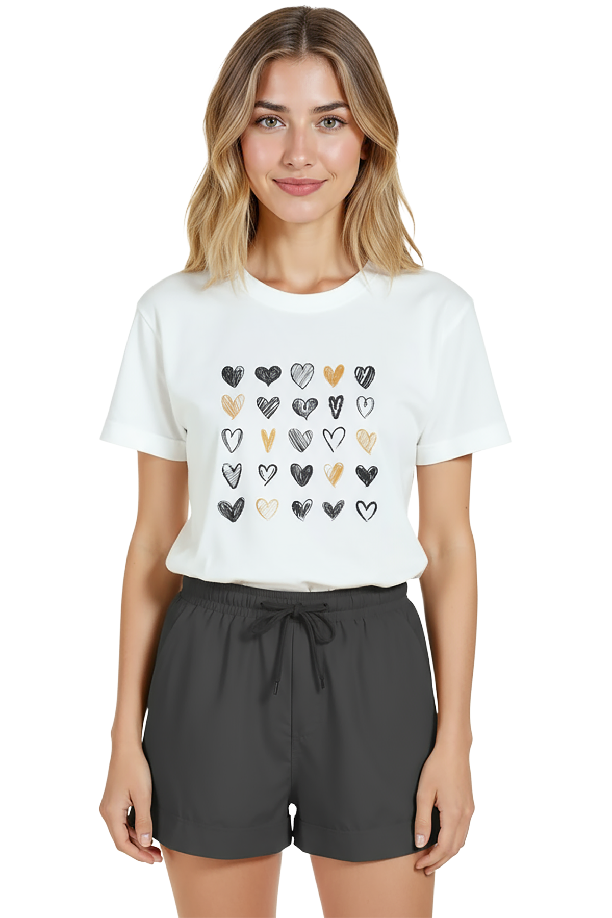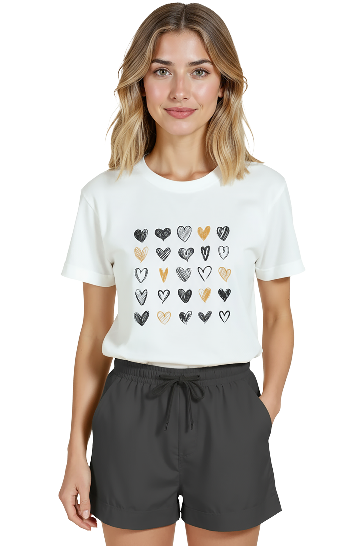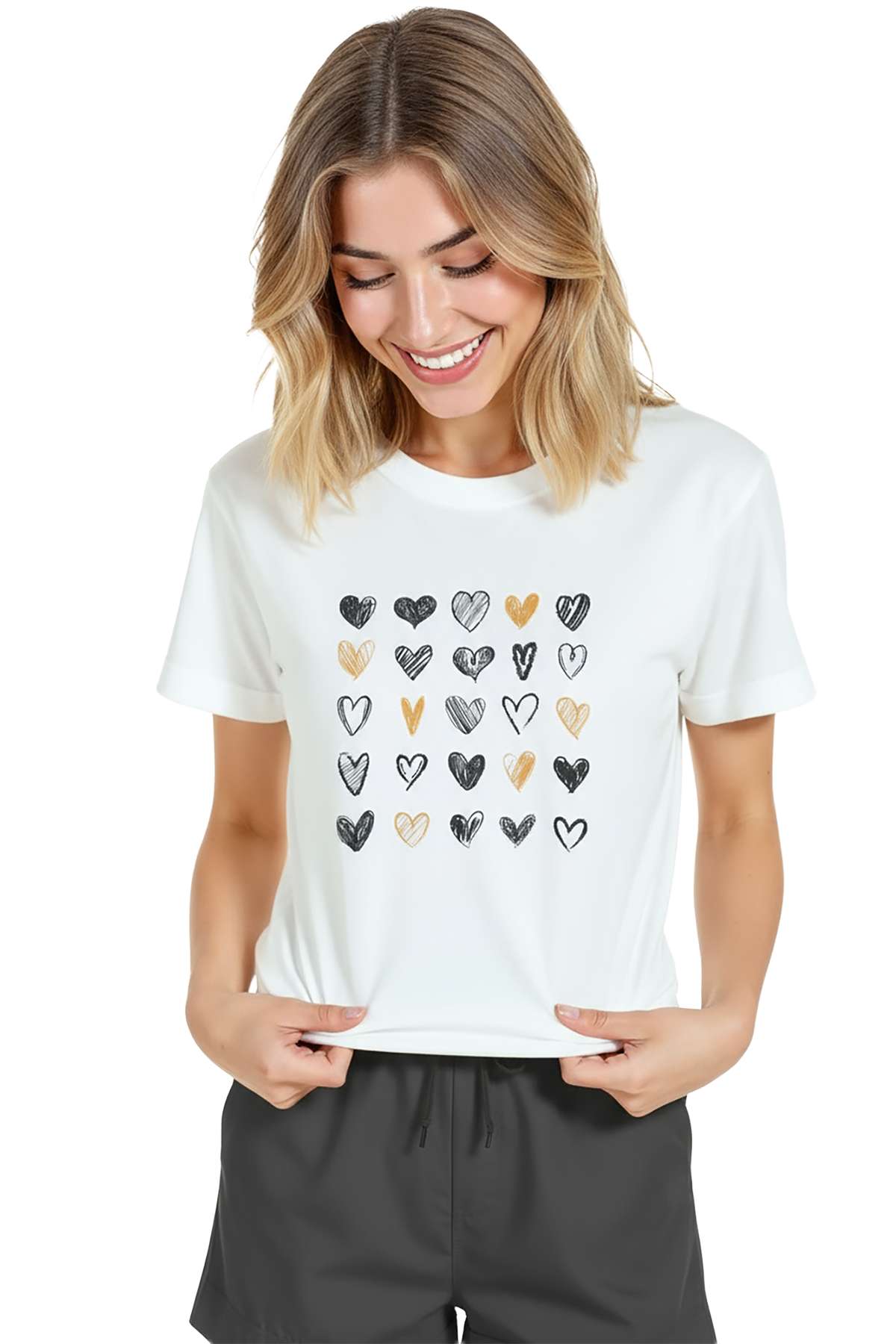 Minimal ve modern bir dokunuş sunan kadın tişörtü. Bu beyaz relaxed fit kadın tişört, ön göğüste düzenli satırlarda yer alan elle çizilmiş karakalem kalpler ve aralara dağılmış altın/sarı vurgu kalpler ile zarif ve şehirli bir görünüm sağlar. Ürün %100 pamuk kumaştan üretilmiş olup relaxed fit kadın kesim sayesinde gün boyu konfor, nefes alabilirlik ve hareket özgürlüğü sunar. Baskı yüksek çözünürlüklü dijital baskı ile uygulanmış; çizgisel dokular ve gold vurgular uzun süre canlı kalır. Günlük kombinler, kafe‑stil ve smart‑casual kullanımlar için ideal, minimal gardıroplara kolay uyum sağlayan bir parça.