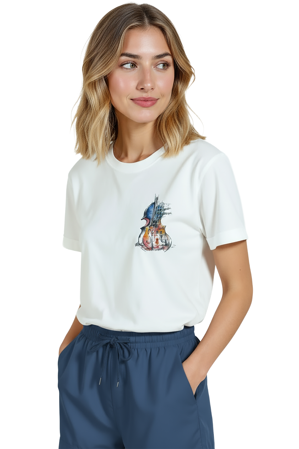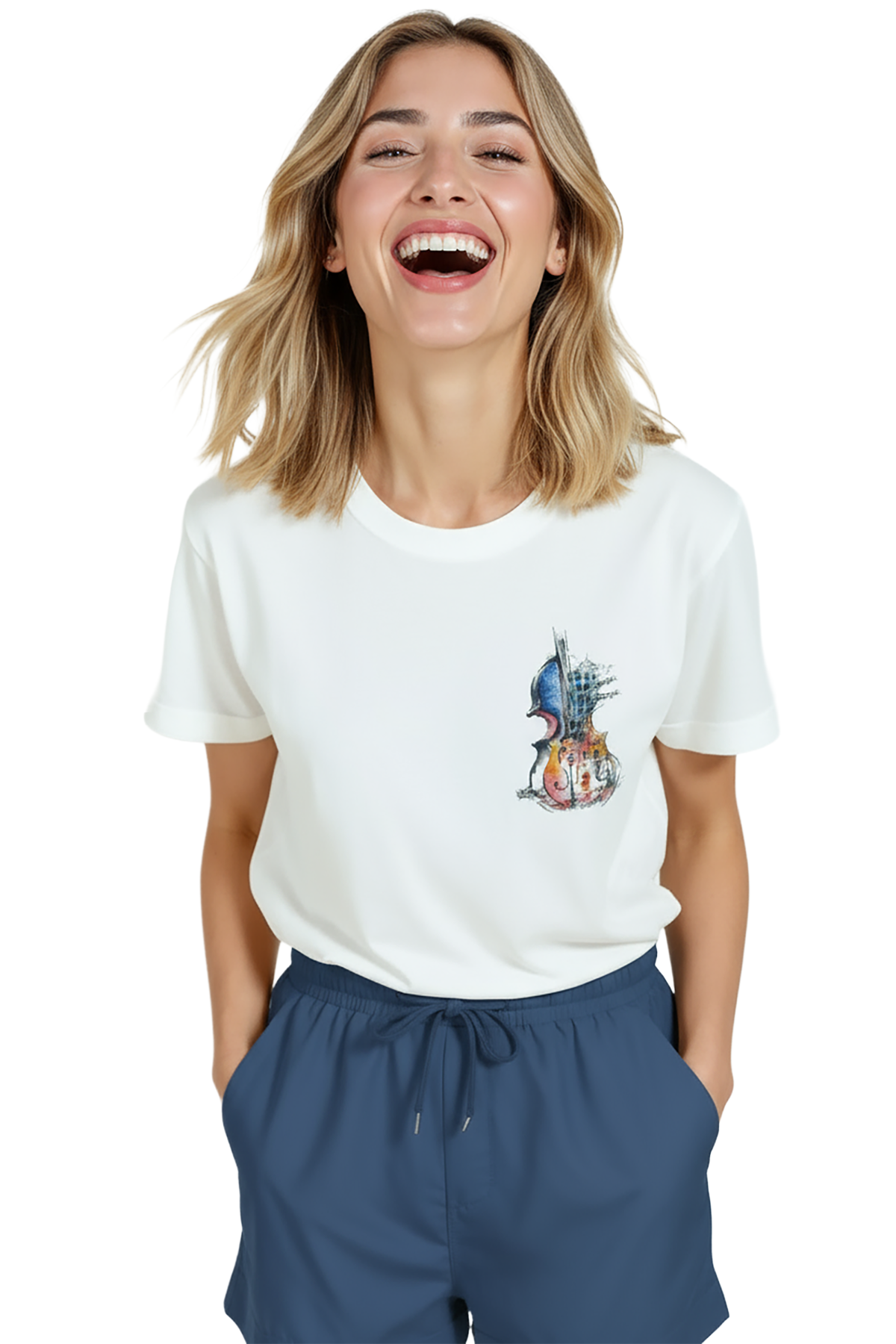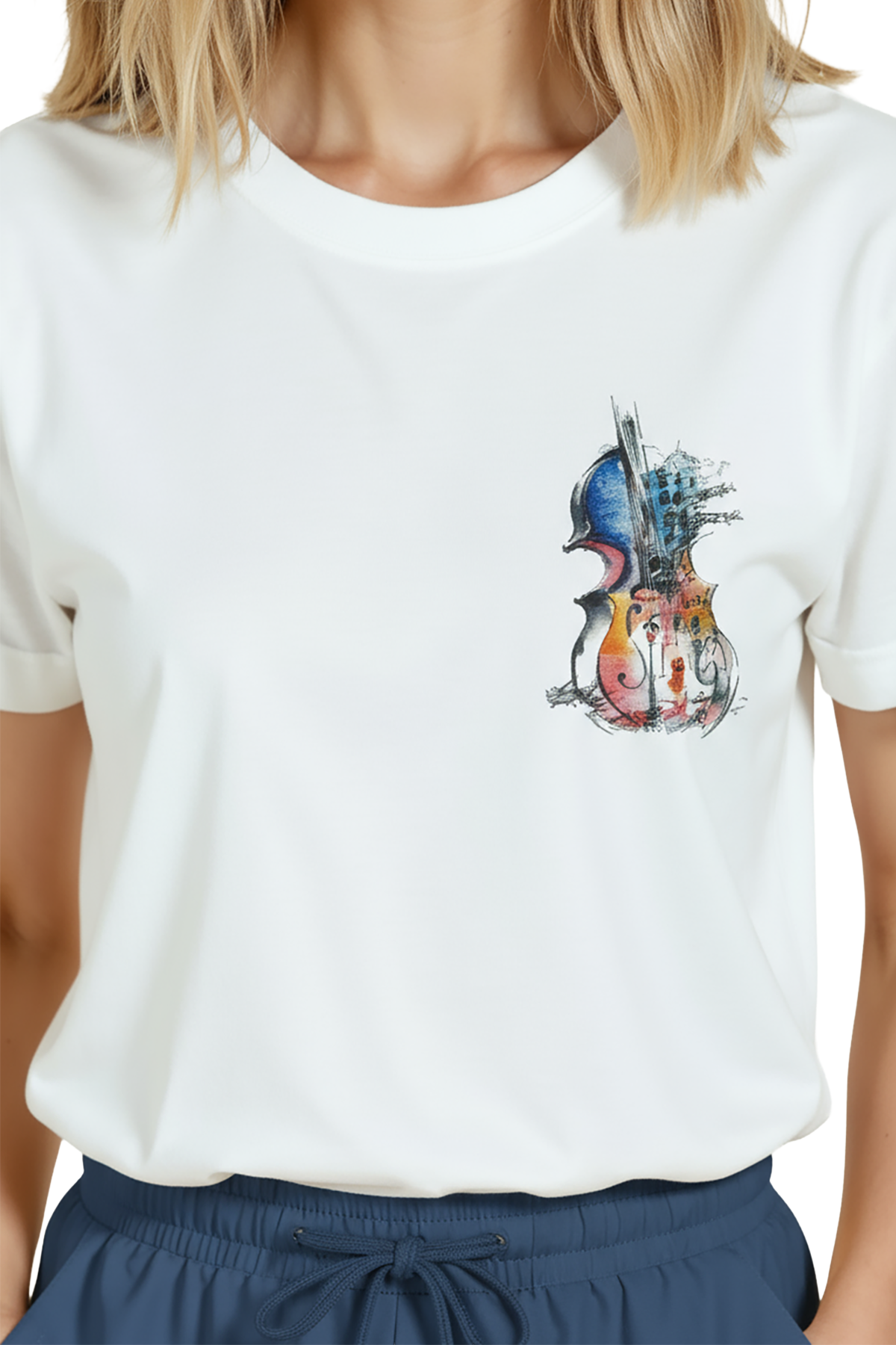 Müzik ve sanatın zarif buluşması: bu beyaz relaxed fit (kadın kesim) tişört, sağ göğüste konumlanmış ince mürekkep eskiz ile renklendirilmiş suluboya keman illüstrasyonu ile naif ve estetik bir ifade sunar. Ürün %100 pamuk kumaştan üretilmiş olup relaxed fit kadın kesim sayesinde gün boyu konfor, nefes alabilirlik ve hareket özgürlüğü sağlar. Baskı küçük‑cep/sağ göğüs konumunda, yüksek çözünürlüklü dijital baskı ile uygulanmıştır; su bazlı suluboya dokusu ve ince çizgi detayları uzun süre canlı kalır. Günlük şehir kombinleri, konser‑ve kafe stilleri ve smart‑casual kullanımlar için ideal; hediye ve minimal gardıroplar için uyumlu bir parça.
