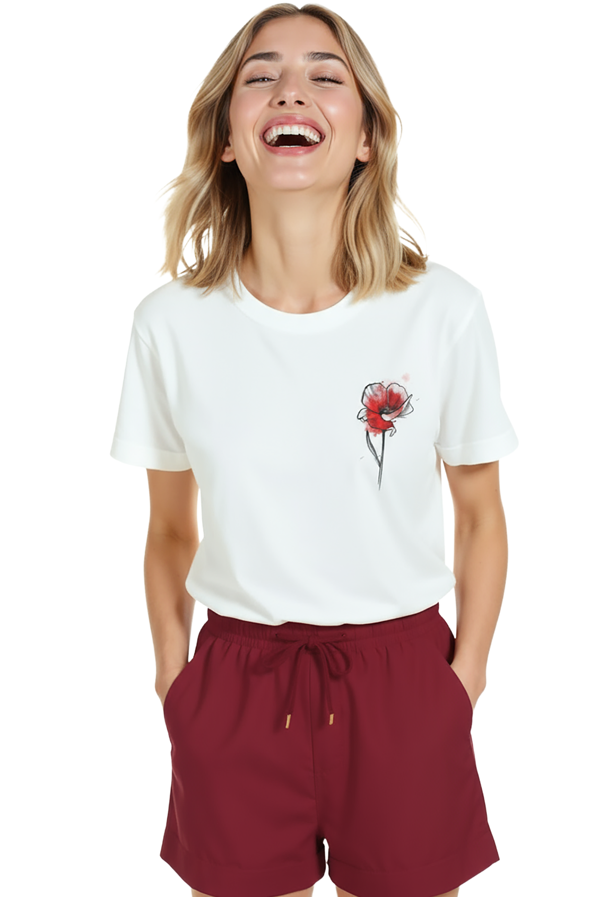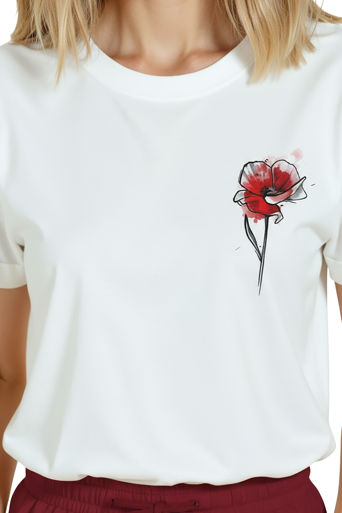 Zarif ve naif bir dokunuş sunan kadın tişörtü. Bu beyaz relaxed fit (kadın kesim) tişörtün sol göğsünde yer alan kırmızı gelincik suluboya minyatür baskı; ince karakalem konturlar ve yumuşak suluboya geçişleriyle minimal ama dikkat çekici bir ifade oluşturur. Ürün %100 pamuk olup relaxed fit kesimi sayesinde gün boyu yumuşaklık, nefes alabilirlik ve özgür hareket sağlar. Desen yüksek çözünürlüklü dijital baskı ile uygulanmıştır; suluboya dokusu ve ince çizgi detayları uzun süre canlı kalacak şekilde basılmıştır. Günlük şehir kombinleri, kafe stili ve minimal‑şık gardıroplar için ideal, hediye ve casual koleksiyonlarda öne çıkan bir parça.