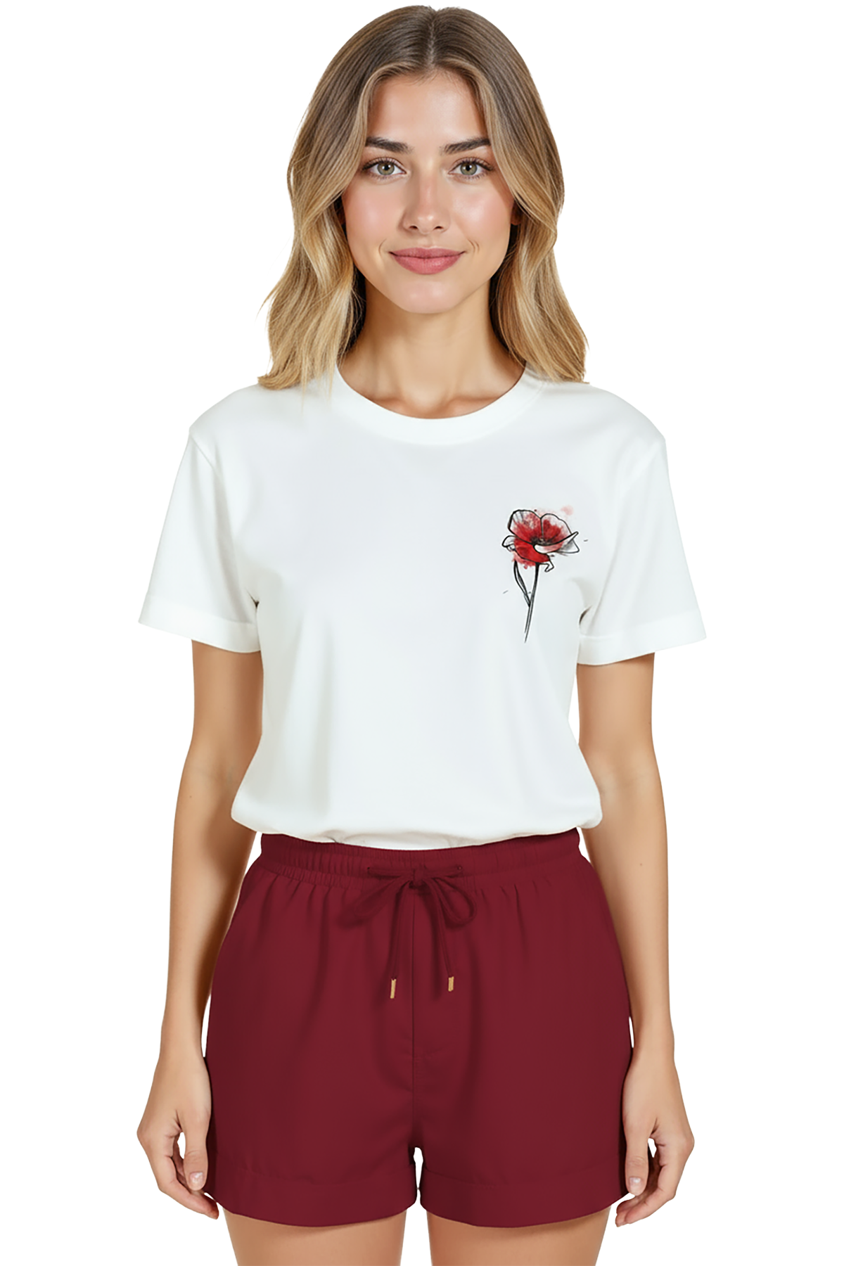 Kadın Beyaz Relaxed Fit %100 Pamuk Tişört – Kırmızı Gelincik Suluboya Minyatür Baskılı