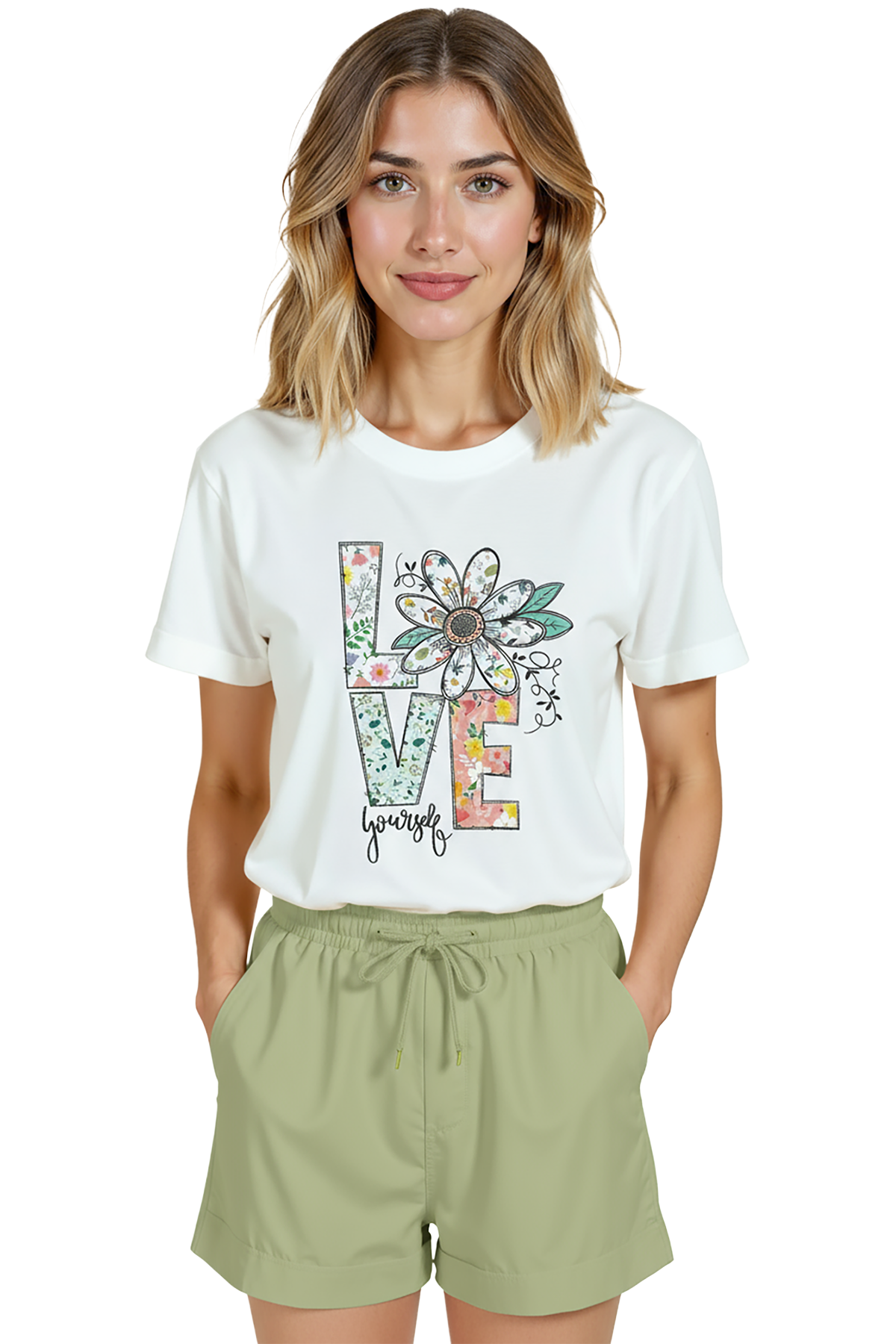 Neşeli ve feminen bir görünüm sunan kadın tişörtü. Bu beyaz relaxed fit kadın tişört, ön göğüste büyük “LOVE” tipografisi içinde yer alan renkli suluboya çiçek desenleri ve merkezde çizgisel çiçek illüstrasyonu ile canlı, pozitif bir ifade yaratır. Ürün %100 pamuk kumaştan üretilmiş olup relaxed fit kadın kesim sayesinde gün boyu konfor, nefes alabilirlik ve rahat hareket sağlar. Grafik yüksek çözünürlüklü dijital baskı ile uygulanmış; renk geçişleri ve ince desen detayları uzun süre korunur. Günlük şehir kombinleri, kafe‑stil ve smart‑casual kullanımlar için ideal, hediye seçenekleri arasında da öne çıkar.