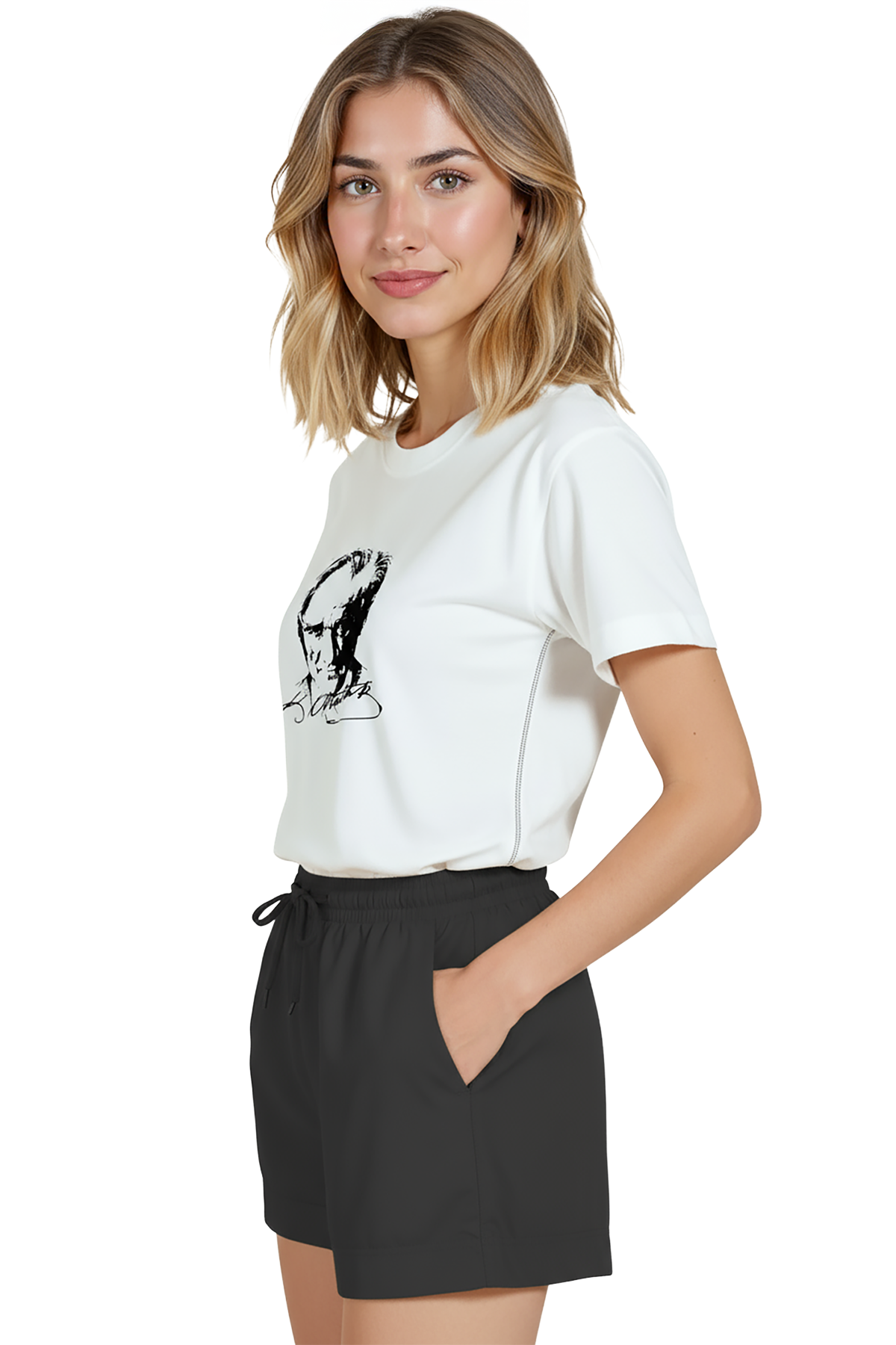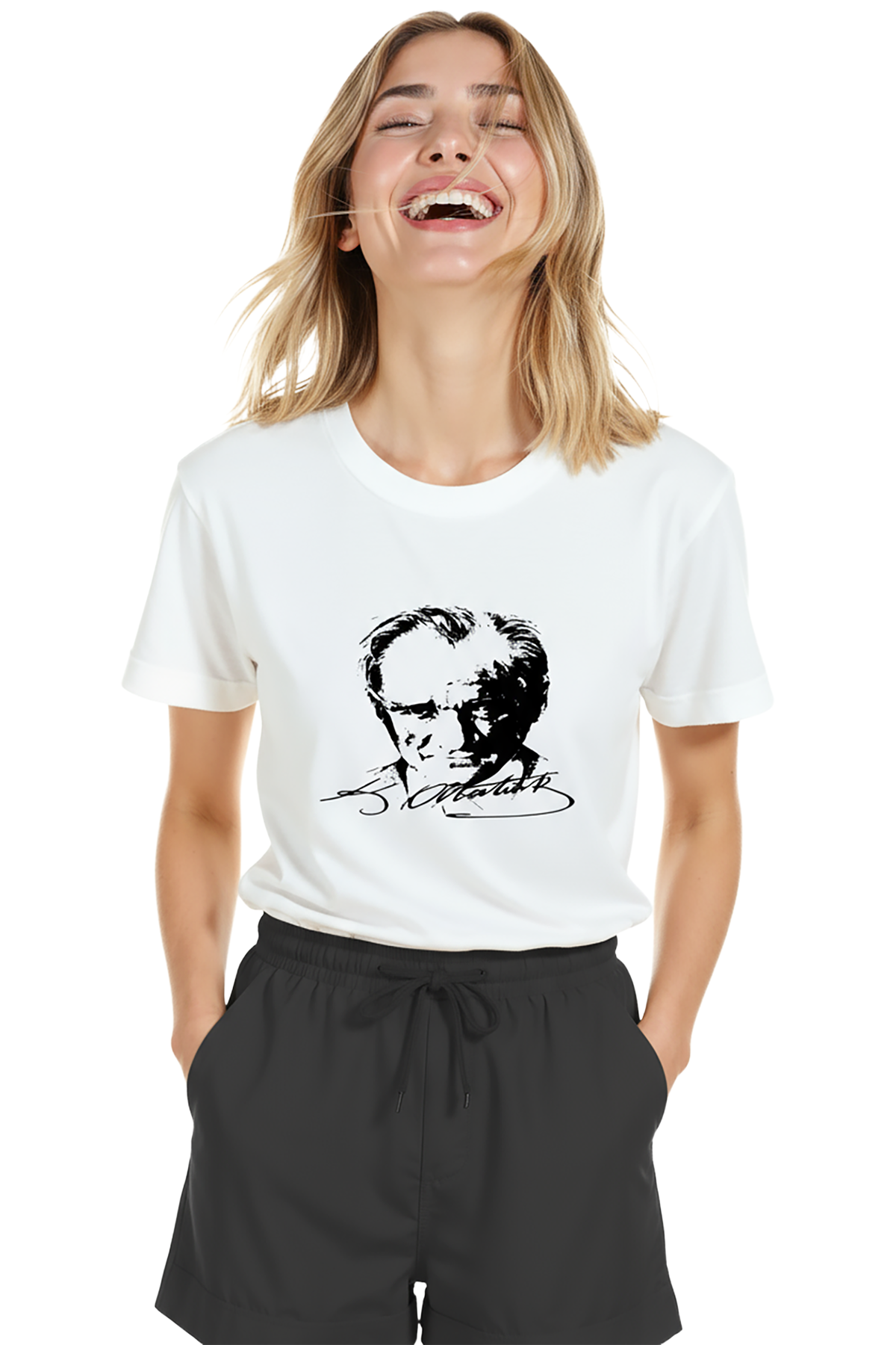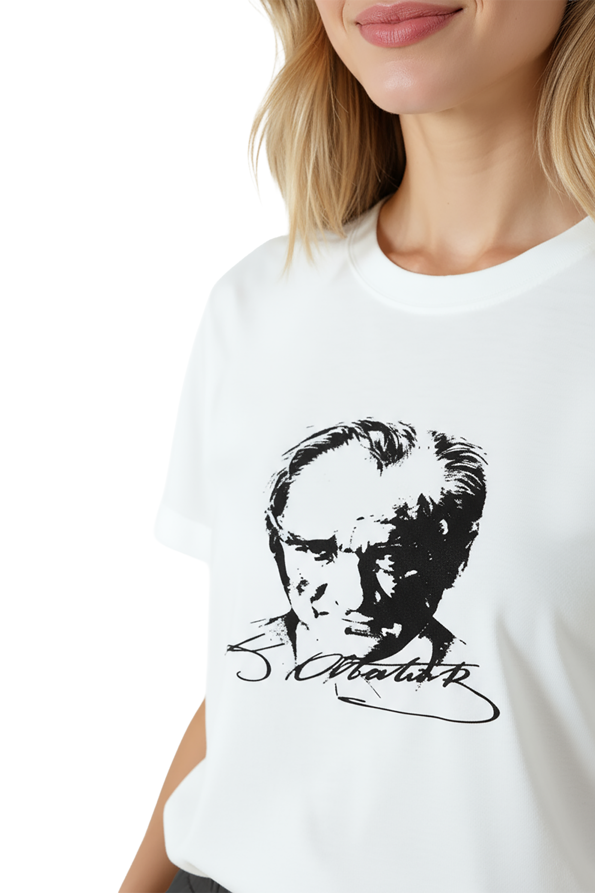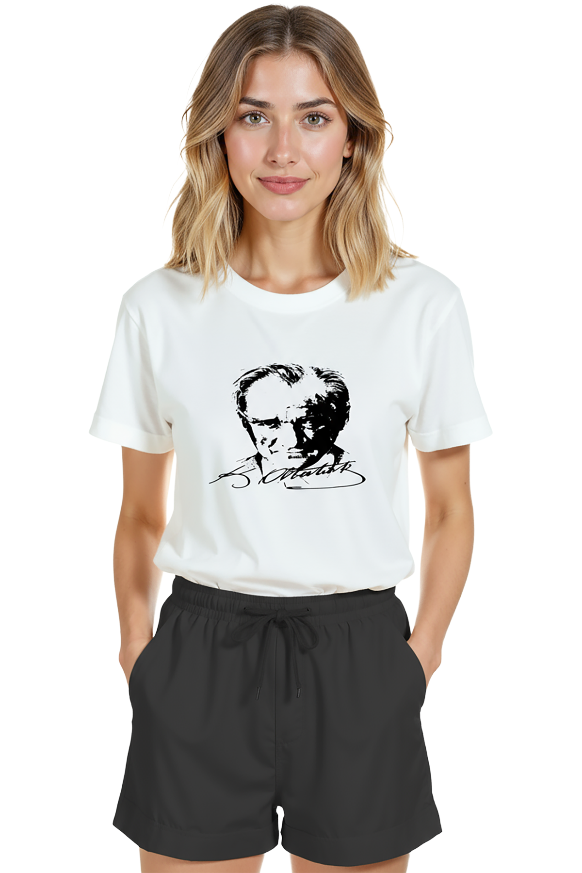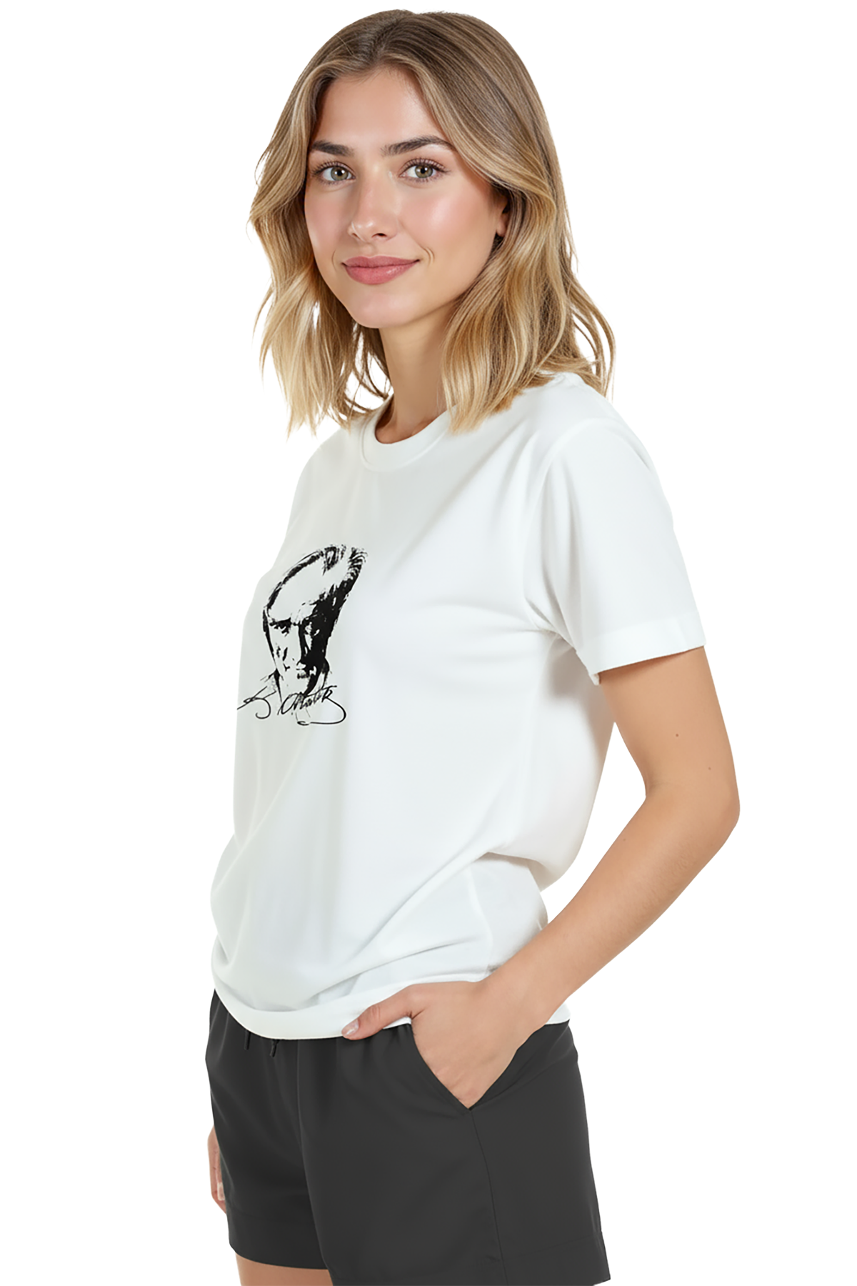 Kadın Beyaz Relaxed Fit %100 Pamuk Tişört – Atatürk İmza Stili Portre Baskılı
