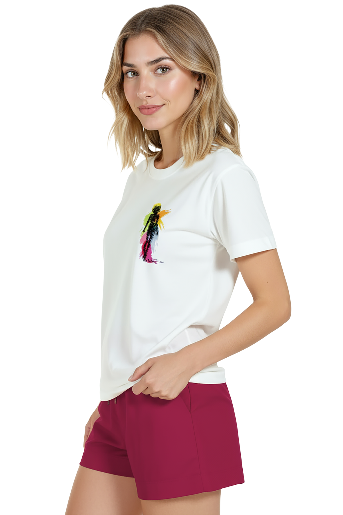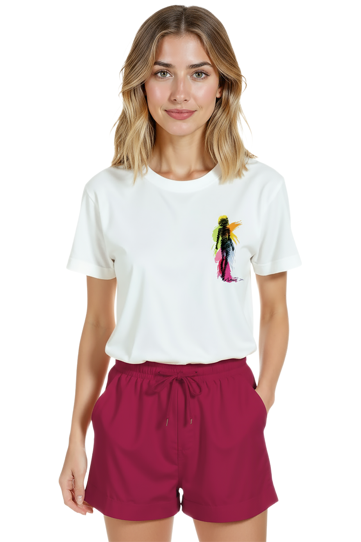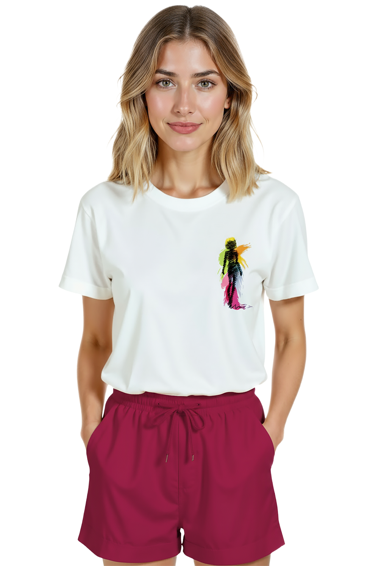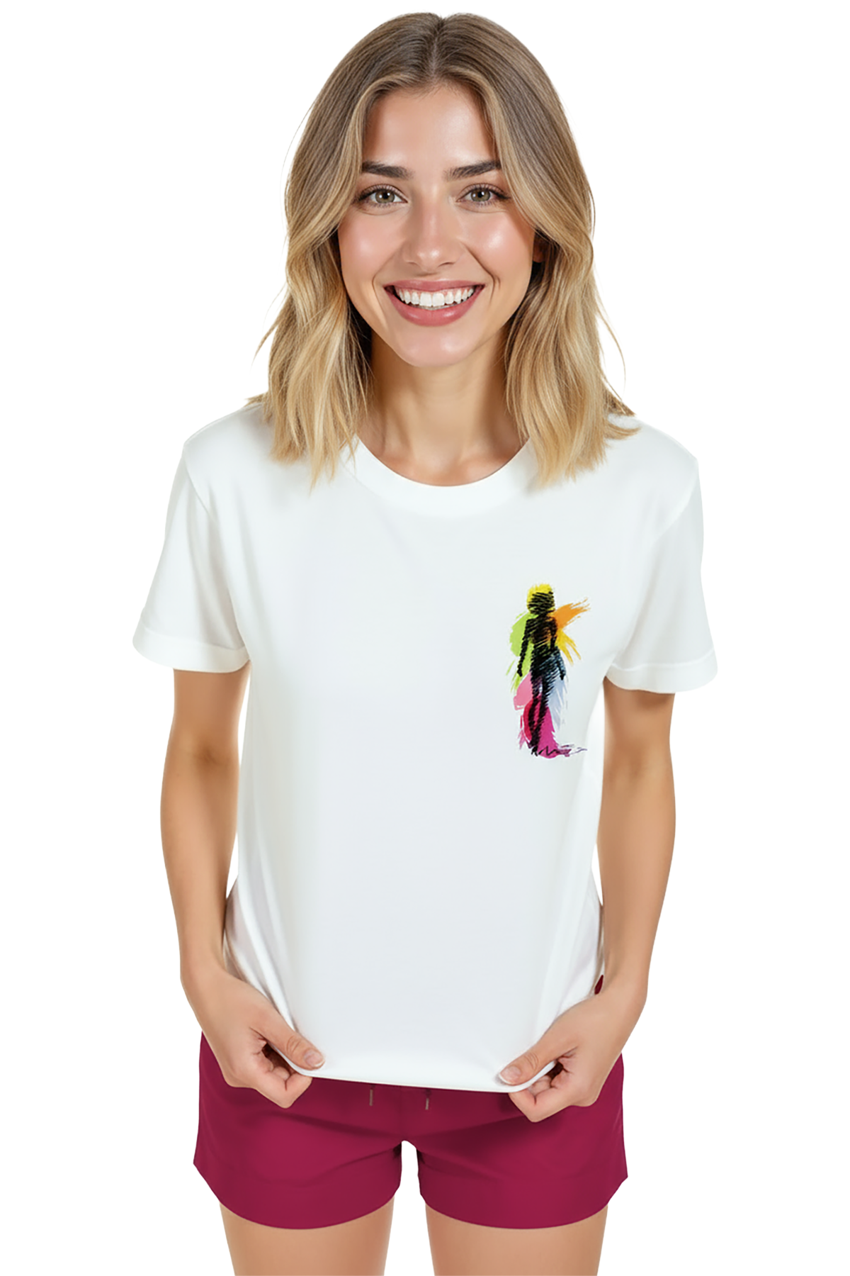 Minimal ve enerjik bir sanat duruşu sunan kadın tişörtü. Bu beyaz relaxed fit kadın tişört, ön göğsün sağ tarafında yer alan renkli fırça darbeleriyle oluşturulmuş soyut figür illüstrasyonu ile modern ve dikkat çekici bir görünüm sağlar. Ürün %100 pamuk kumaştan üretilmiş olup relaxed fit kadın kesim sayesinde gün boyu konfor, nefes alabilirlik ve rahat hareket sunar. Baskı küçük‑sağ ön göğüs konumunda, yüksek çözünürlüklü dijital baskı ile uygulanmıştır; canlı renk blokları ve ince mürekkep çizgileri uzun süre korunur. Günlük şehir kombinleri, kafe‑stil ve smart‑casual kullanımlar için ideal, minimal gardıroplara kolay uyum sağlayan bir parça.