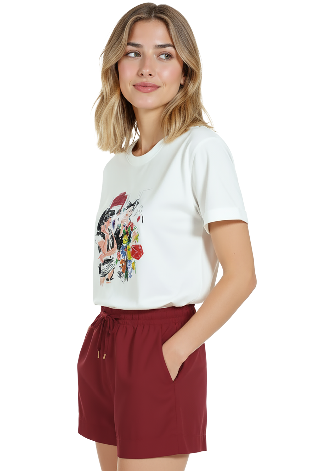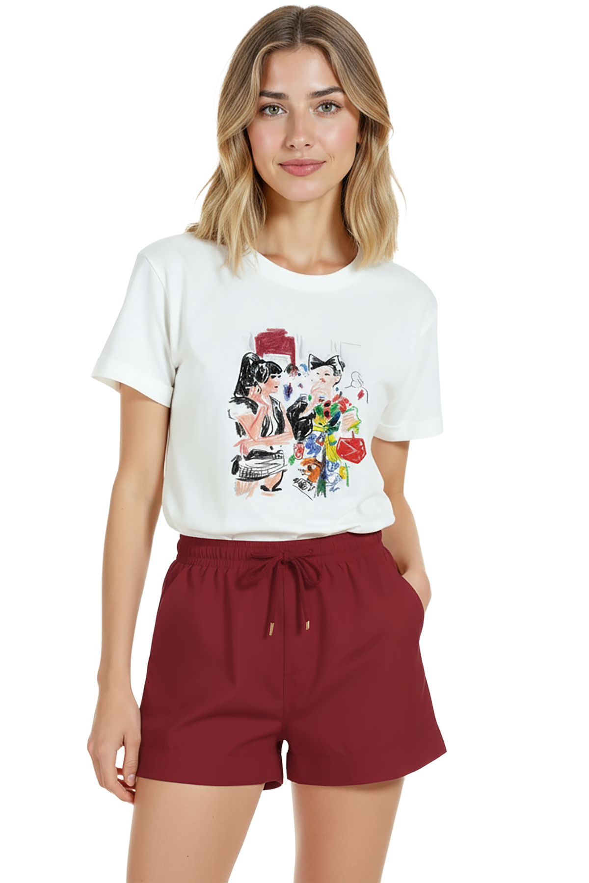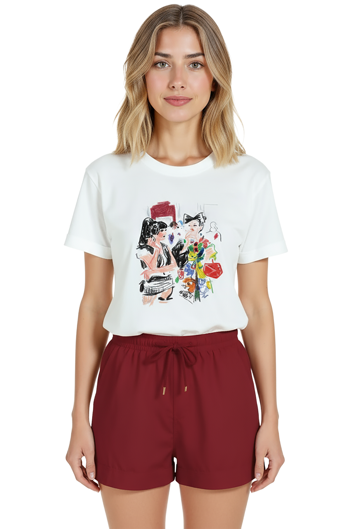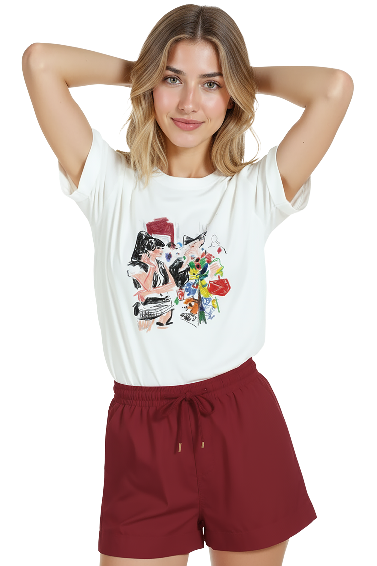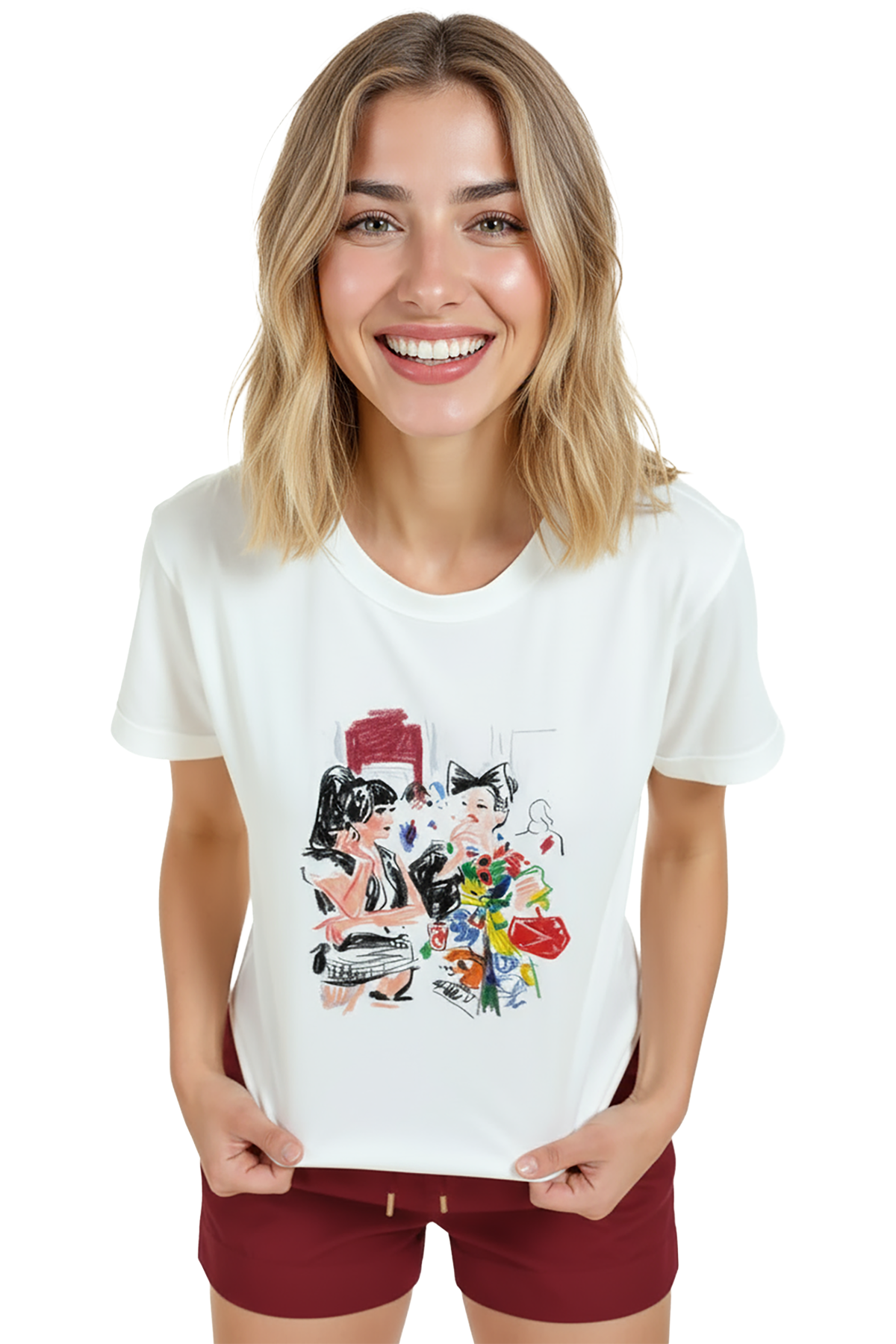 Sanatçı ruhlu, şehirli ve enerjik bir ifade sunan kadın tişörtü. Bu beyaz relaxed fit kadın tişört, ön göğüste yer alan karakalem hatlarla oluşturulmuş, canlı suluboya ve renkli karalama dokunuşları içeren sokak karakterleri illüstrasyonu ile dikkat çeker. Ürün %100 pamuk kumaştan üretilmiş olup relaxed fit kadın kesim sayesinde gün boyu konfor, nefes alabilirlik ve rahat hareket sağlar. Kompozisyon yüksek çözünürlüklü dijital baskı ile uygulanmış; fırça dokuları ve çizgi detayları uzun süre canlı kalır. Günlük şehir kombinleri, kafe‑stil ve smart‑casual kullanımlar için modern ve ifade dolu bir parça.