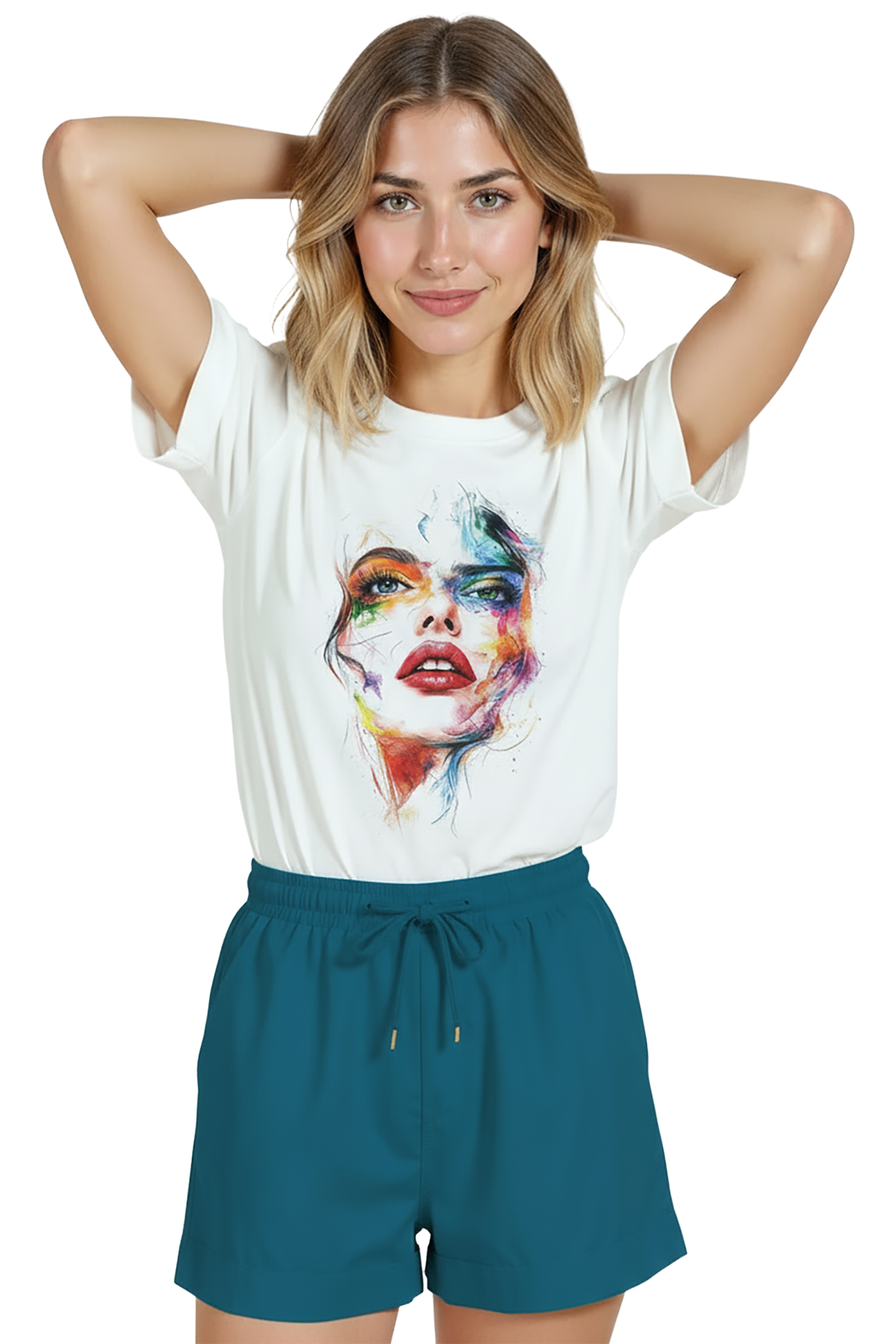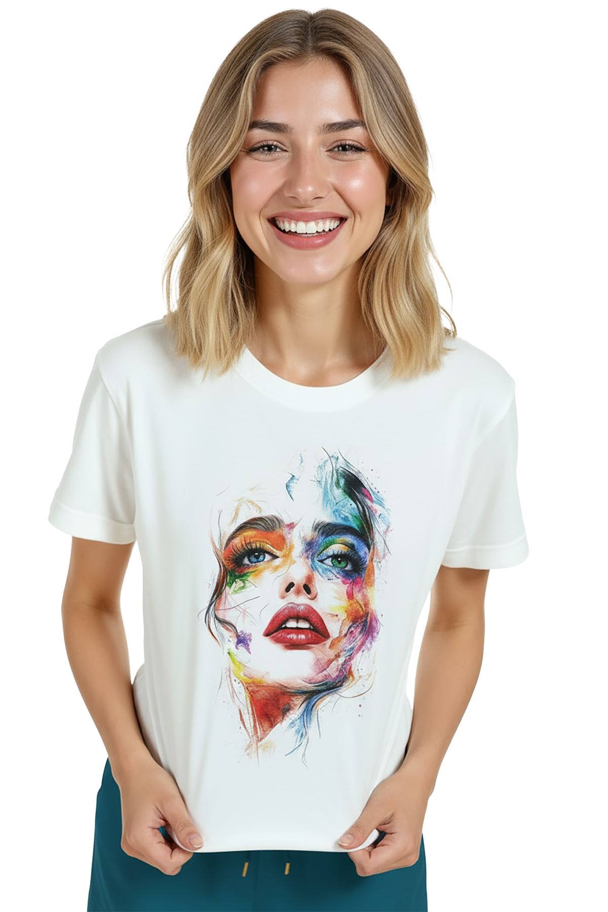 Sanat ve ifade gücünü bir arada sunan dikkat çekici kadın tişörtü. Bu beyaz relaxed fit kadın tişört, ön göğüste yer alan canlı suluboya portre illüstrasyonu ile modern, enerjik ve sofistike bir görünüm sağlar. Ürün %100 pamuk kumaştan üretilmiş olup relaxed fit kadın kesim sayesinde gün boyu konfor, nefes alabilirlik ve rahat hareket sunar. Baskı yüksek çözünürlüklü dijital baskı ile uygulanmış; renk geçişleri, ince fırça dokuları ve yüz detayları uzun süre canlı kalır. Günlük şehir kombinleri, kafe‑stil ve smart‑casual kullanımlar için ideal; gardırobunuza sanatsal bir merkez parça ekler.