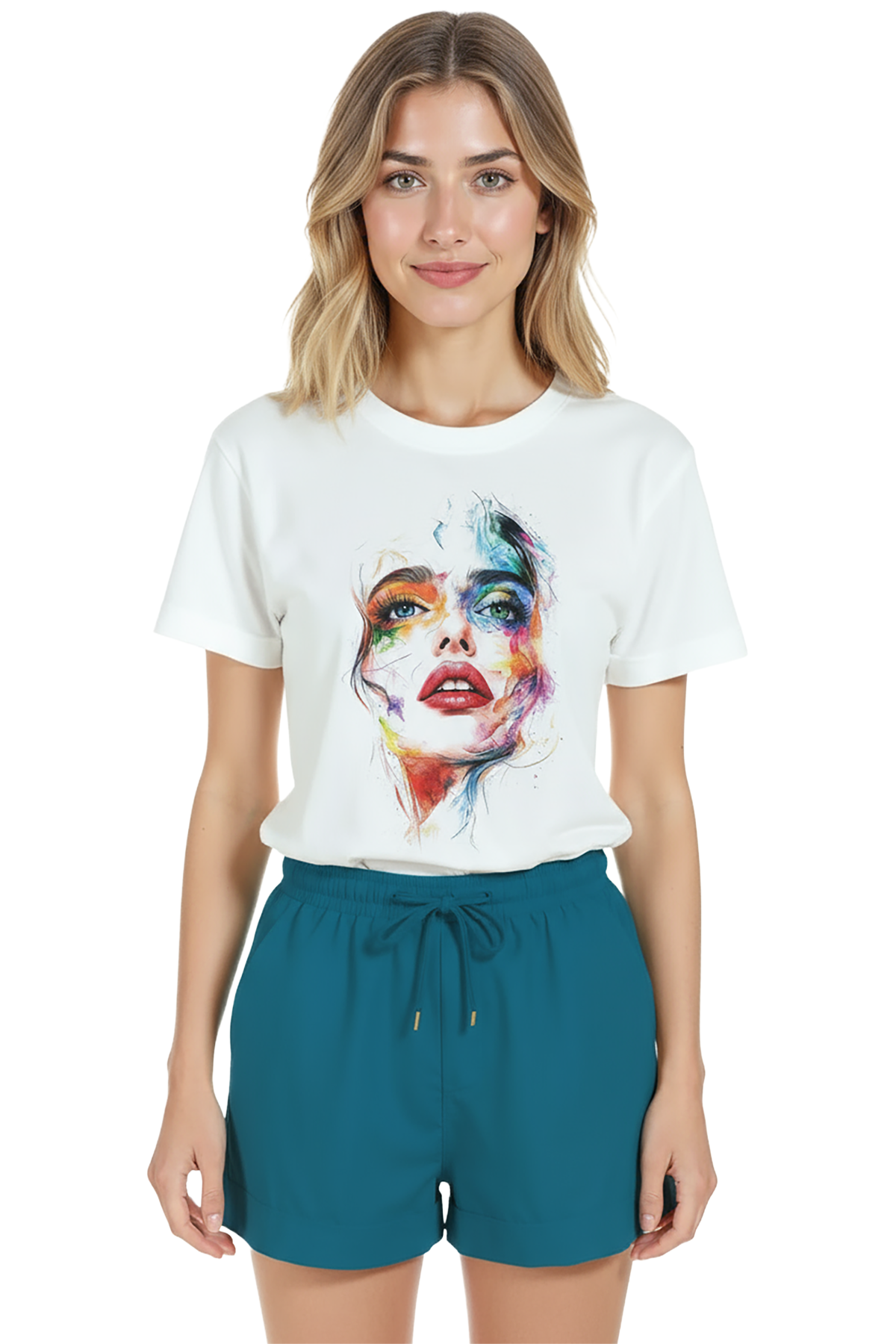 Kadın Beyaz Relaxed Fit %100 Pamuk Tişört – Renkli Suluboya Yüz Baskılı