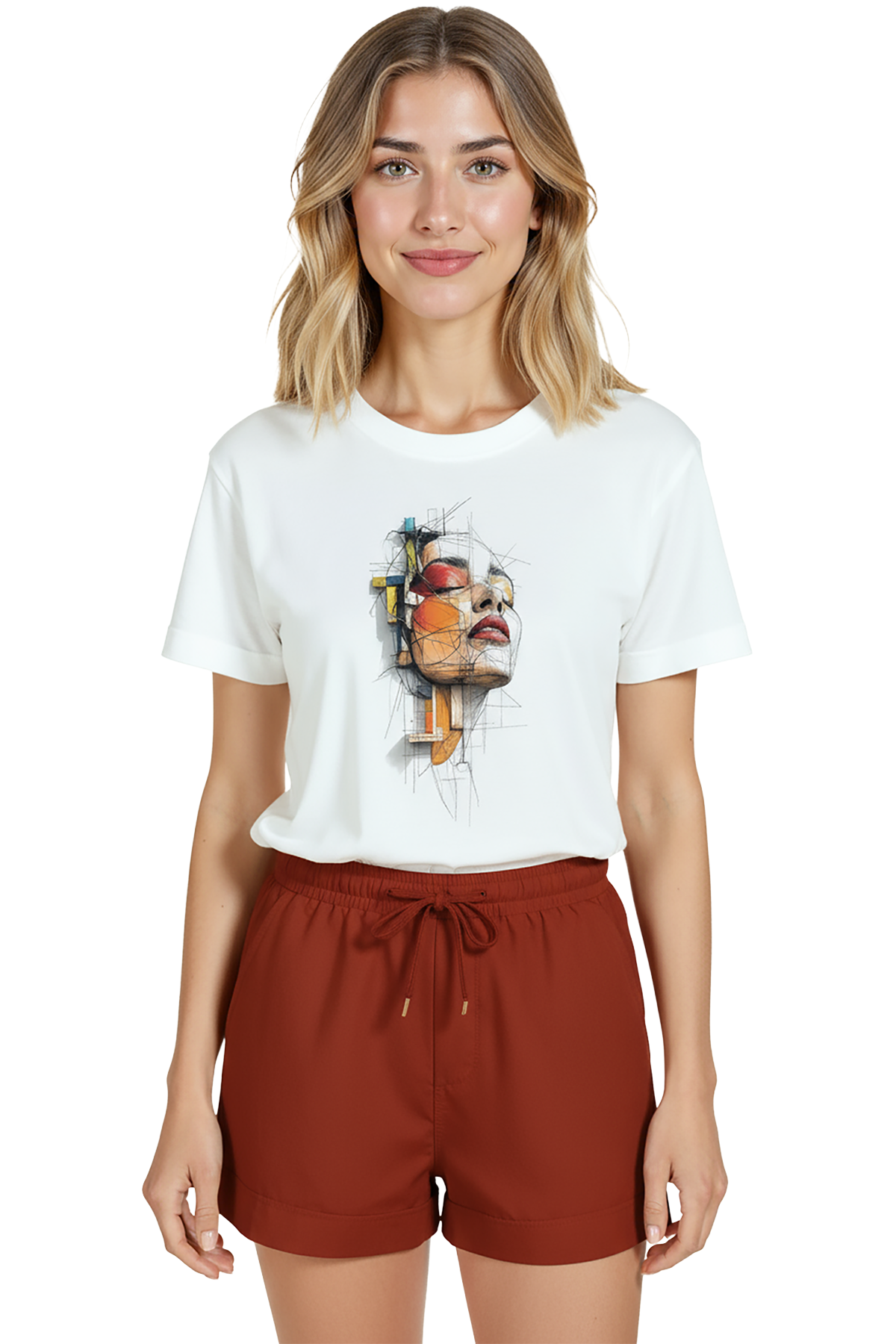 Kadın Beyaz Relaxed Fit %100 Pamuk Tişört – Soyut Çizgisel Portre & Renkli Geometri Baskılı