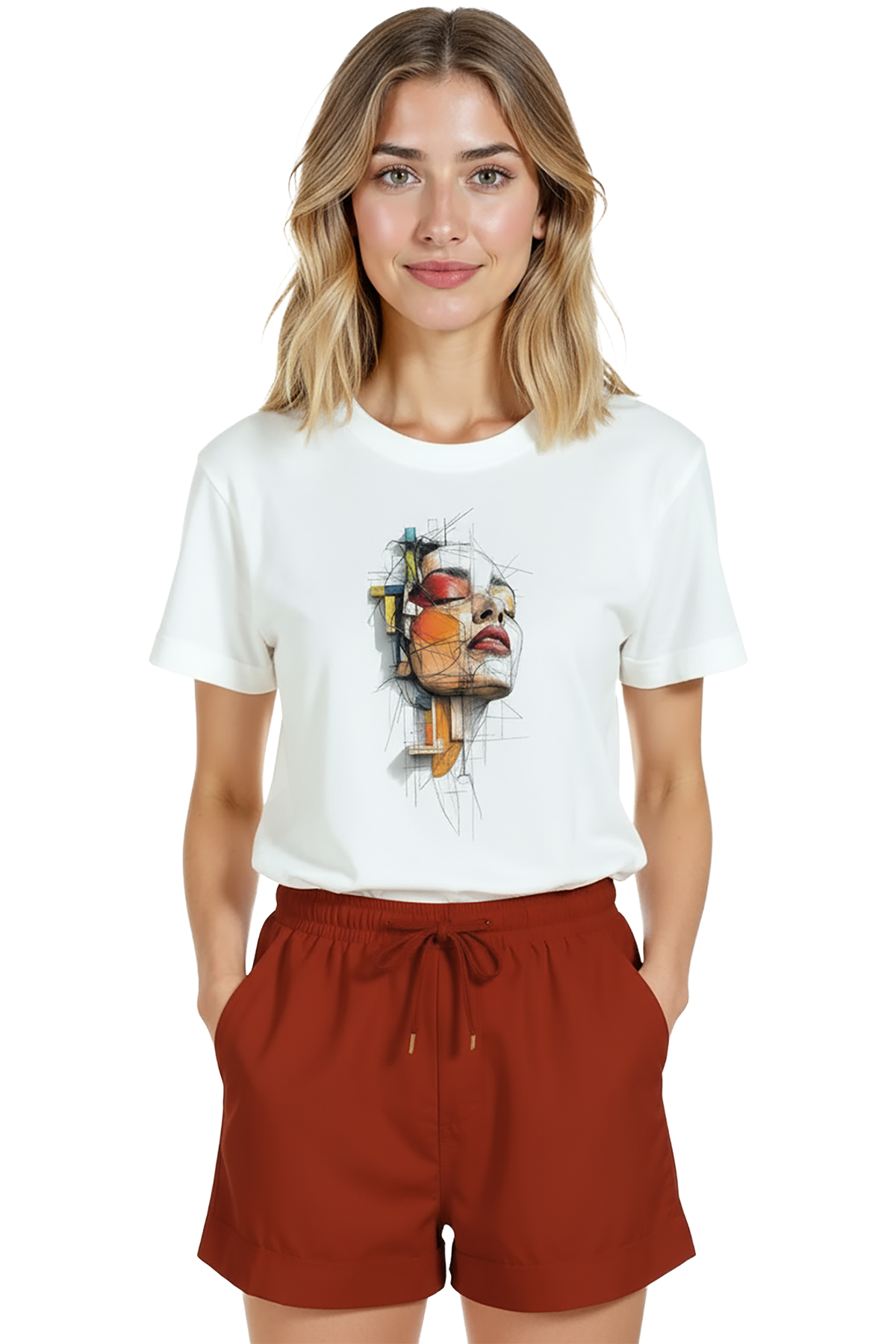 Sanat ve modern tasarımı bir arada sunan kadın tişörtü. Bu beyaz relaxed fit kadın tişört, ön göğüste yer alan çizgisel karakalem portre ve üzerine eklenen canlı suluboya/renk blokları ile dikkat çeker; yüz kompozisyonu ve geometrik dokular tasarıma çağdaş bir ifade katar. Ürün %100 pamuk kumaştan üretilmiş olup relaxed fit kadın kesim sayesinde gün boyu konfor, nefes alabilirlik ve rahat hareket sağlar. Baskı yüksek çözünürlüklü dijital baskı ile uygulanmış; mürekkep çizgileri ve renk geçişleri uzun süre korunur. Günlük şehir kombinleri, kafe‑stil ve smart‑casual kullanımlar için ideal, sanat odaklı gardıropların merkez parçası.