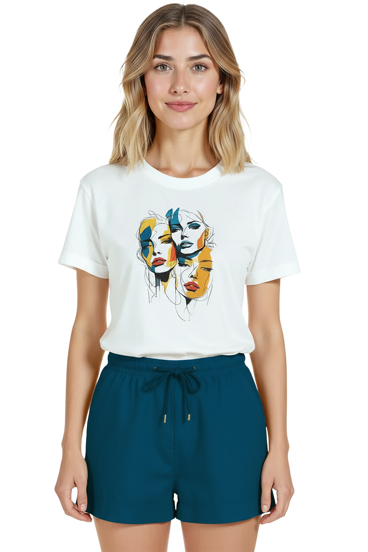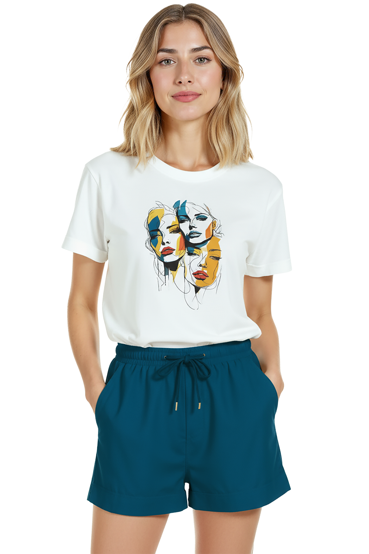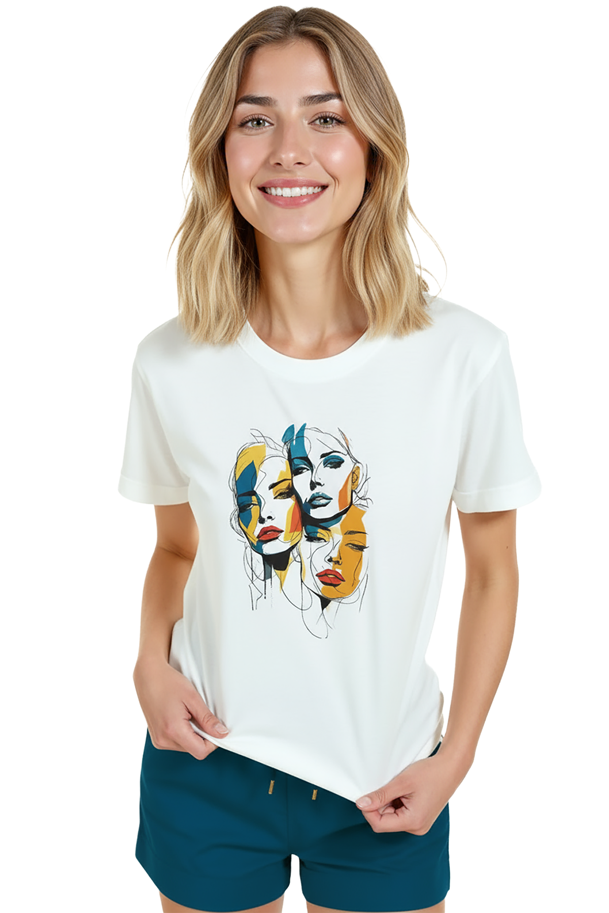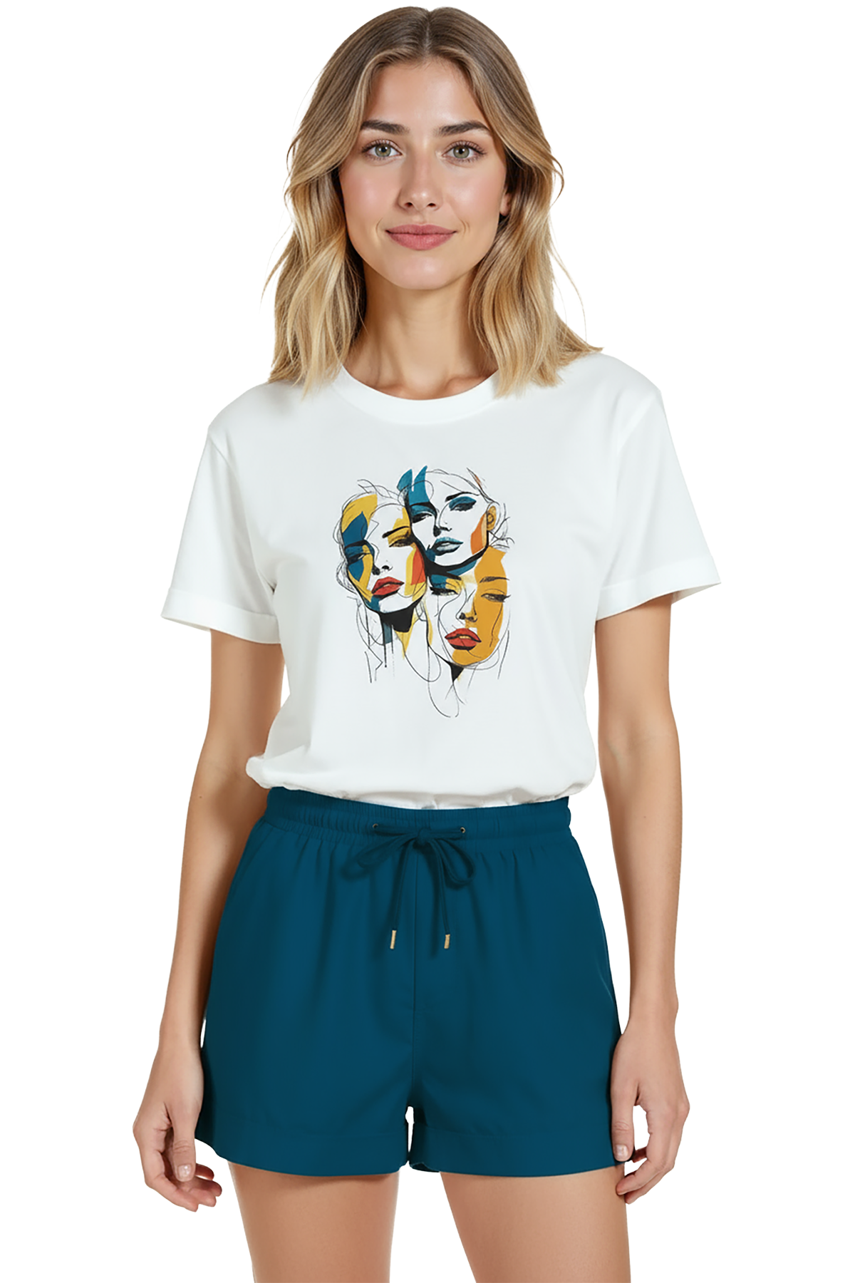 Minimal ve çağdaş bir sanat dokunuşu sunan kadın tişörtü. Bu beyaz relaxed fit kadın tişört, ön göğsünde yer alan çok renkli soyut yüzler illüstrasyonu (mürekkep çizgi + suluboya renk blokları) ile dikkat çeker. Ürün %100 pamuk kumaştan üretilmiştir ve relaxed fit kadın kesim sayesinde gün boyu konfor, nefes alabilirlik ve rahat hareket sağlar. Baskı yüksek çözünürlüklü dijital baskı ile uygulanmış; canlı renk geçişleri ve ince çizgi detayları uzun süre korunur. Günlük şehir kombinleri, kafe‑stil ve smart‑casual kullanımlar için modern ve ifade dolu bir parça.
