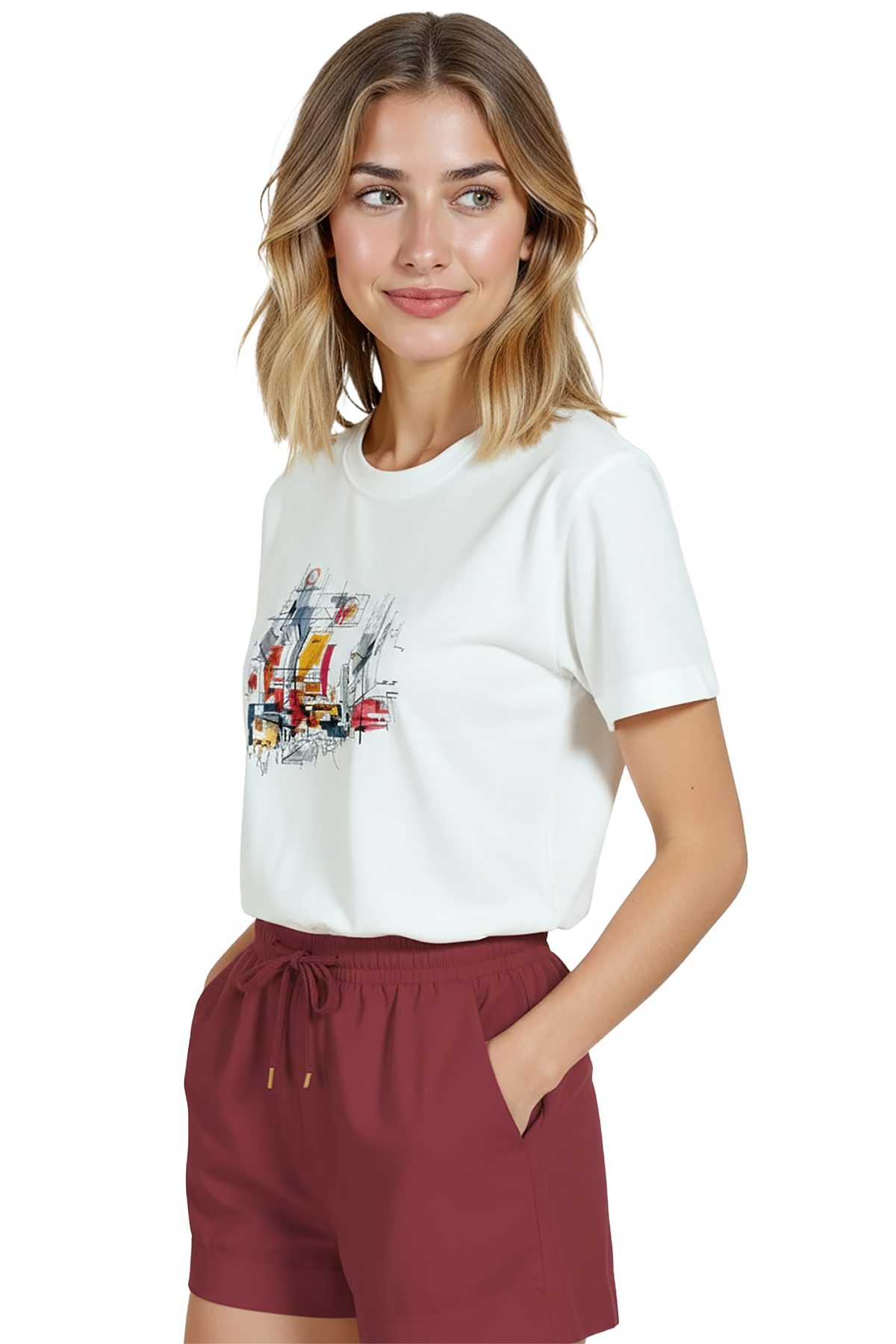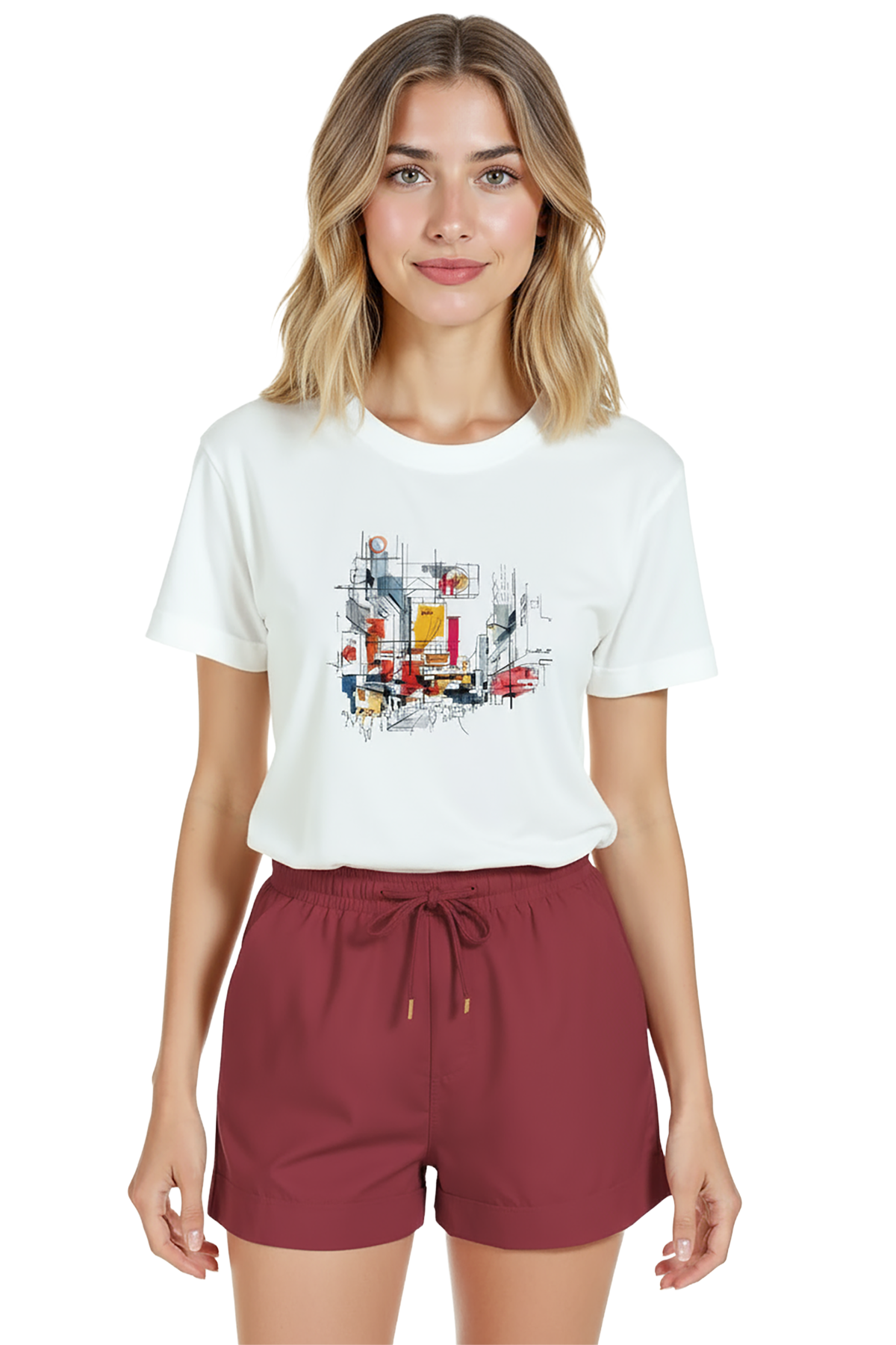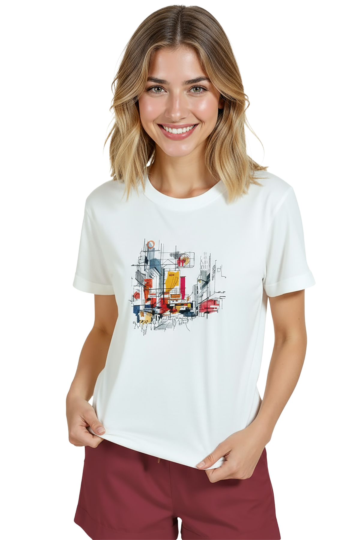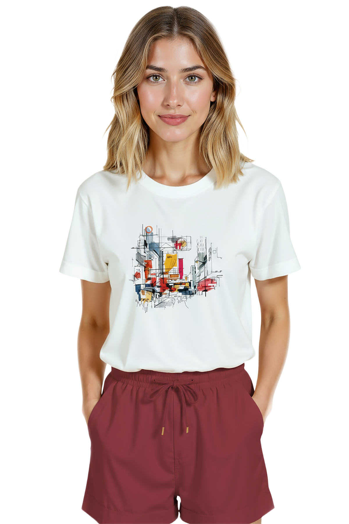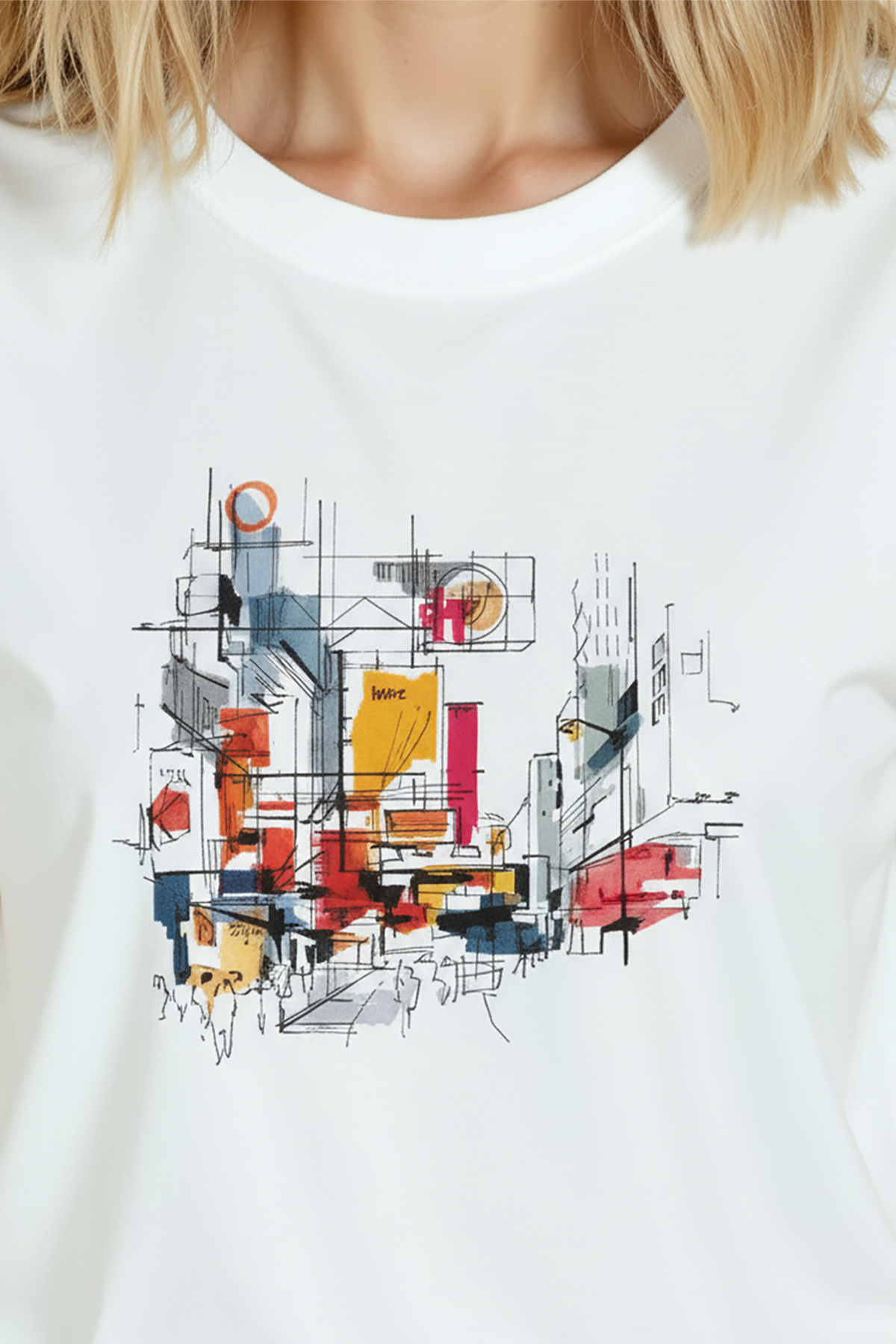 Minimal ve sanatsal bir şehir duygusu taşıyan kadın tişörtü. Bu beyaz relaxed fit kadın tişört, ön göğüste yer alan çizgisel mimari eskiz ve suluboya renk bloklarıyla oluşturulmuş şehir manzarası illüstrasyonu ile modern ve sofistike bir görünüm sağlar. Ürün %100 pamuk kumaştan üretilmiştir ve relaxed fit kadın kesim sayesinde gün boyu konfor, nefes alabilirlik ve rahat hareket sunar. Tasarım yüksek çözünürlüklü dijital baskı ile uygulanmış; ince mürekkep çizgileri ve canlı suluboya dokuları uzun süre net kalır. Günlük şehir kombinleri, kafe‑stil ve smart‑casual kullanımlar için ideal, minimal ama dikkat çekici bir parça.